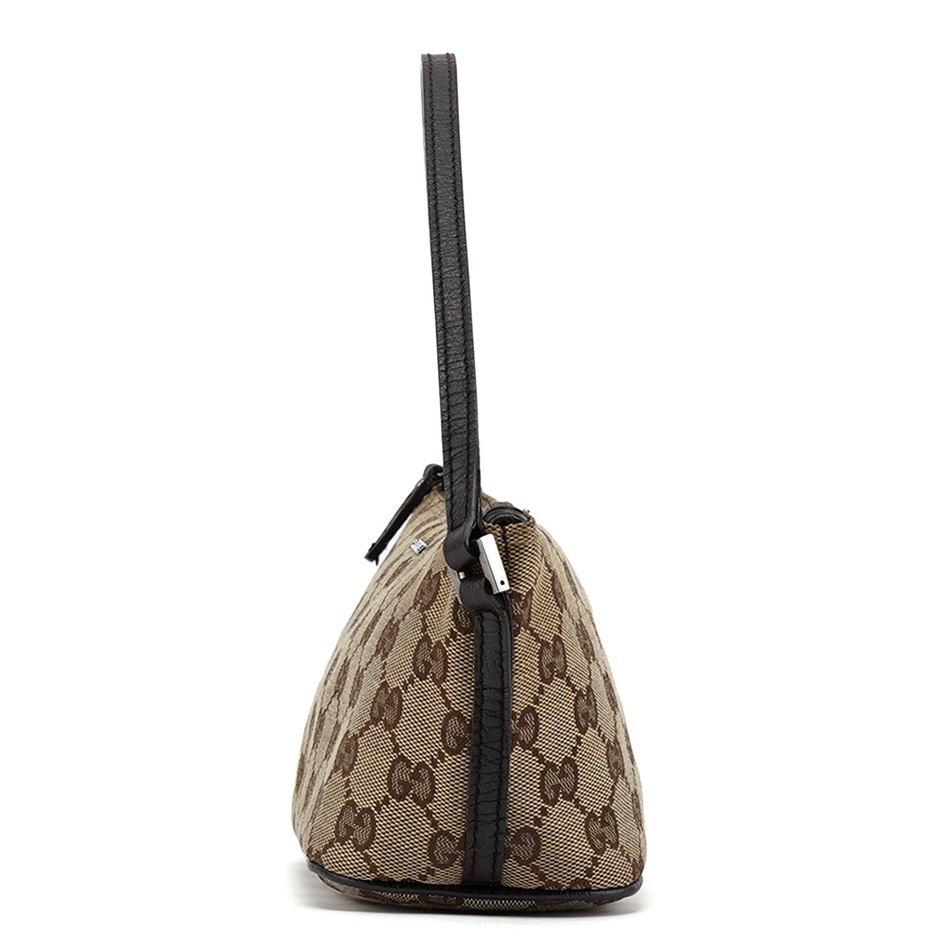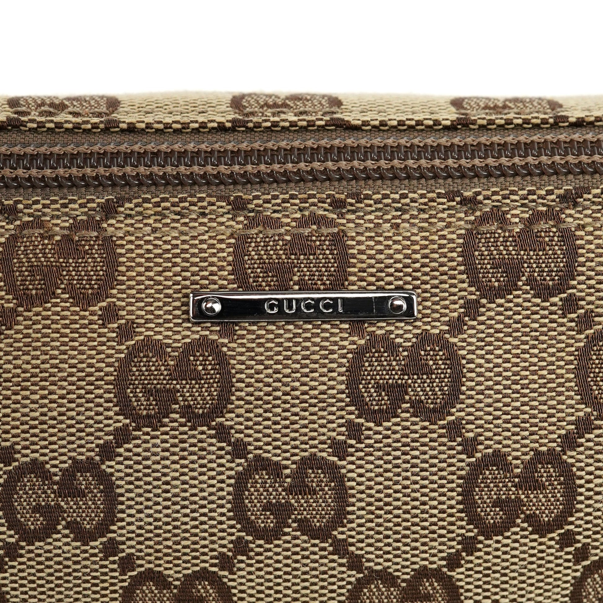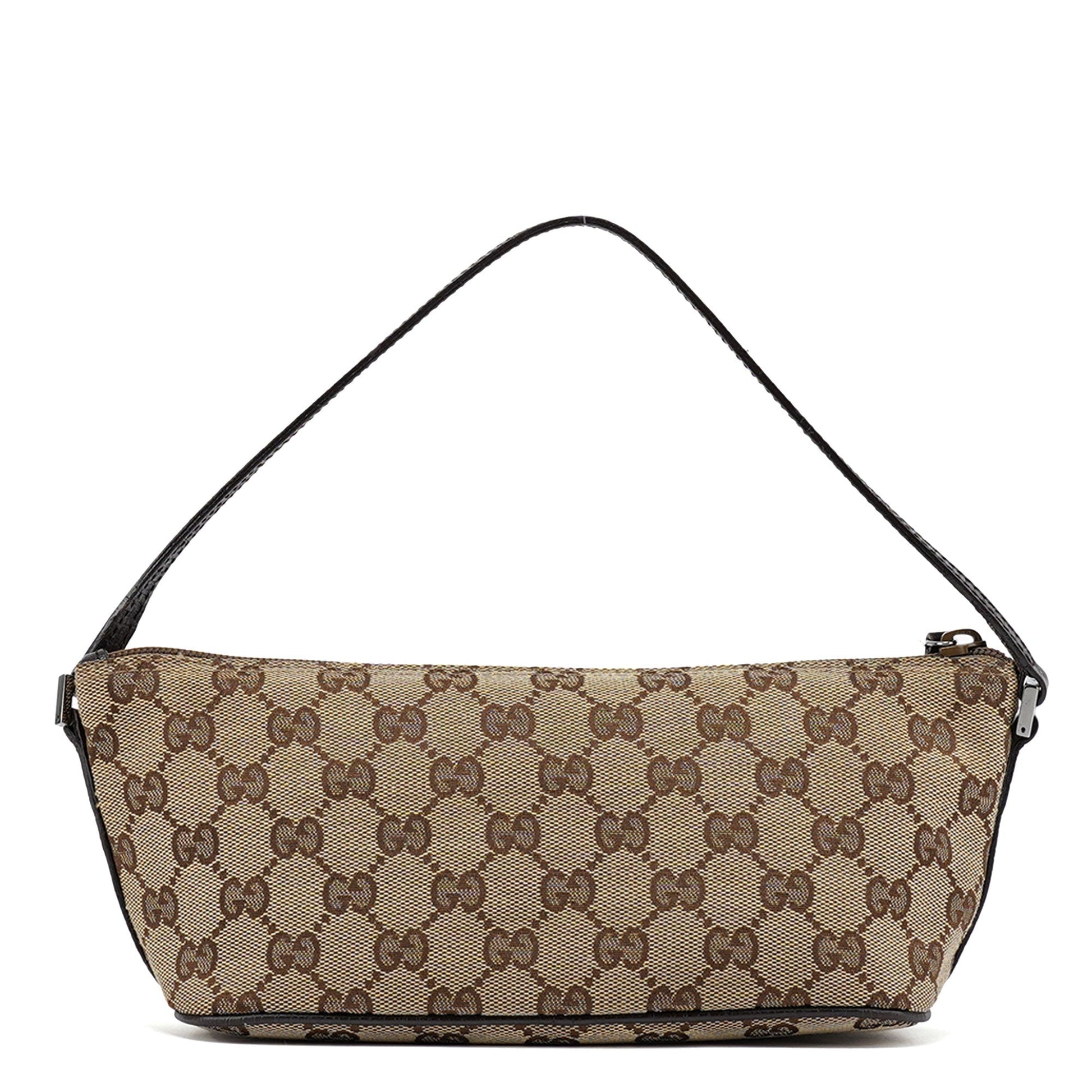 Explore timeless elegance with the Gucci GG Boat Pochette by Tom Ford, circa late 1990s. This exquisite piece combines beige GG canvas with brown leather trim and silver-tone hardware. Its secure zip closure and satin-lined interior offers luxury and practicality, while the subtle Gucci plaque adds a touch of heritage.