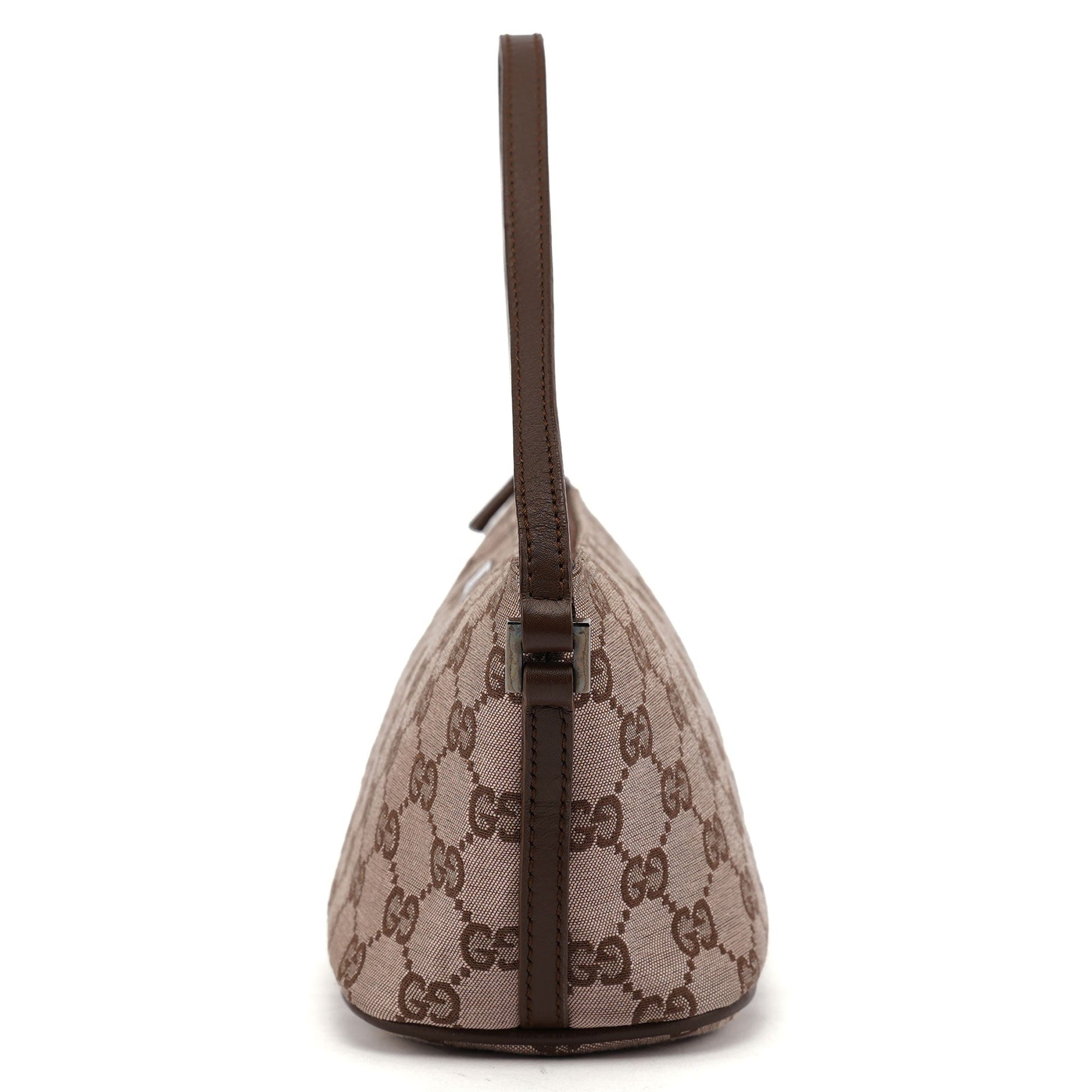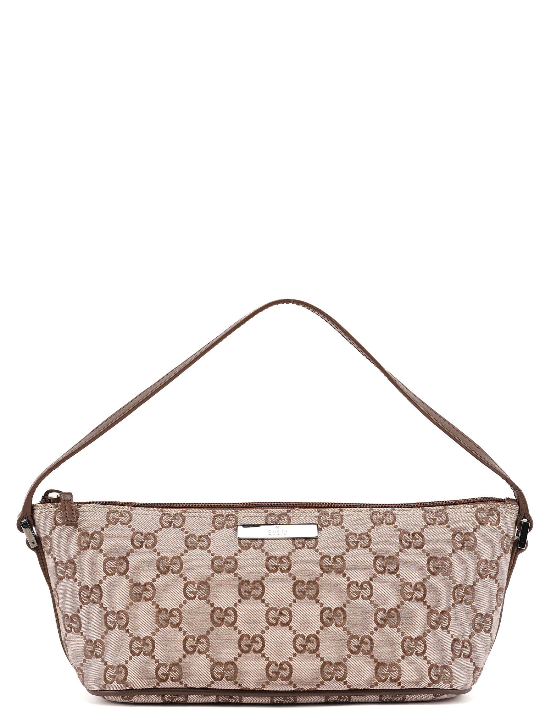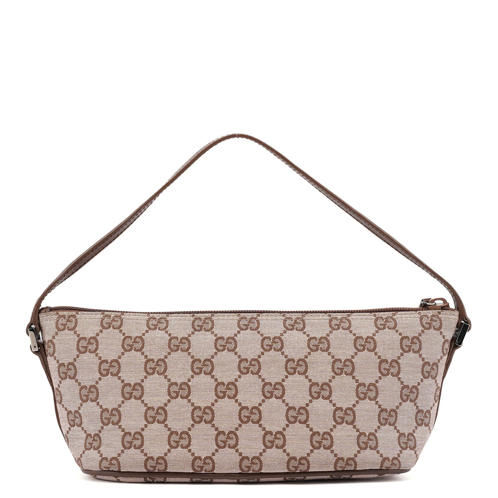 Explore timeless elegance with the Gucci GG Boat Pochette by Tom Ford, circa late 1990s. This exquisite piece combines beige GG canvas with brown leather trim and silver-tone hardware. Its secure zip closure and satin-lined interior offers luxury and practicality, while the subtle Gucci plaque adds a touch of heritage.