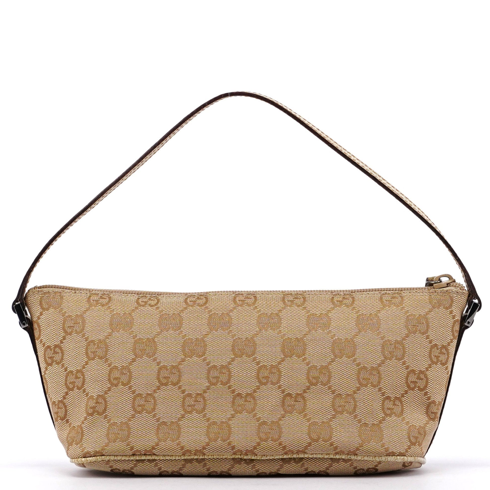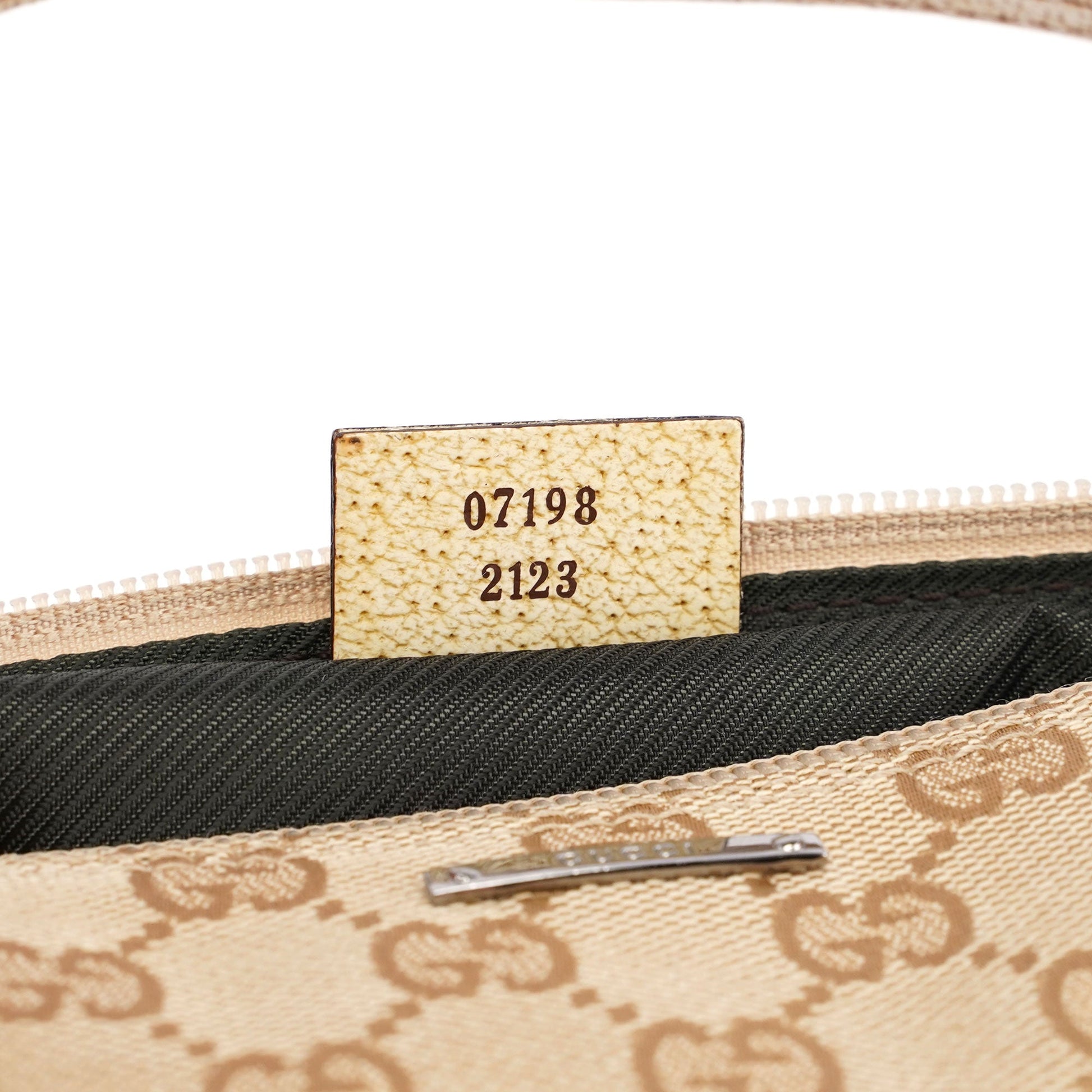 Explore timeless elegance with the Gucci GG Boat Pochette by Tom Ford, circa late 1990s. This exquisite piece combines beige GG canvas with beige leather trim and silver-tone hardware. Its secure zip closure and satin-lined interior offer luxury and practicality, while the subtle Gucci plaque adds a touch of heritage. A perfect blend of vintage charm and sophistication.