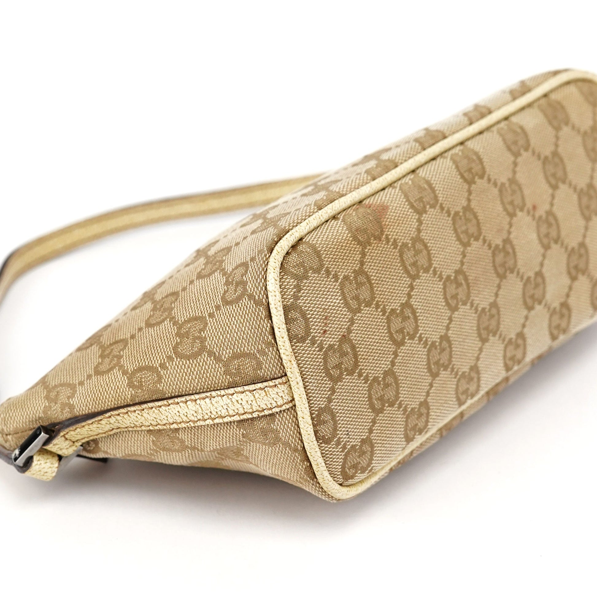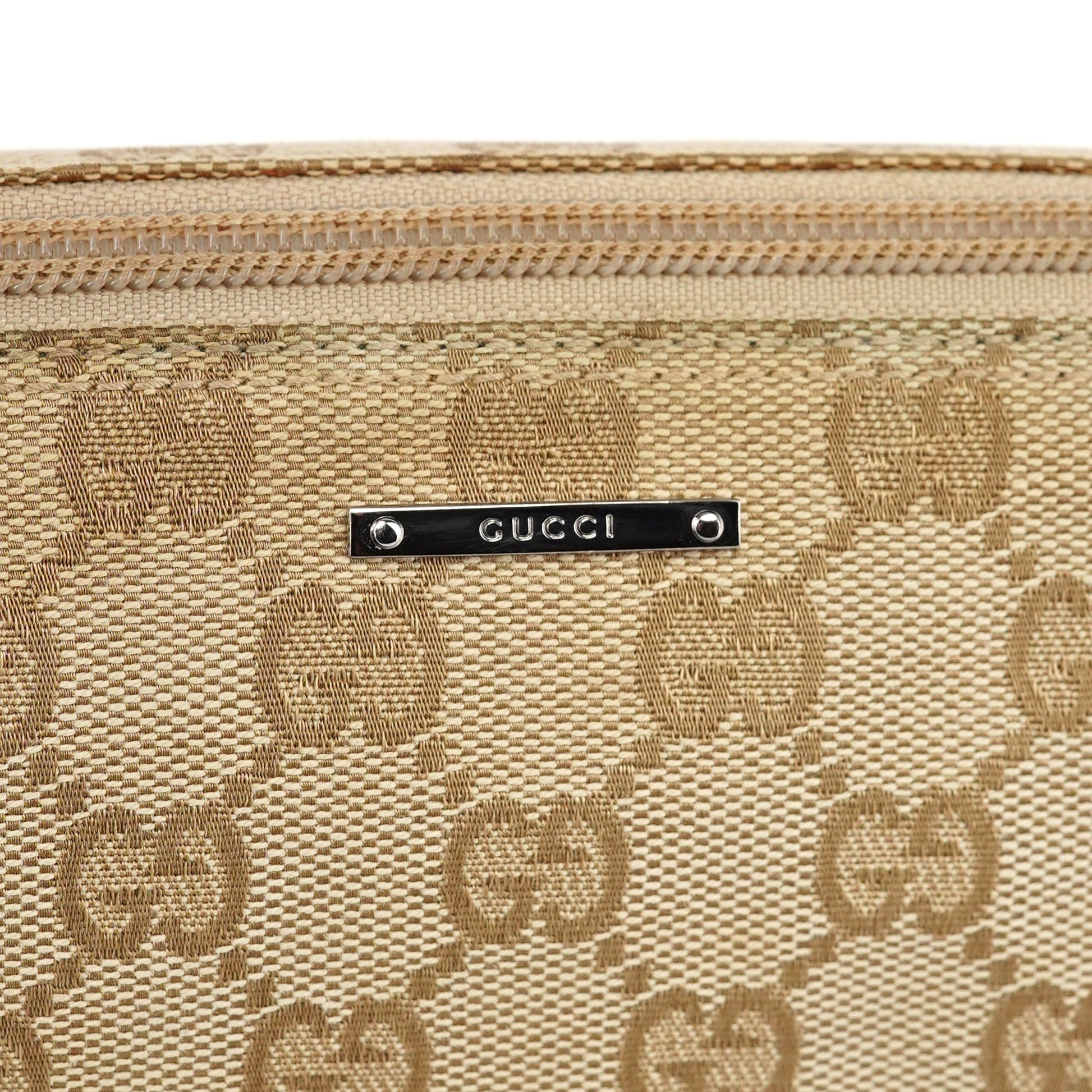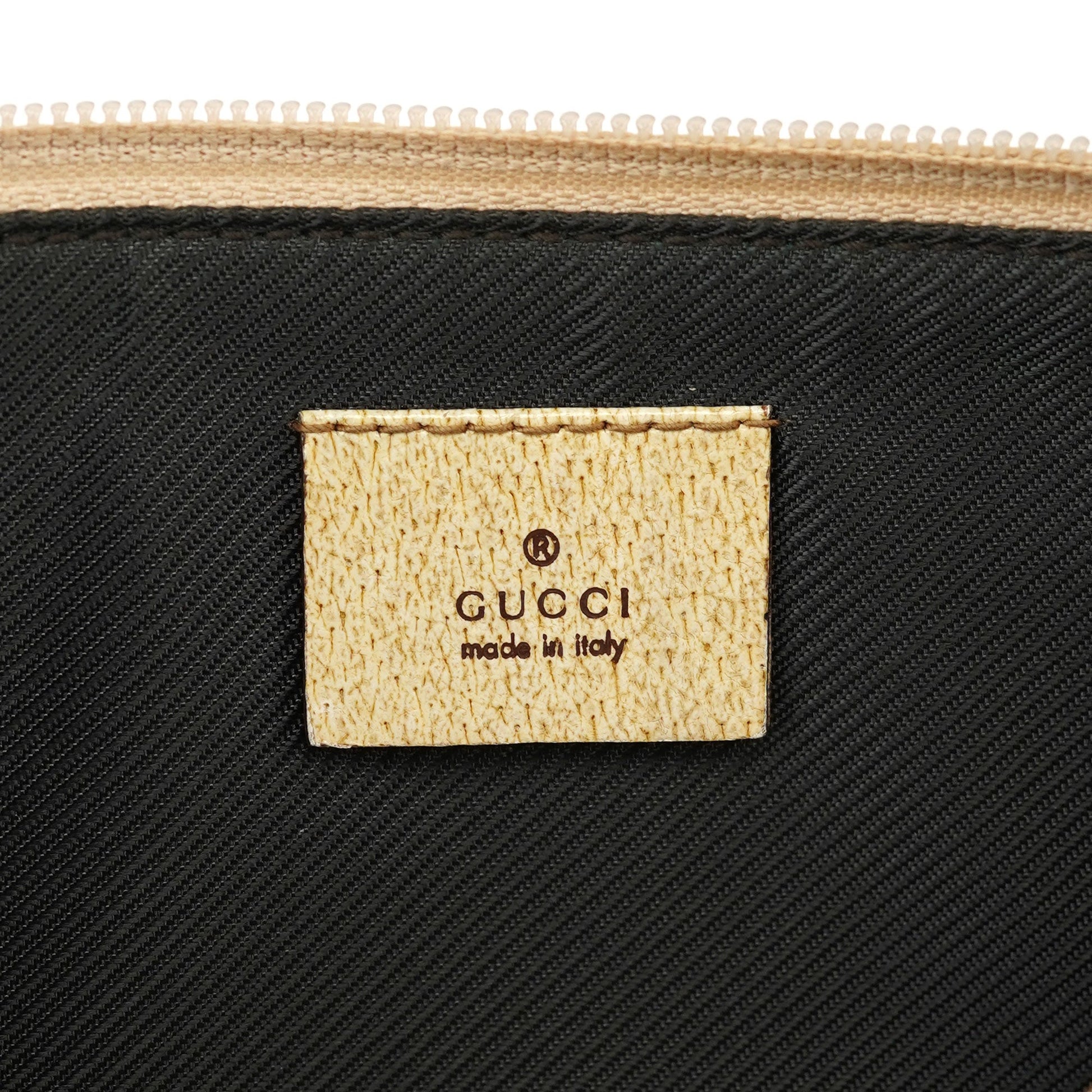 Explore timeless elegance with the Gucci GG Boat Pochette by Tom Ford, circa late 1990s. This exquisite piece combines beige GG canvas with beige leather trim and silver-tone hardware. Its secure zip closure and satin-lined interior offer luxury and practicality, while the subtle Gucci plaque adds a touch of heritage. A perfect blend of vintage charm and sophistication.