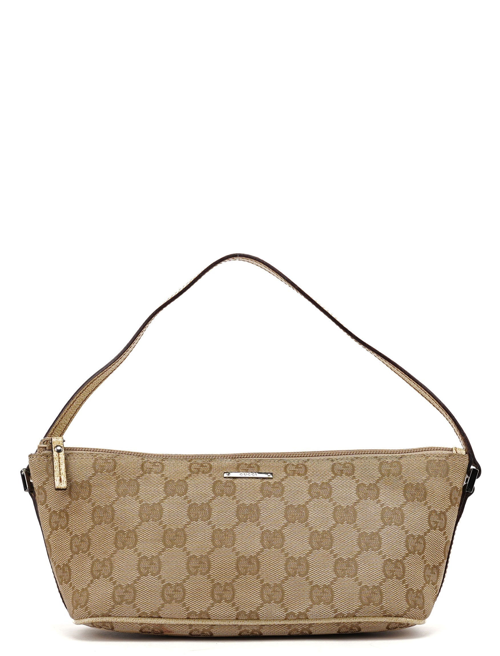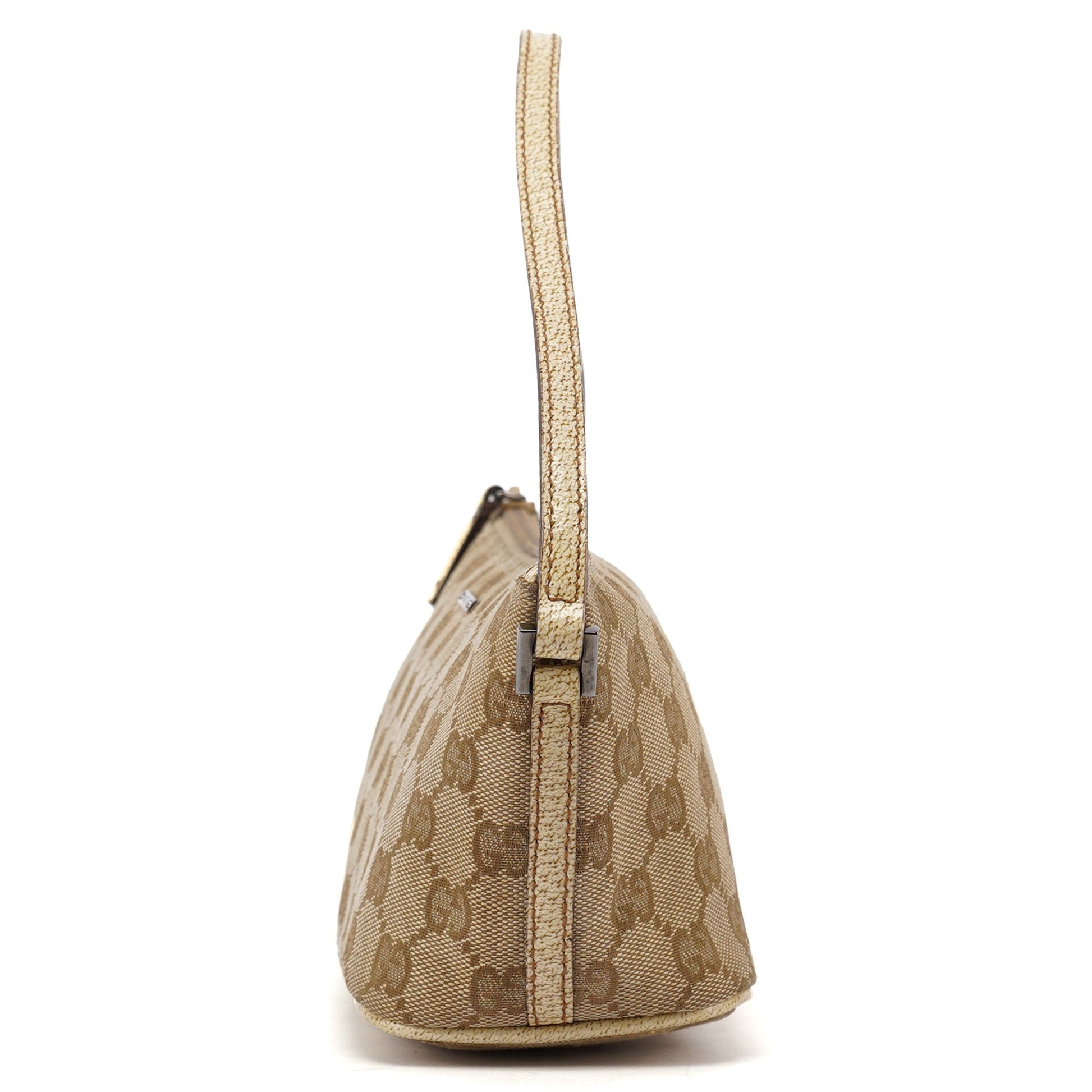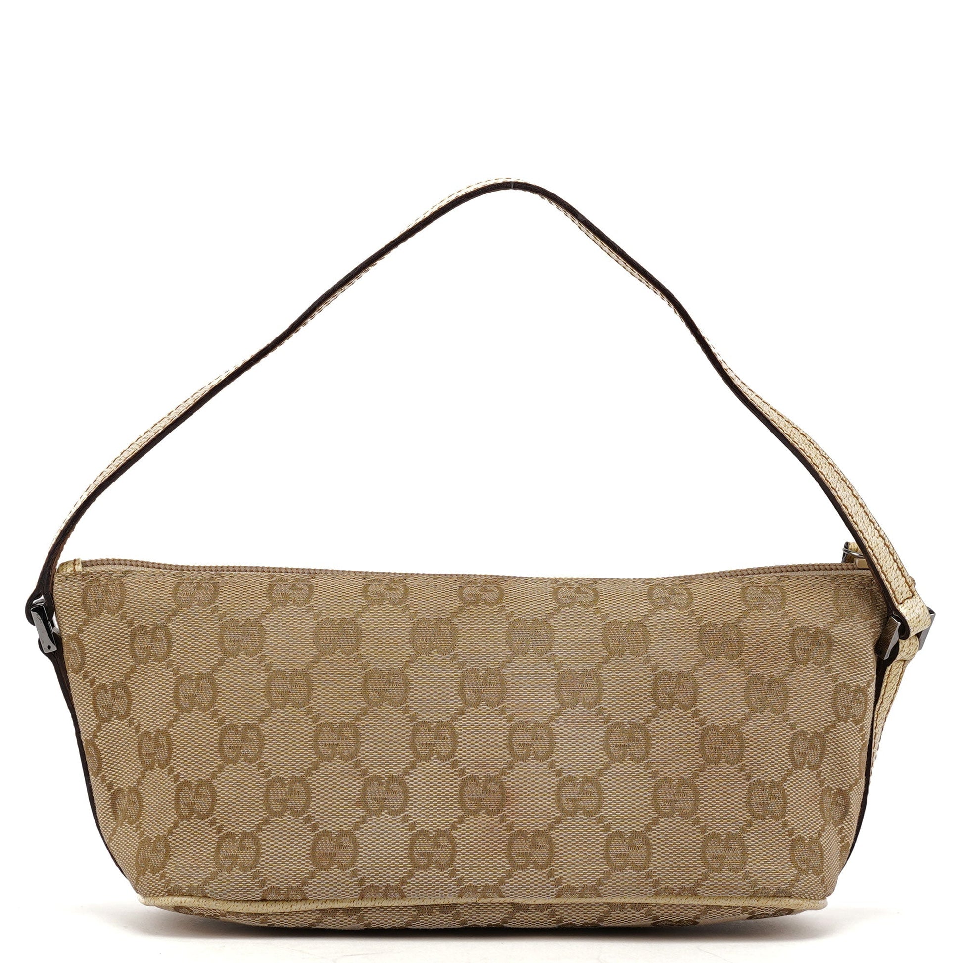 Explore timeless elegance with the Gucci GG Boat Pochette by Tom Ford, circa late 1990s. This exquisite piece combines beige GG canvas with beige leather trim and silver-tone hardware. Its secure zip closure and satin-lined interior offer luxury and practicality, while the subtle Gucci plaque adds a touch of heritage. A perfect blend of vintage charm and sophistication.