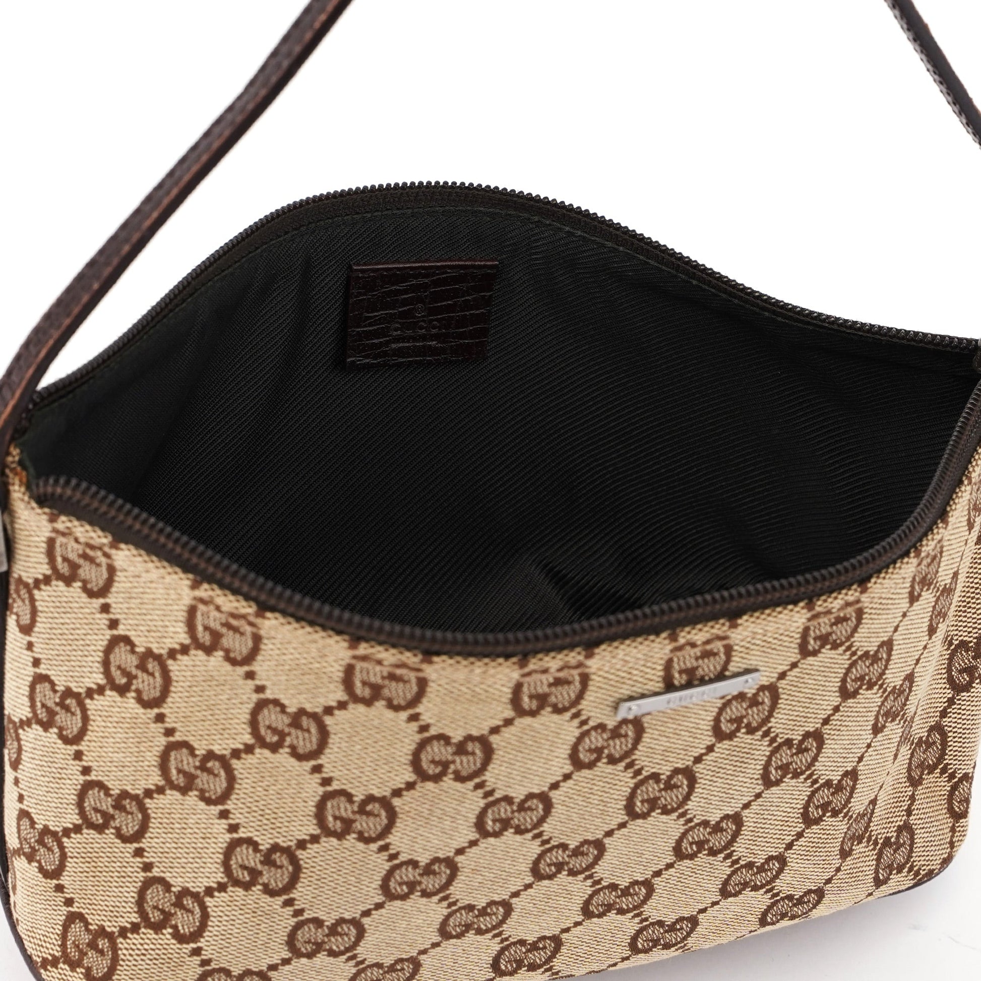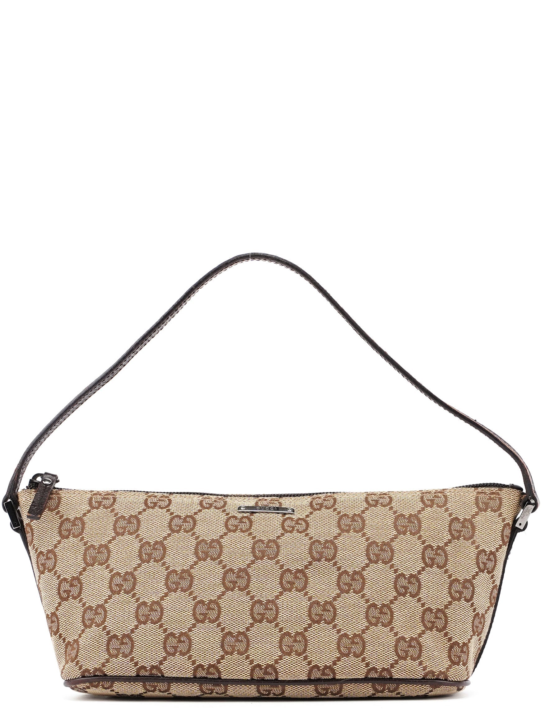 Explore timeless elegance with the Gucci GG Boat Pochette by Tom Ford, circa late 1990s. This exquisite piece combines beige GG canvas with brown leather trim and silver-tone hardware. Its secure zip closure and satin-lined interior offer luxury and practicality, while the subtle Gucci plaque adds a touch of heritage. A perfect blend of vintage charm and sophistication.