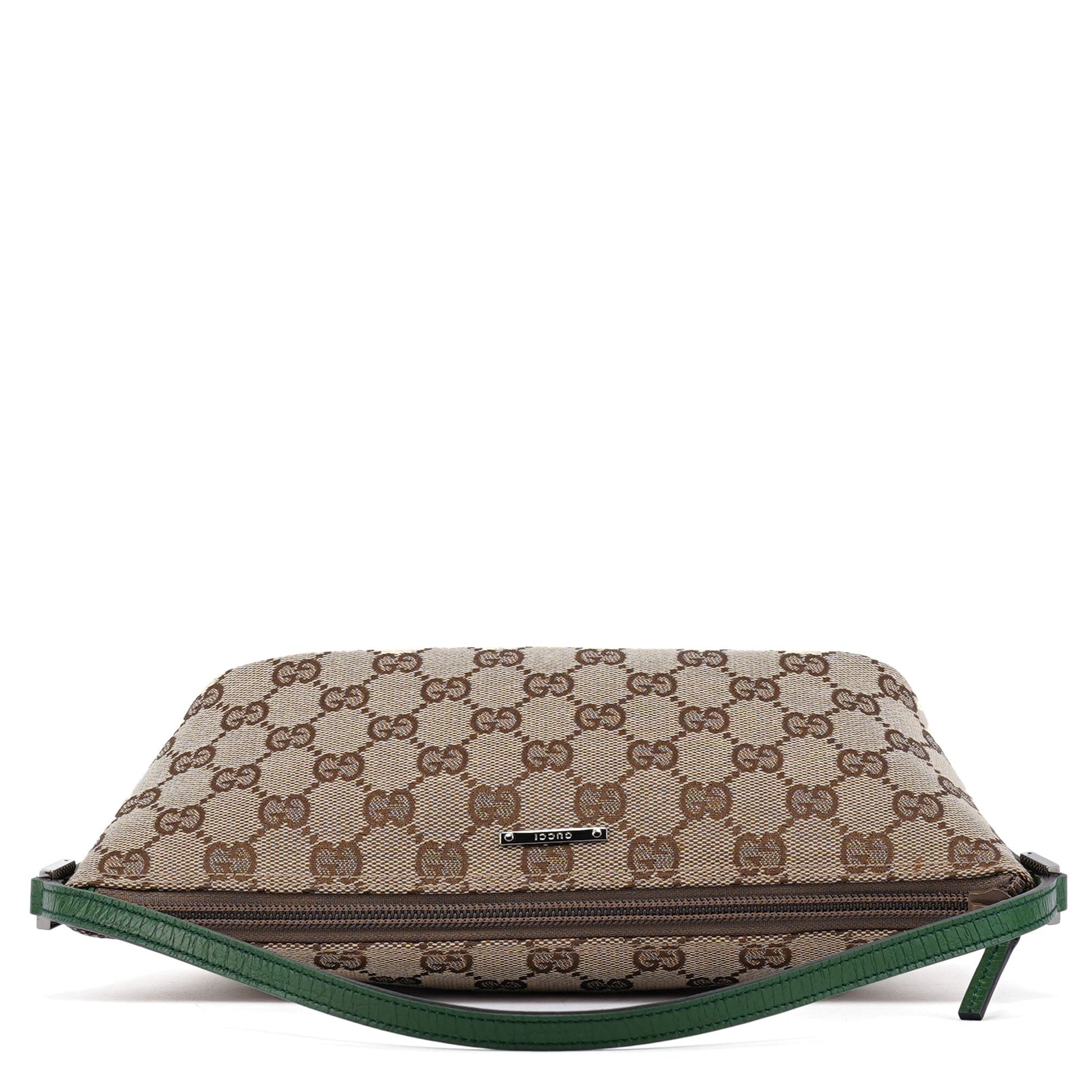 Explore timeless elegance with the Gucci GG Boat Pochette by Tom Ford, circa late 1990s. This exquisite piece combines beige GG canvas with green leather trim and silver-tone hardware. Its secure zip closure and satin-lined interior offer luxury and practicality, while the subtle Gucci plaque adds a touch of heritage. A perfect blend of vintage charm and sophistication.
