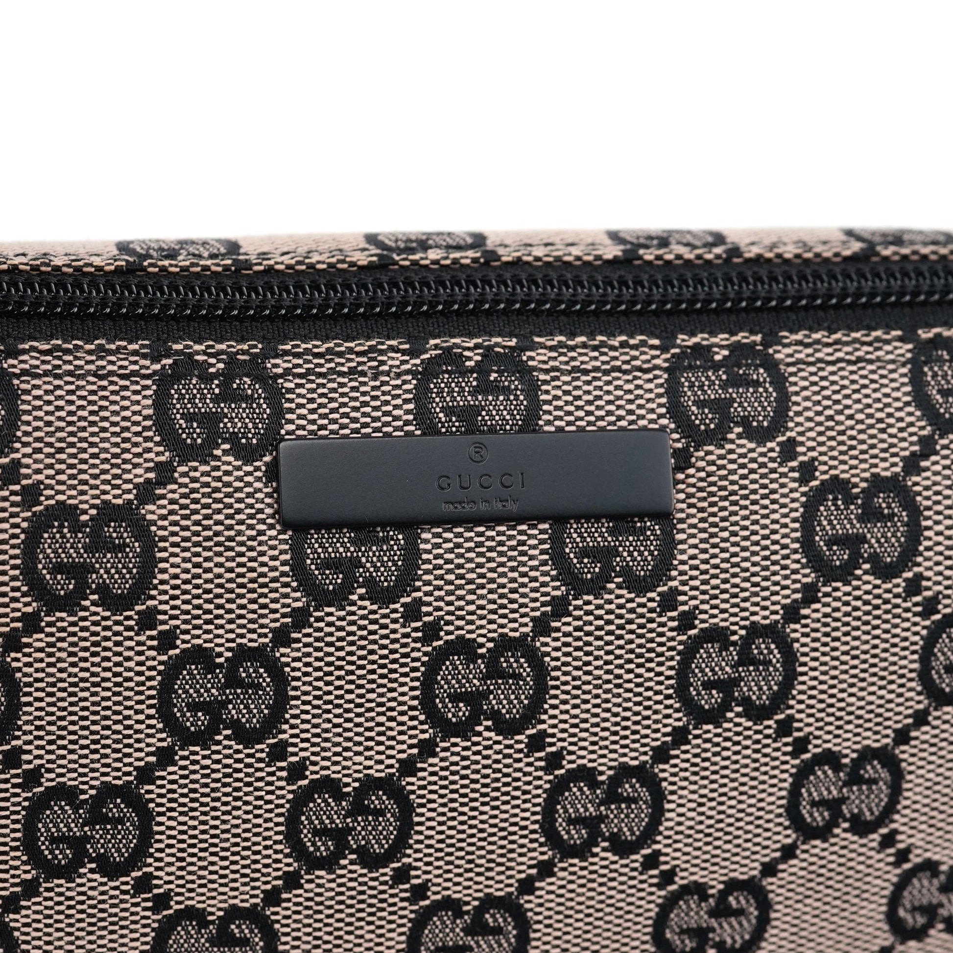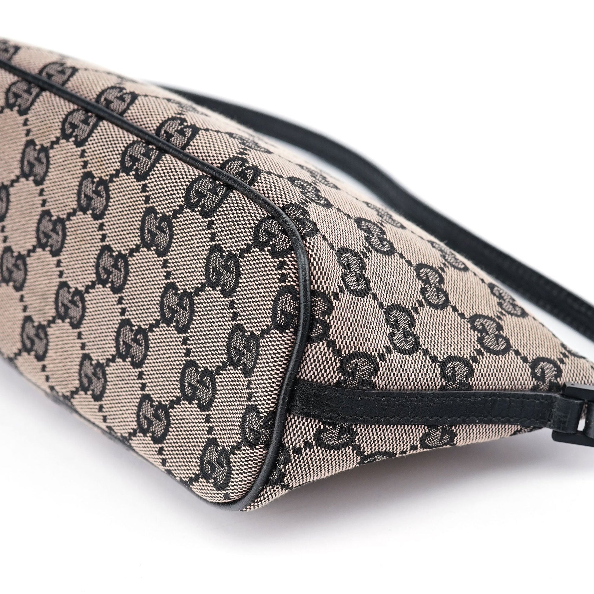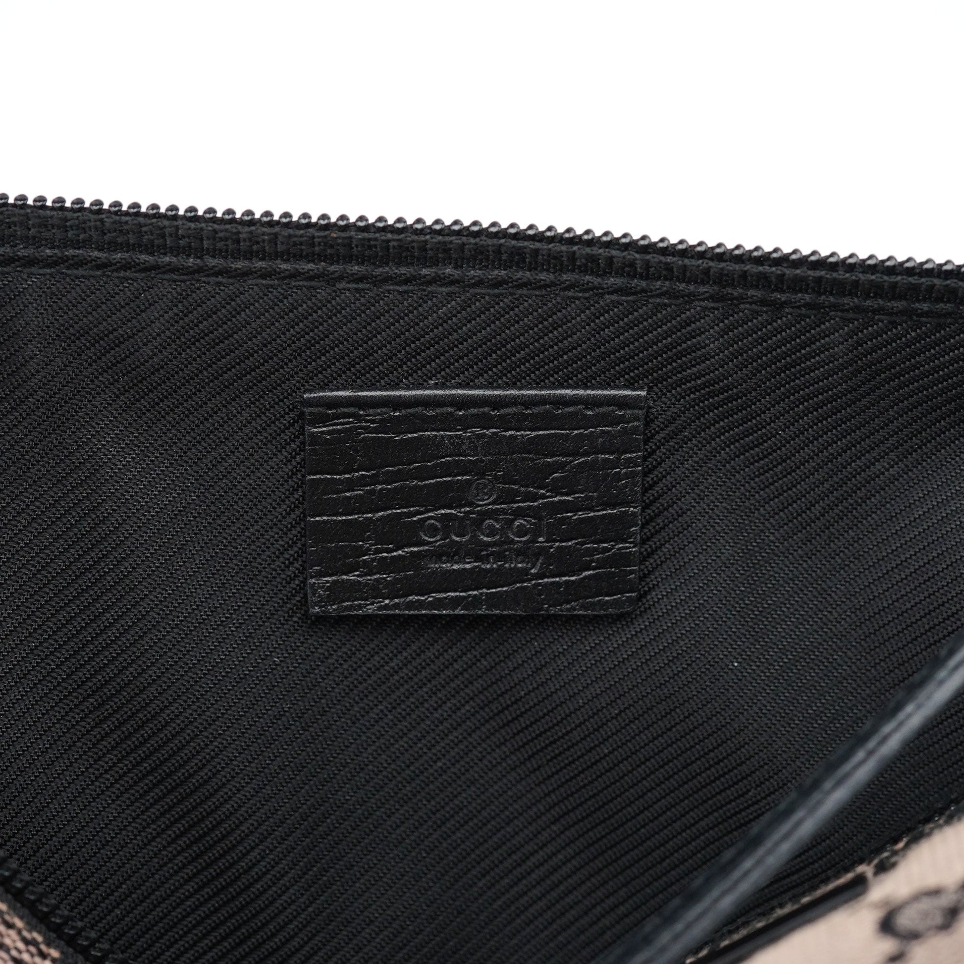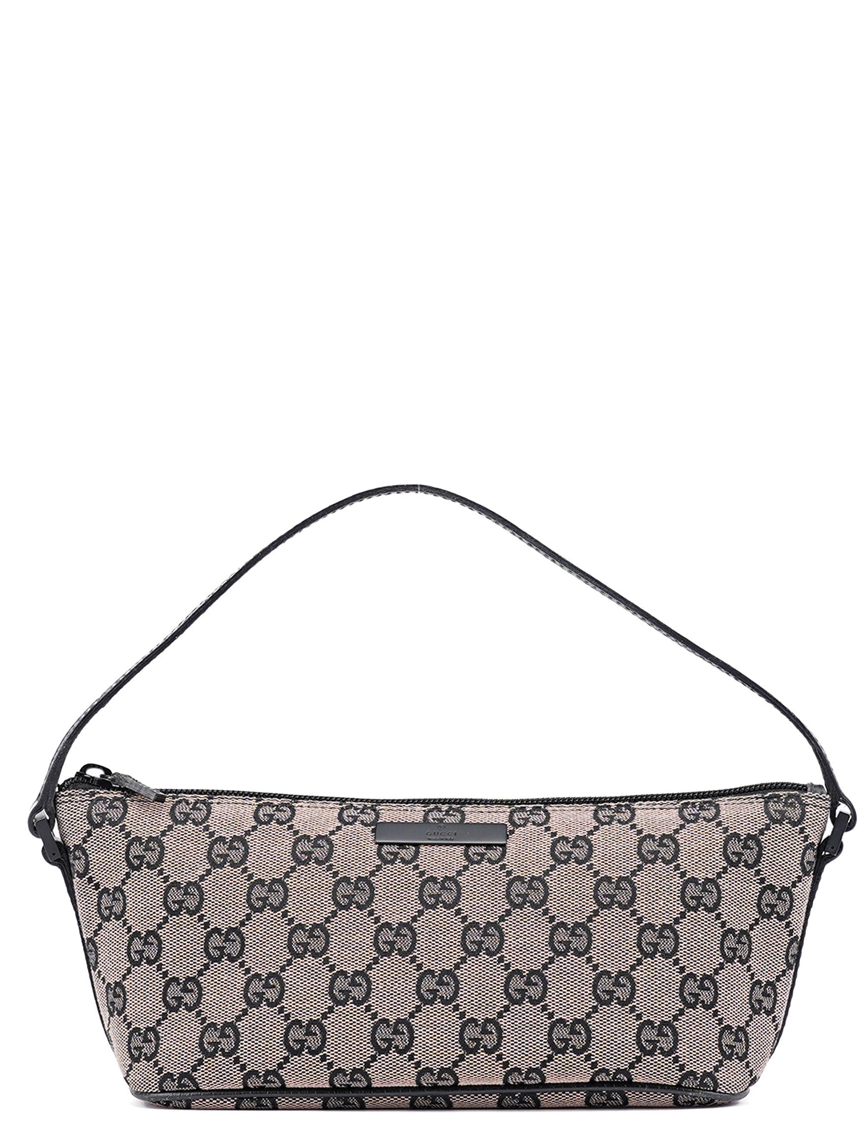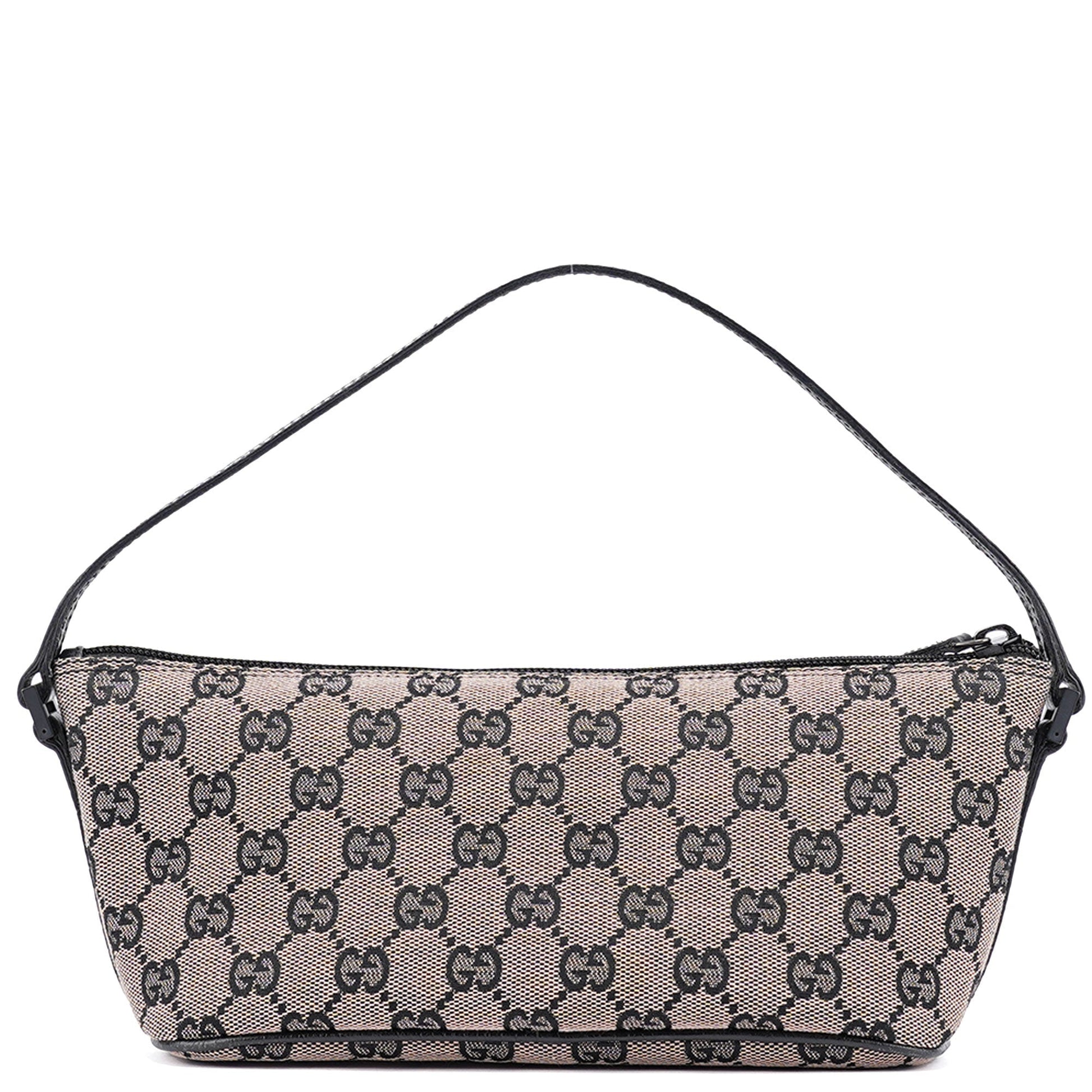 Designed by Tom Ford in the late 1990s, the Gucci GG Boat Pochette blends beige GG canvas with black leather trim and matte black hardware. A secure zipper closure opens to a satin-lined interior, offering both luxury and practicality. A subtle Gucci plaque adds a signature finishing touch.