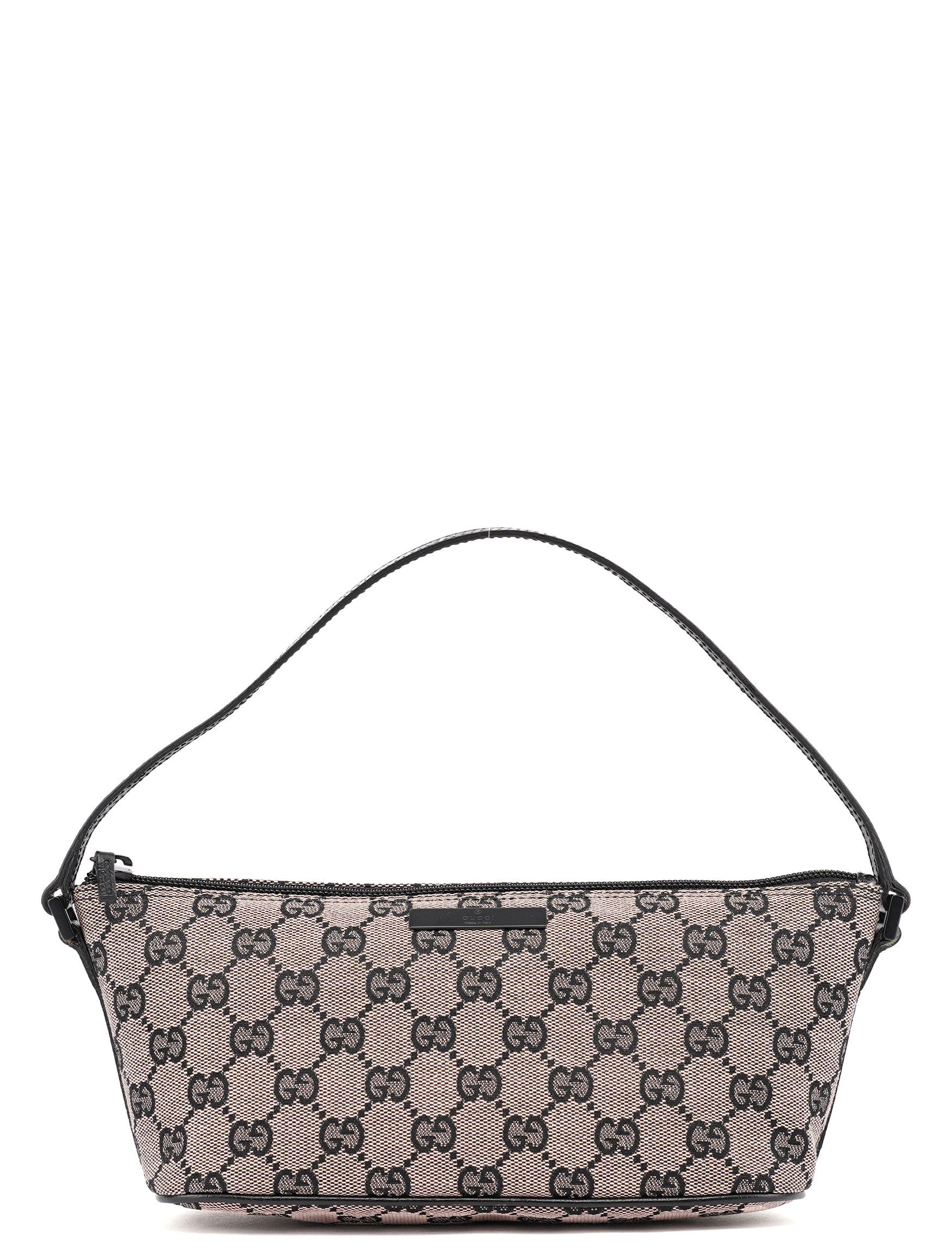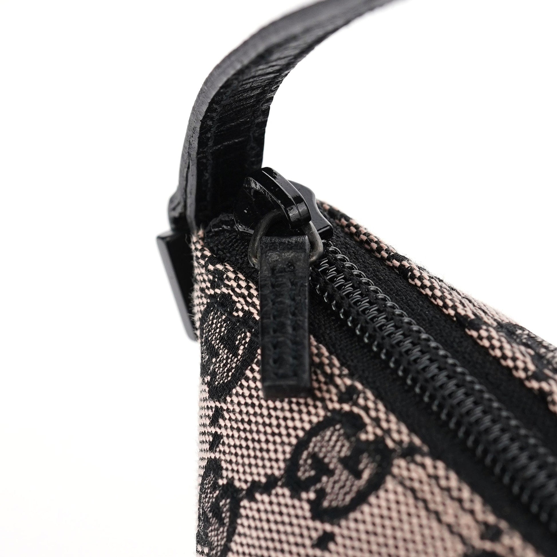 Explore timeless elegance with the Gucci GG Boat Pochette by Tom Ford, circa late 1990s. This exquisite piece combines beige GG canvas with black leather trim and matte black hardware. Its secure zip closure and satin-lined interior offer luxury and practicality, while the subtle Gucci plaque adds a touch of heritage.