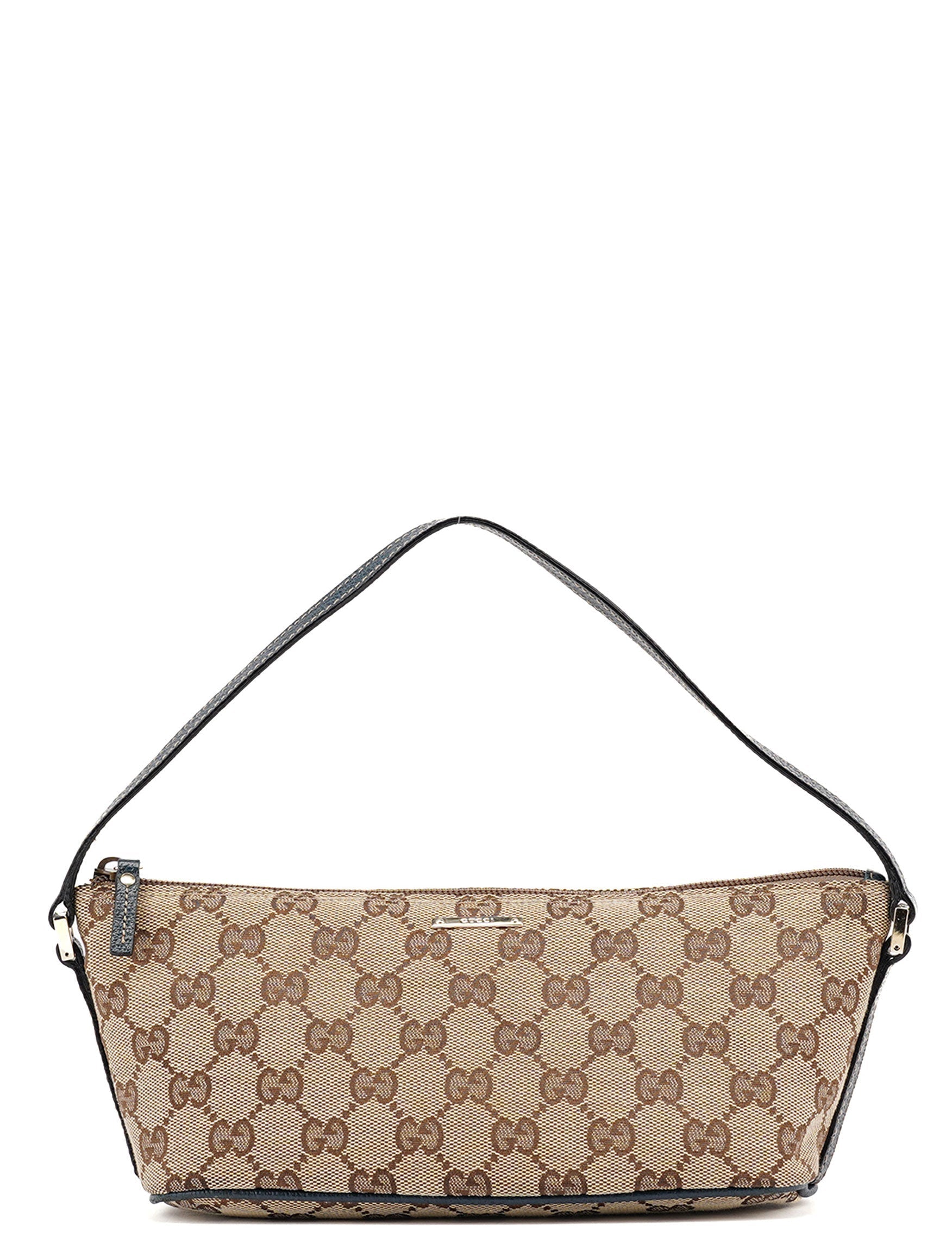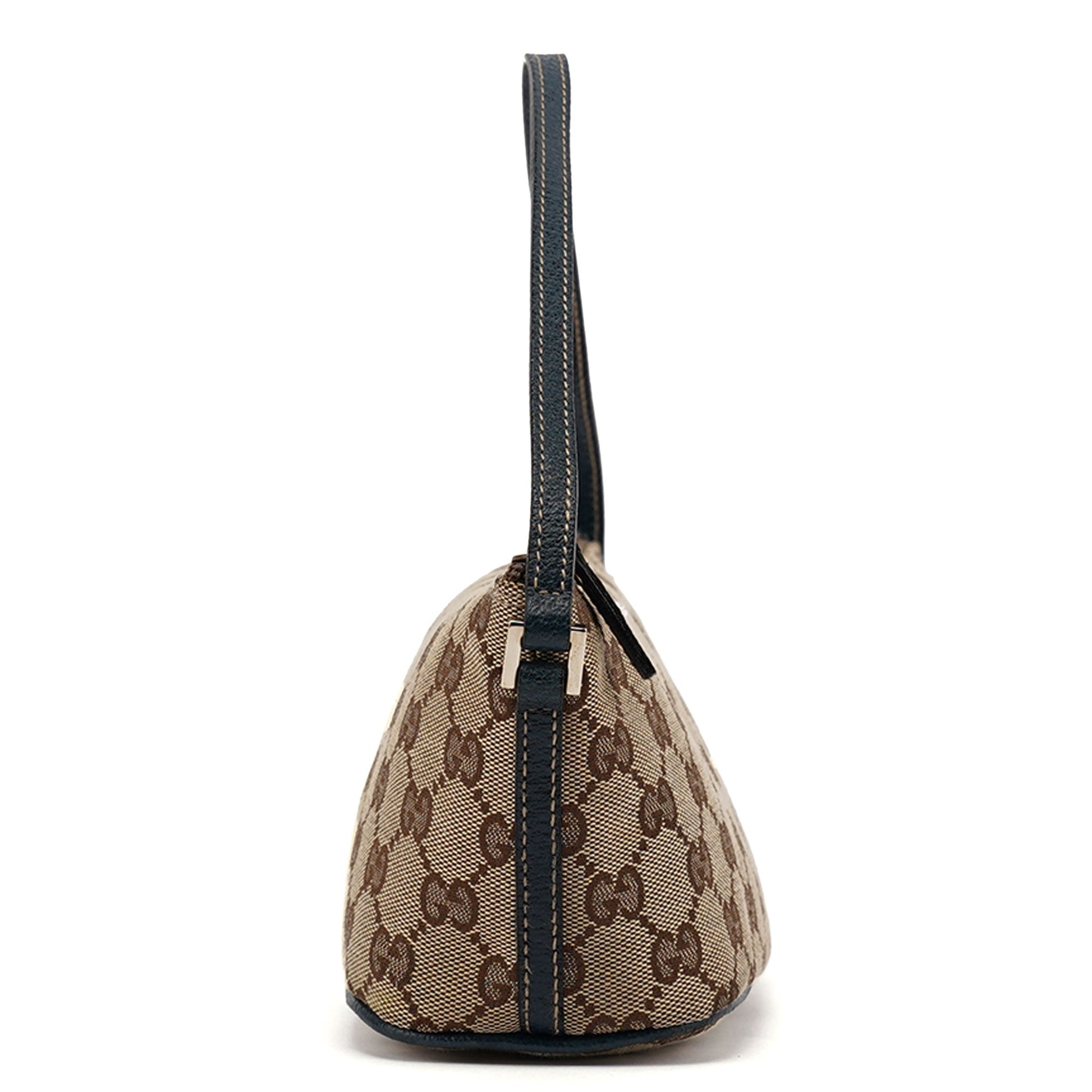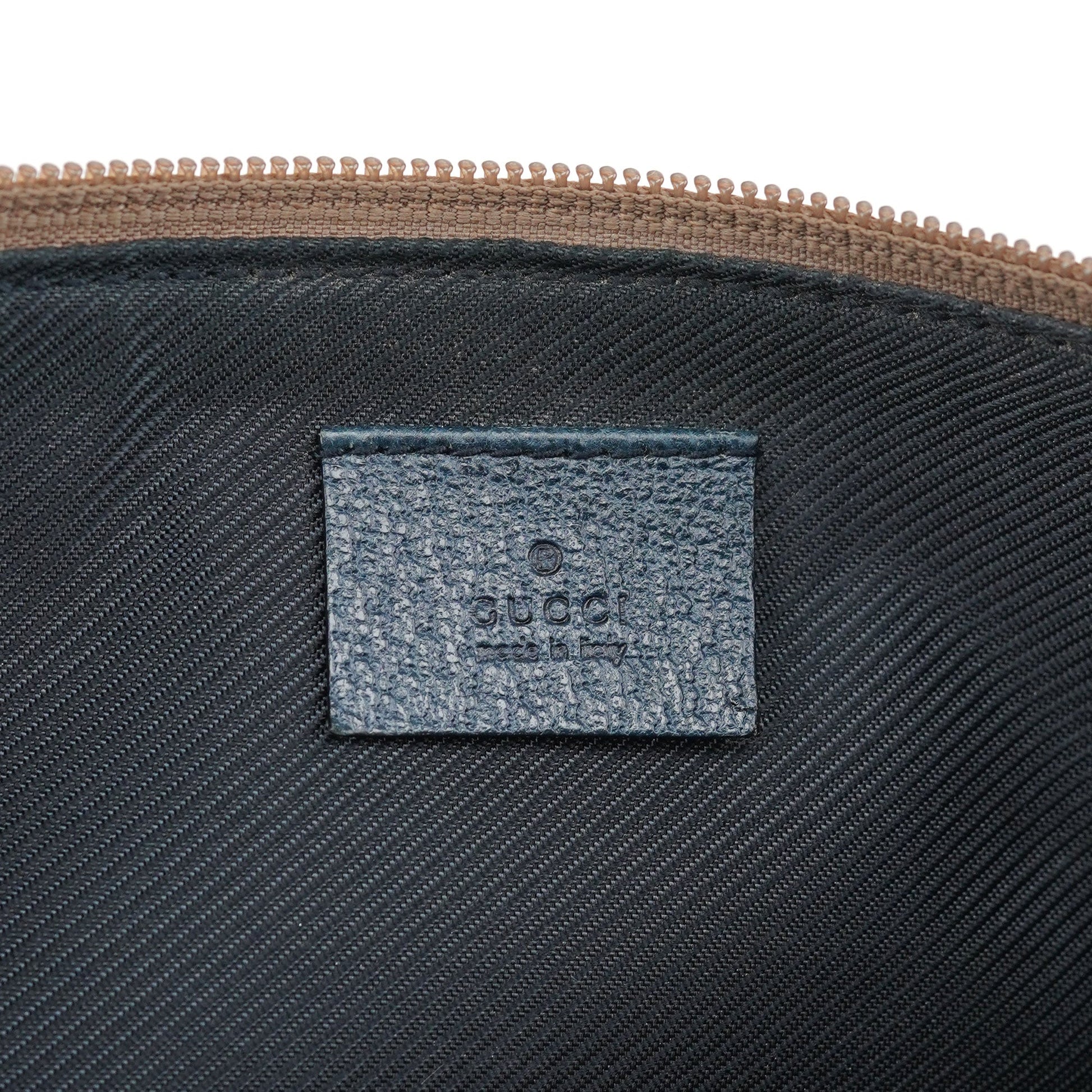 Explore timeless elegance with the Gucci GG Boat Pochette by Tom Ford, circa late 1990s. This exquisite piece combines beige GG canvas with navy leather trim and silver-tone hardware. Its secure zip closure and satin-lined interior offer luxury and practicality, while the subtle Gucci plaque adds a touch of heritage. A perfect blend of vintage charm and sophistication.
