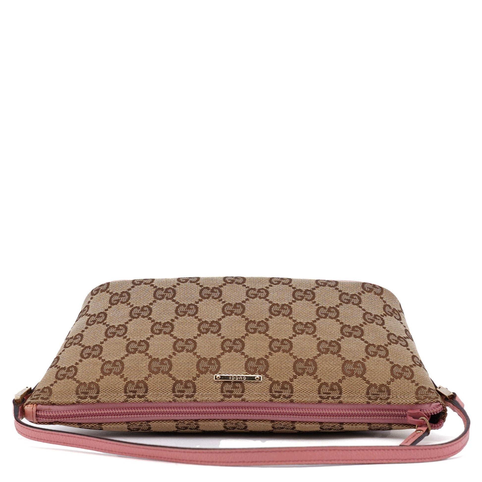 Explore timeless elegance with the Gucci GG boat pochette by Tom Ford, circa late 1990s. This exquisite piece combines beige GG canvas with baby pink leather trim and gold-tone hardware. Its secure zip closure and satin-lined interior offer luxury and practicality, while the subtle Gucci plaque adds a touch of heritage. A perfect blend of vintage charm and sophistication.