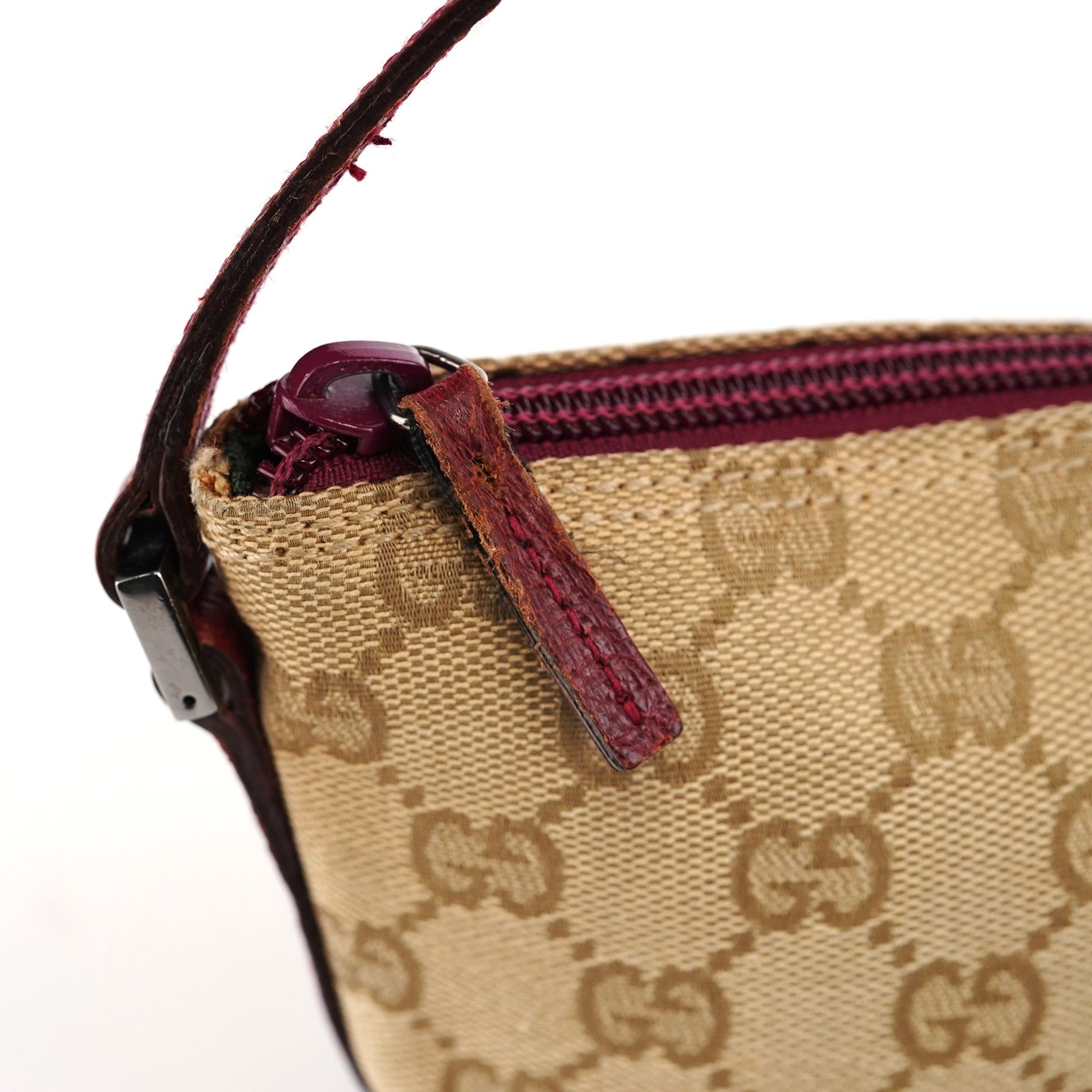 Explore timeless elegance with the Gucci GG Boat Pochette by Tom Ford, circa late 1990s. This exquisite piece combines beige GG canvas with red leather trim and silver-tone hardware. Its secure zip closure and satin-lined interior offer luxury and practicality, while the subtle Gucci plaque adds a touch of heritage.