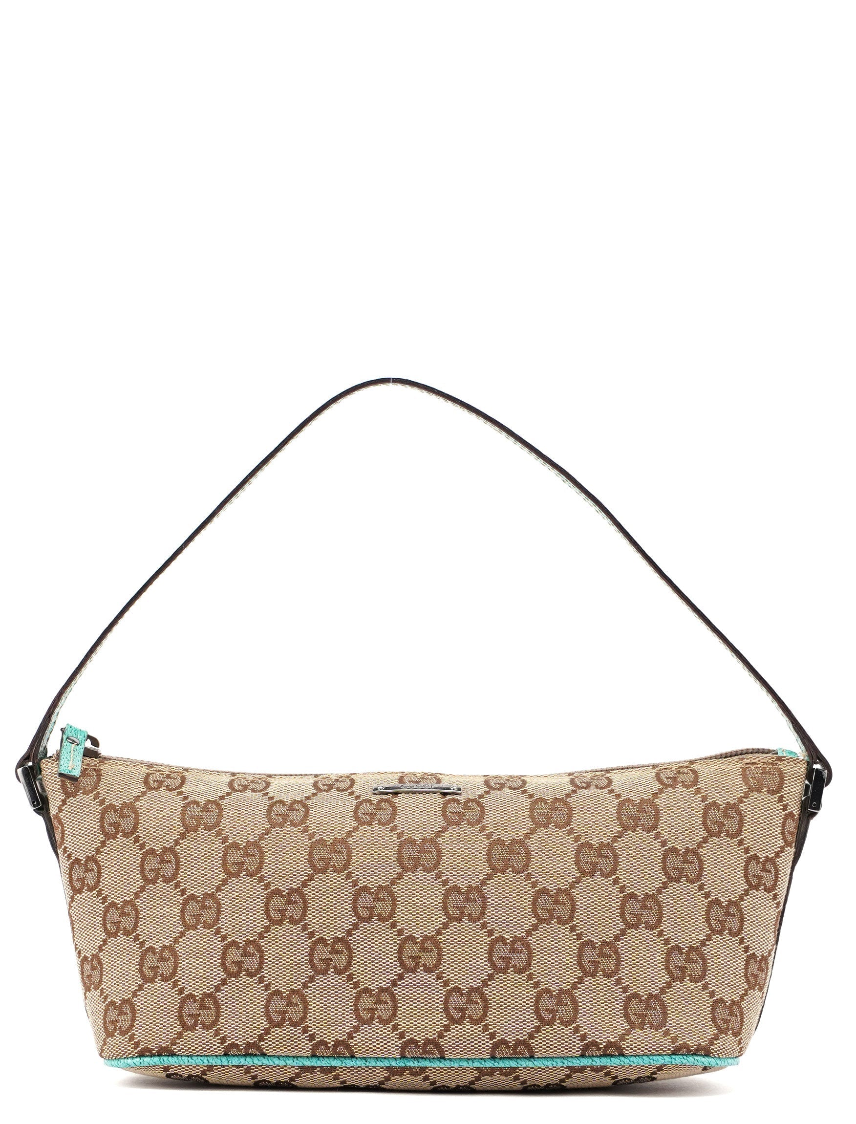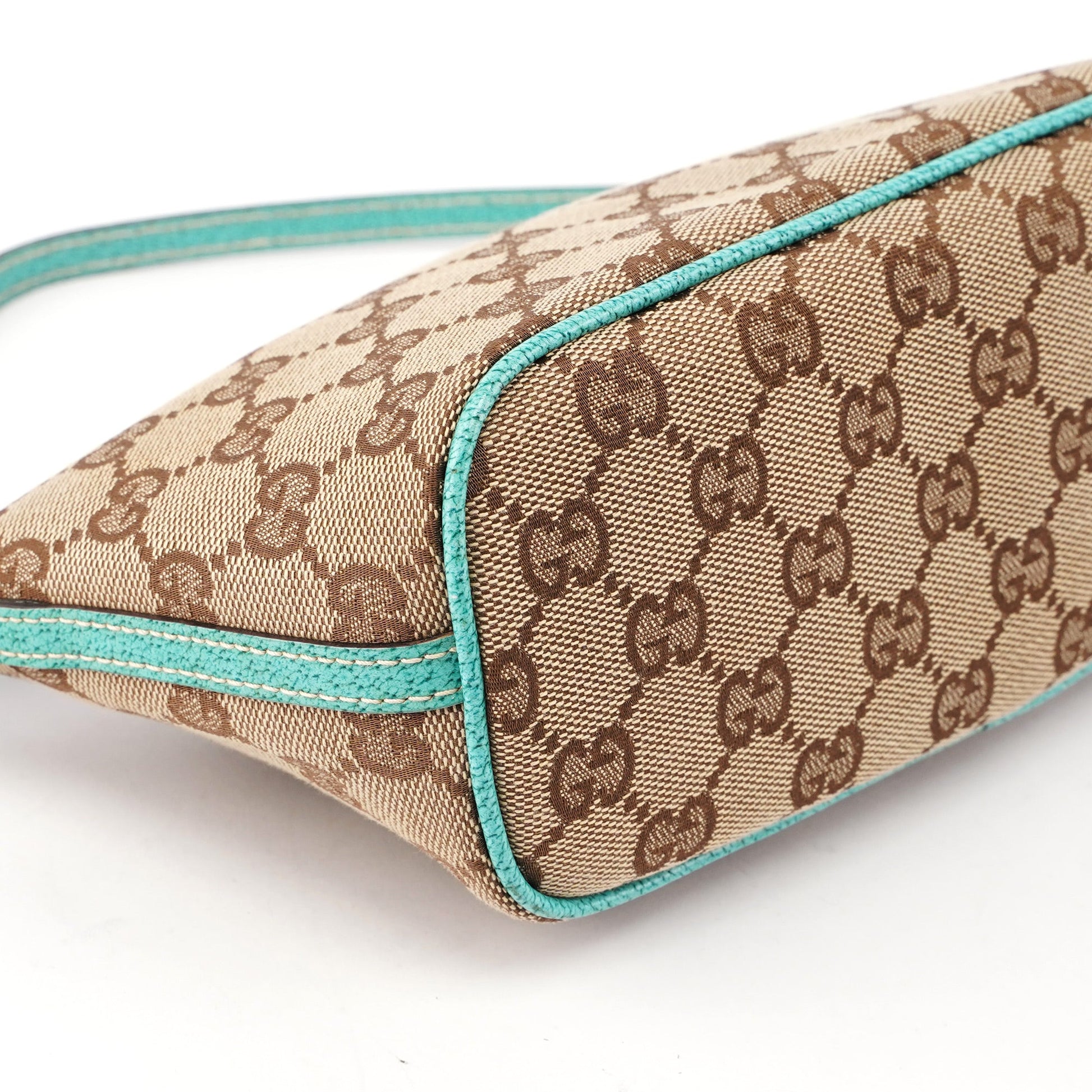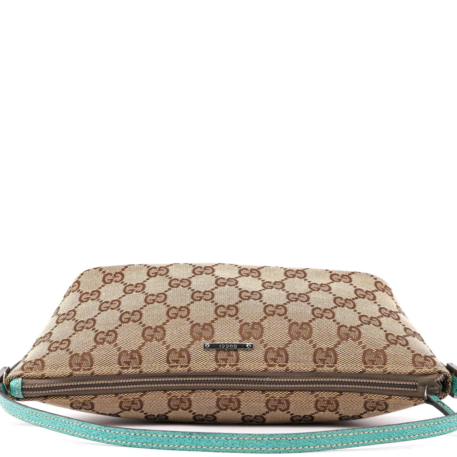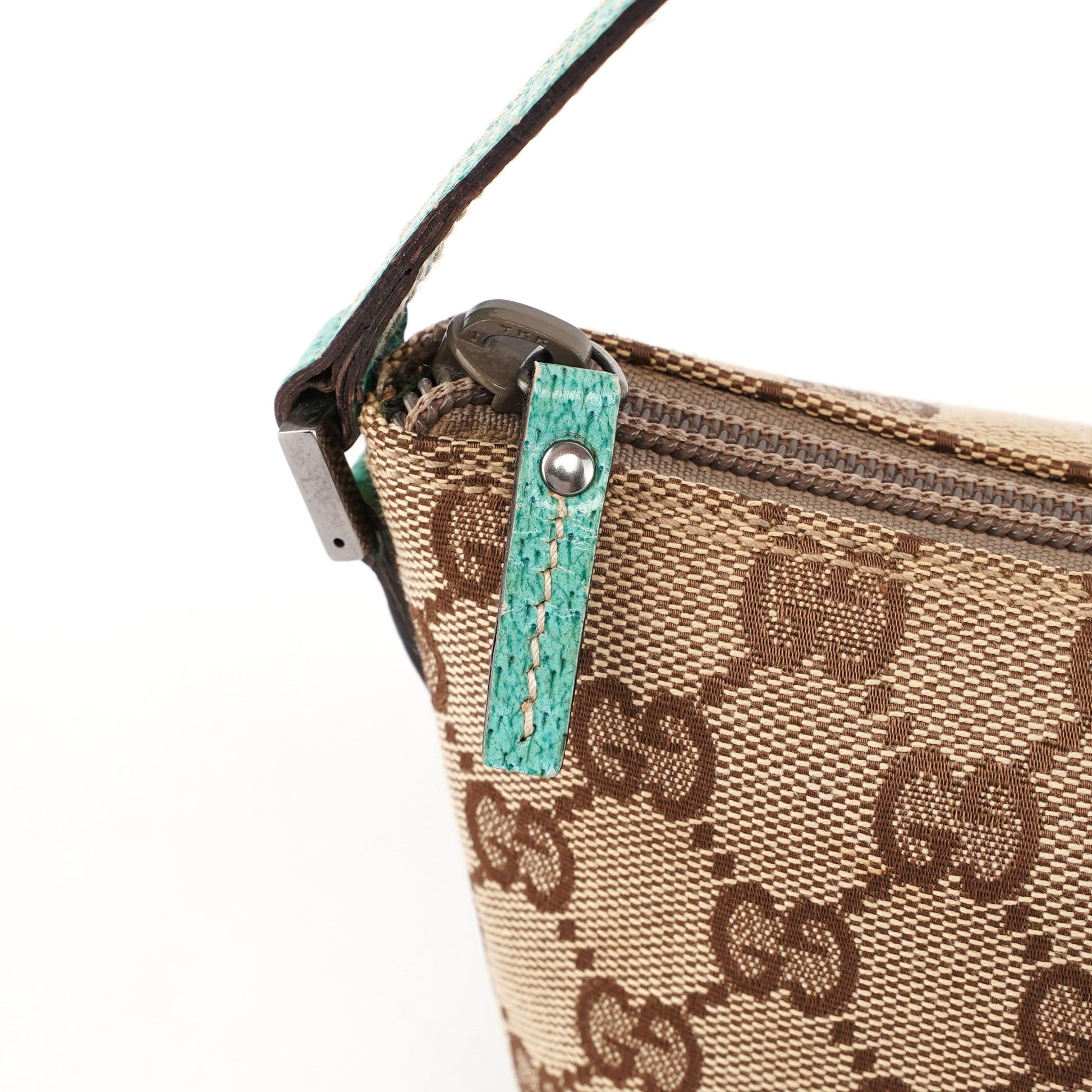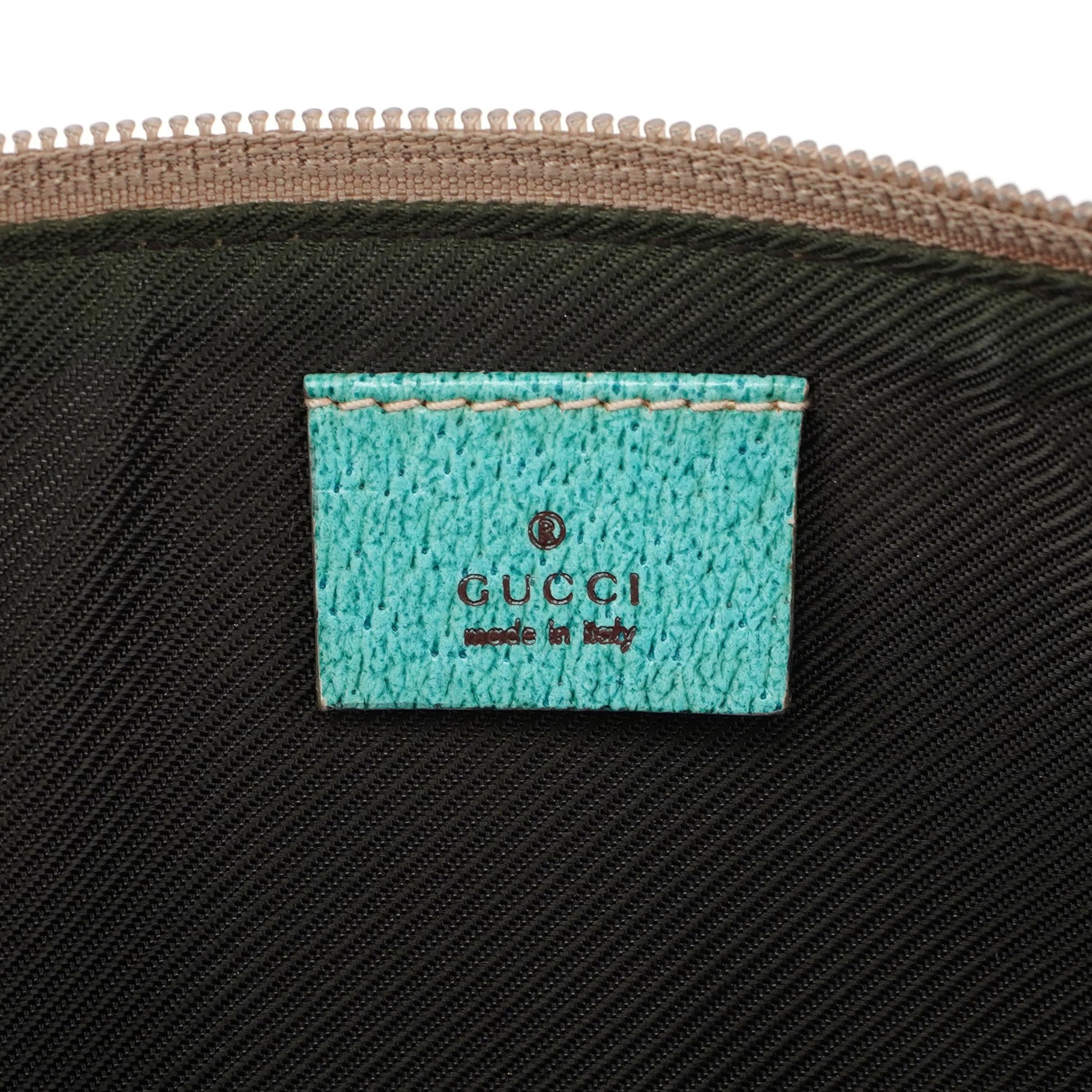 Explore timeless elegance with the Gucci GG Boat Pochette by Tom Ford, circa late 1990s. This exquisite piece combines beige GG canvas with turquoise leather trim and gold-tone hardware. Its secure zip closure and satin-lined interior offer luxury and practicality, while the subtle Gucci plaque adds a touch of heritage.