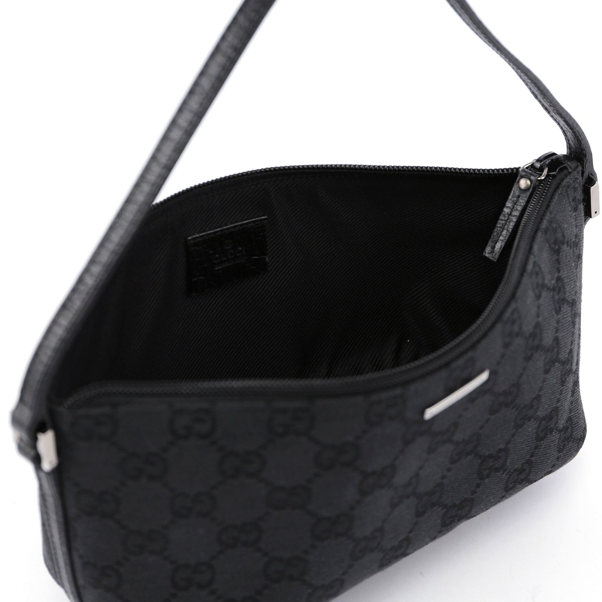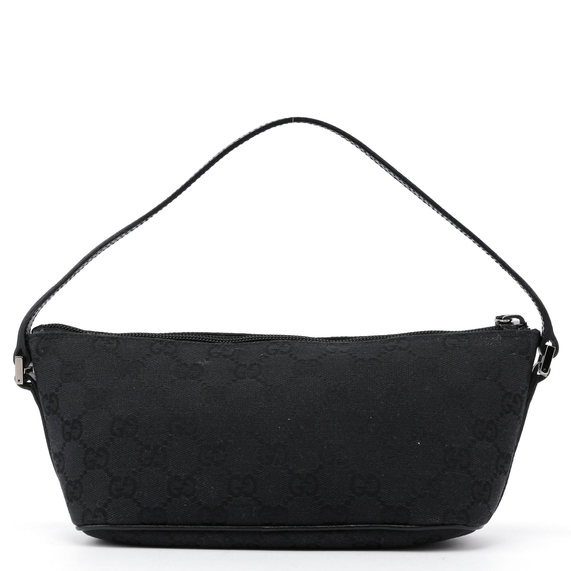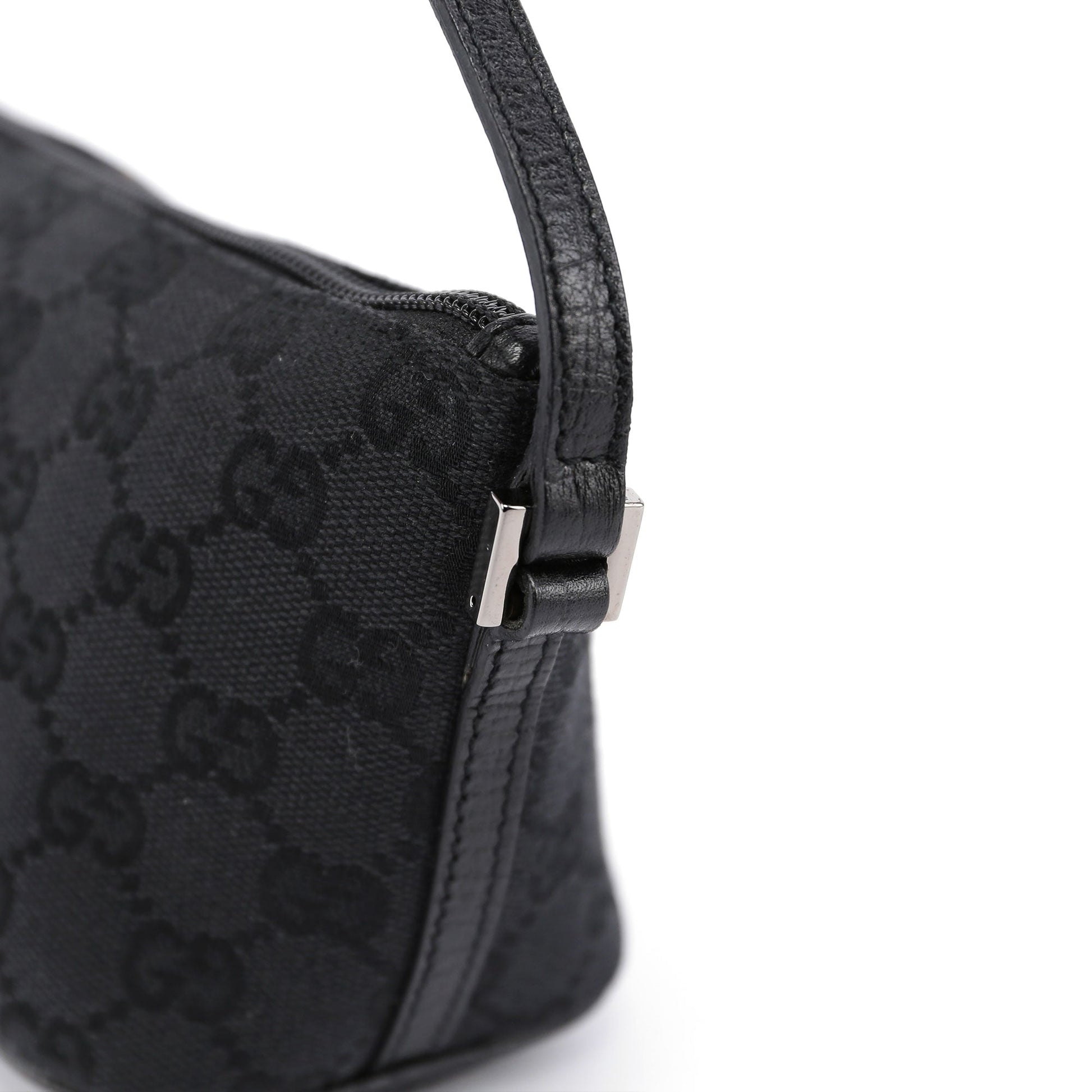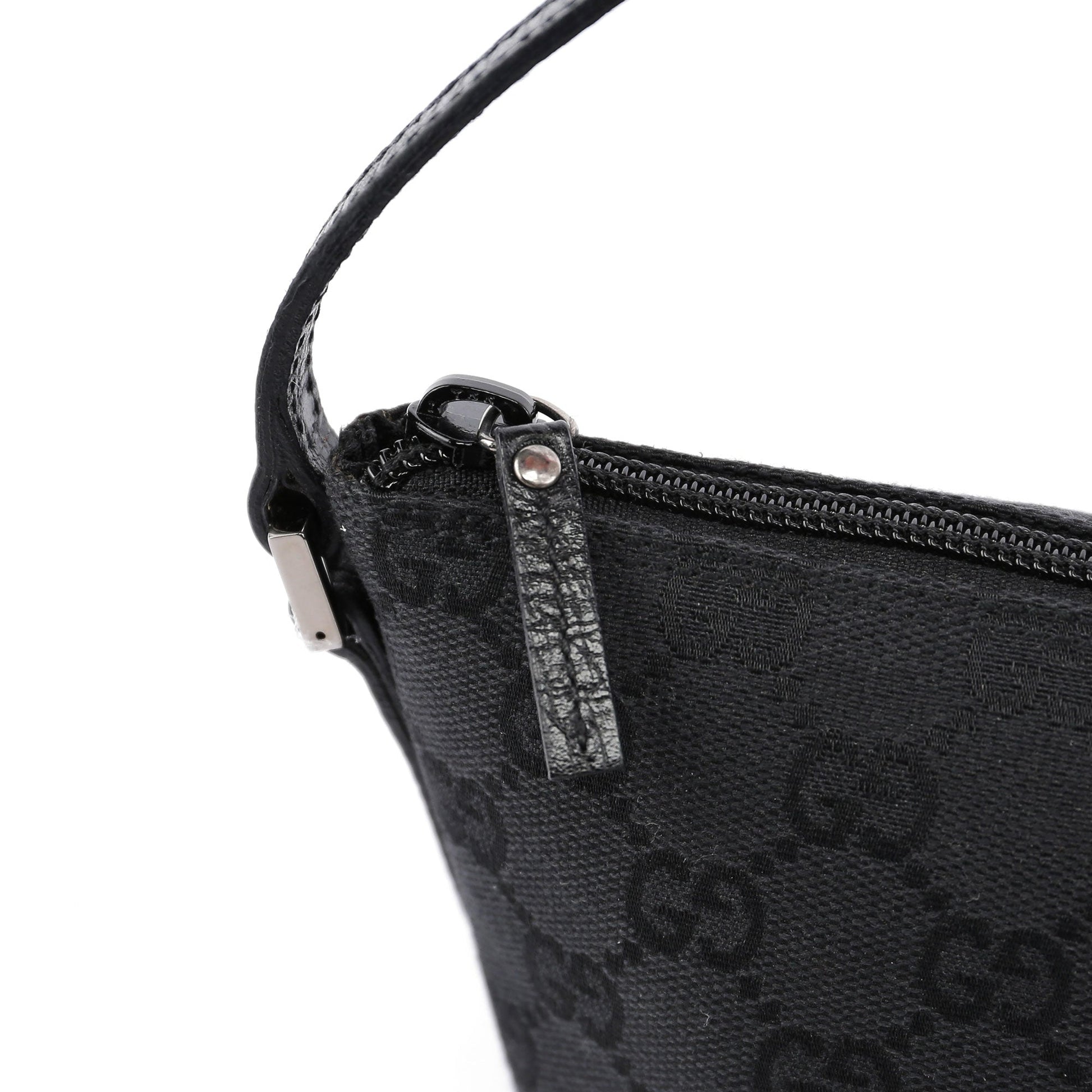 Explore timeless elegance with the Gucci GG boat pochette by Tom Ford, circa late 1990s. This exquisite piece combines black GG canvas with tonal leather trim and silver-tone hardware. Its secure zip closure and satin-lined interior offer luxury and practicality, while the subtle Gucci plaque adds a touch of heritage. A perfect blend of vintage charm and sophistication.