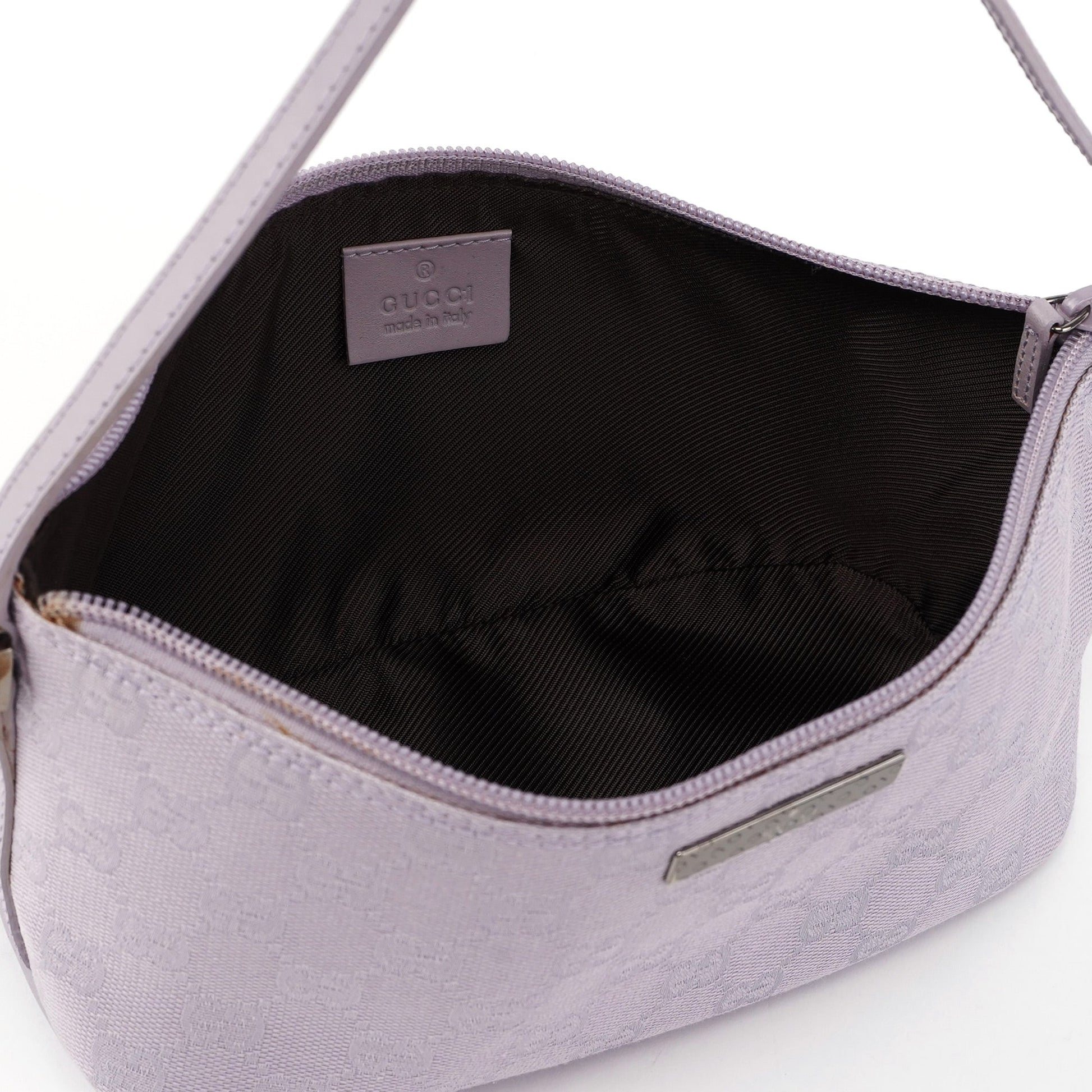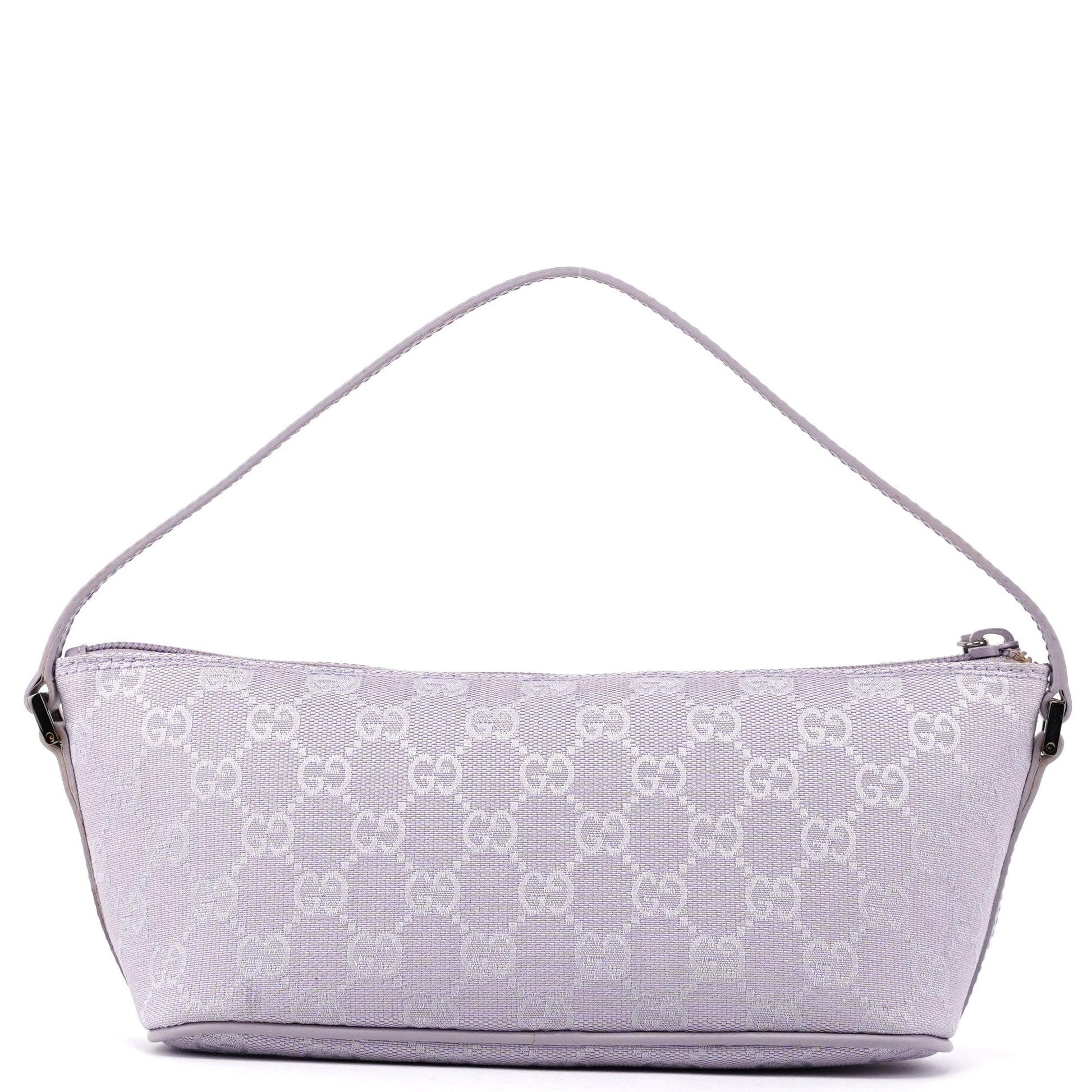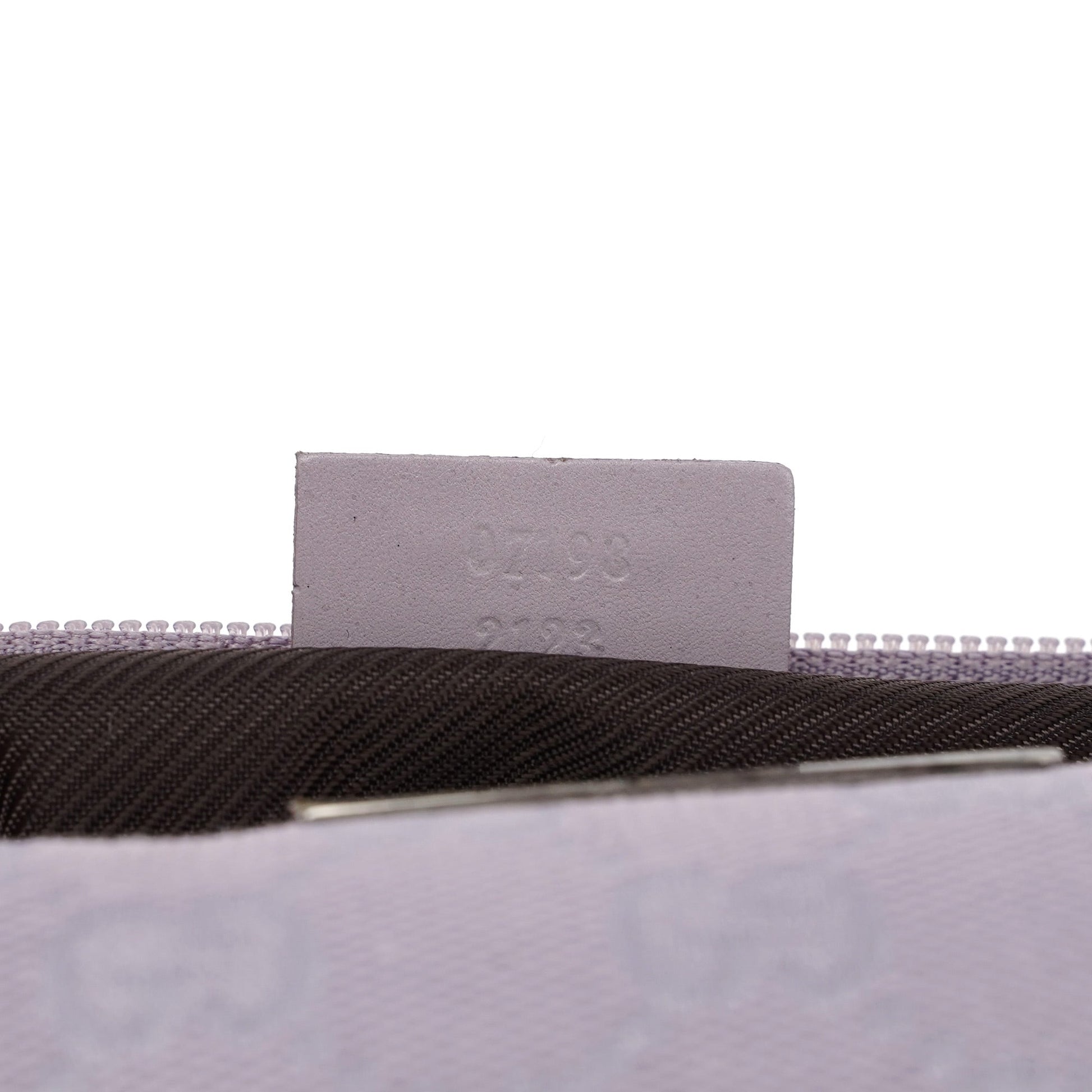 Explore timeless elegance with the Gucci GG Boat Pochette by Tom Ford, circa late 1990s. This exquisite piece combines lavender GG canvas with tonal leather trim and silver-tone hardware. Its secure zip closure and satin-lined interior offer luxury and practicality, while the subtle Gucci plaque adds a touch of heritage. A perfect blend of vintage charm and sophistication.