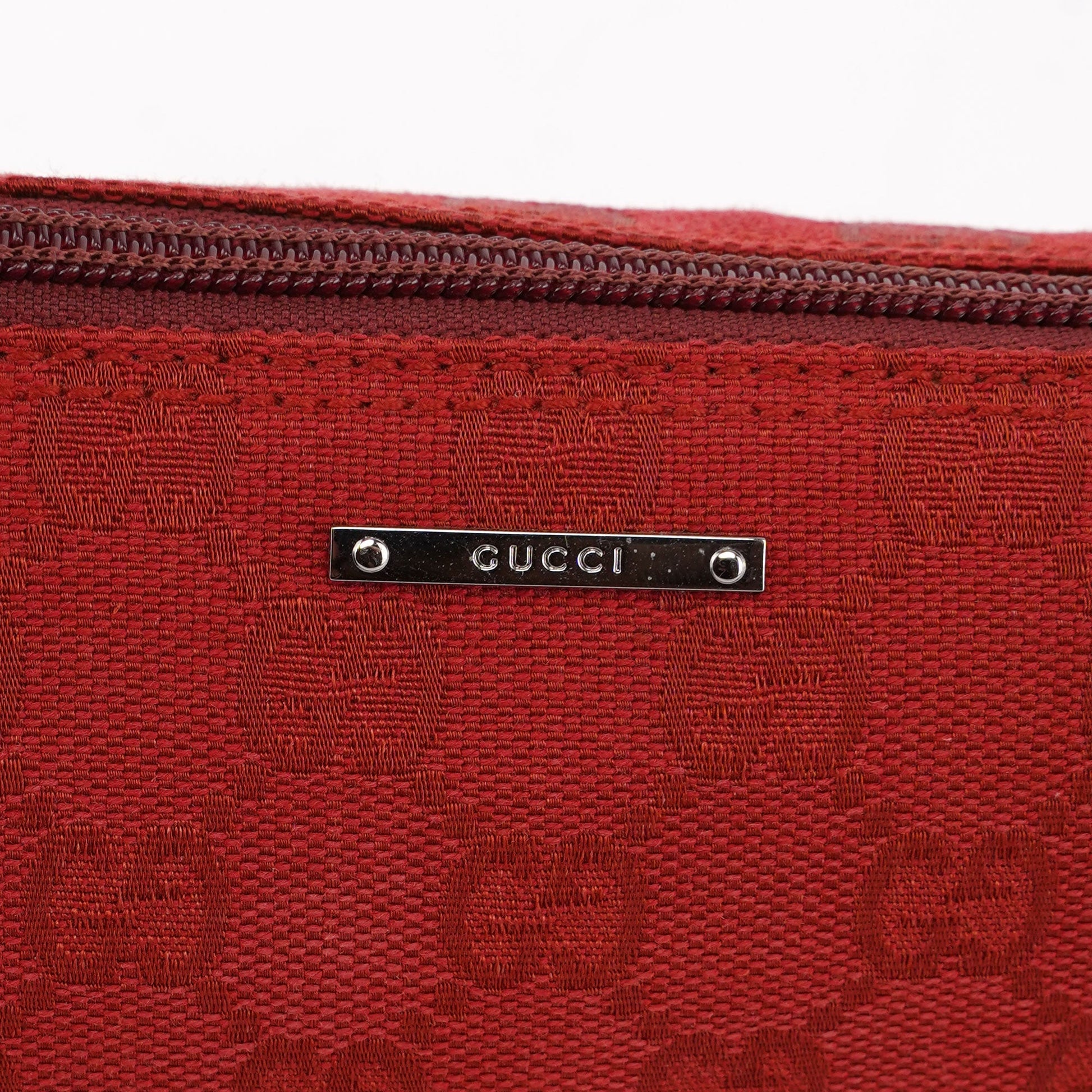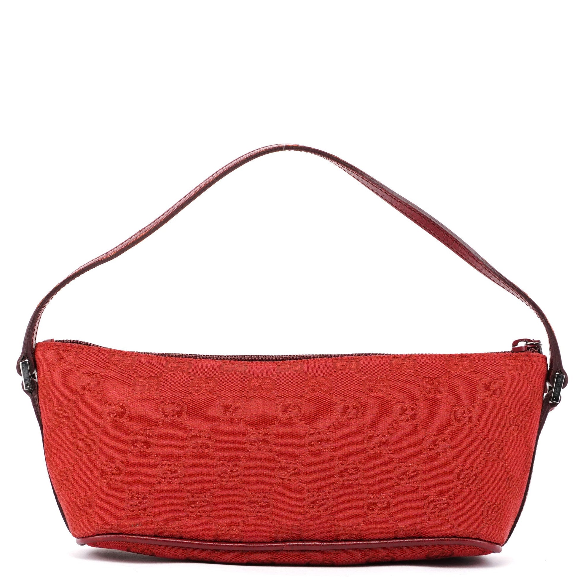 Explore timeless elegance with the Gucci GG Boat Pochette by Tom Ford, circa late 1990s. This exquisite piece combines red GG canvas with tonal leather trim and gold-tone hardware. Its secure zip closure and satin-lined interior offer luxury and practicality, while the subtle Gucci plaque adds a touch of heritage.