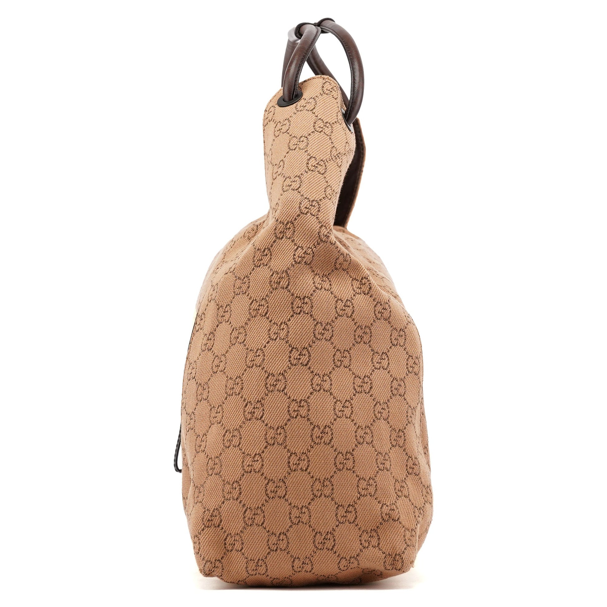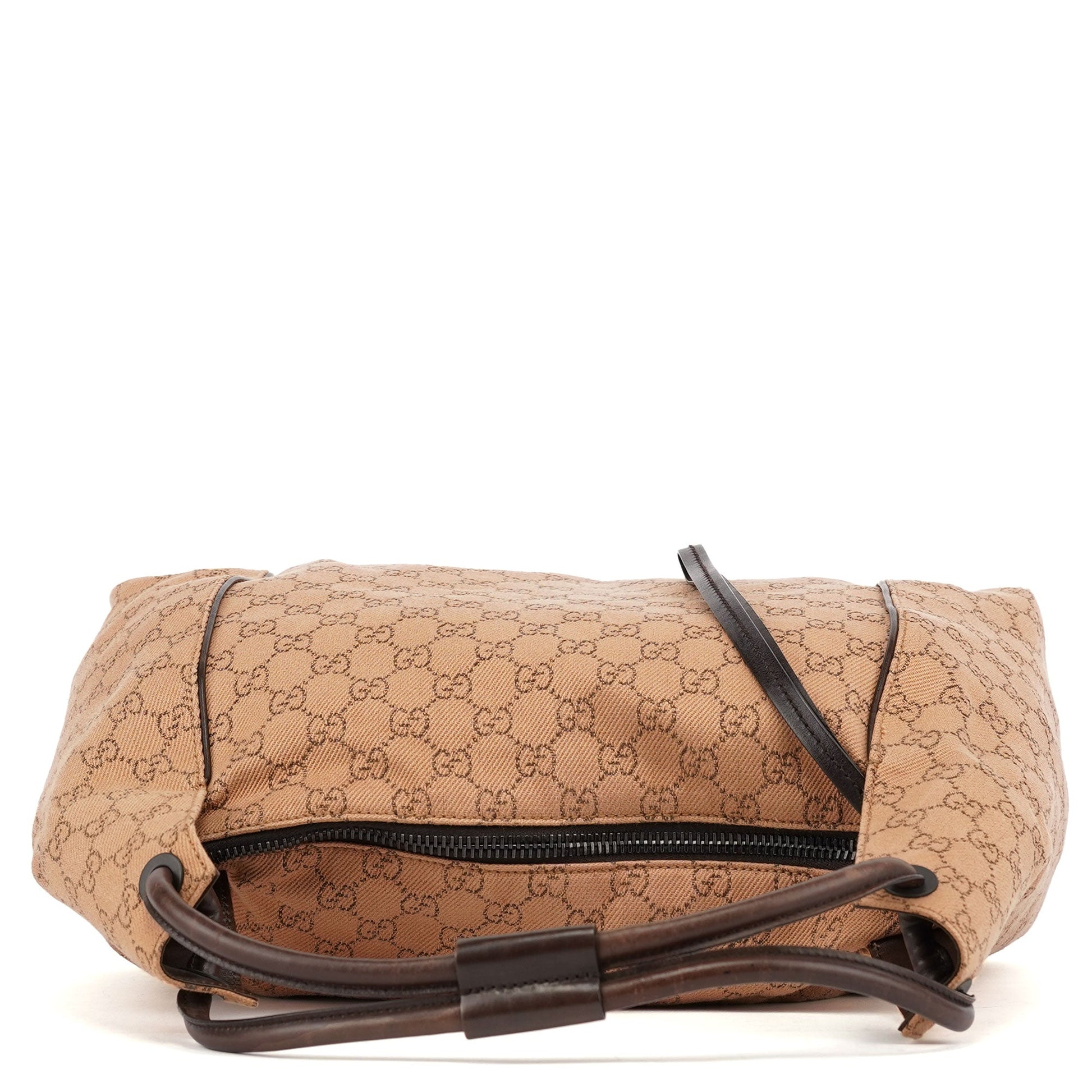 Designed by Tom Ford in the early 2000's, this Gucci GG Monogram shoulder bag exudes sophistication. Handcrafted in the beige GG monogram canvas with brown calfskin leather trim bearing the Gucci logo, it features anthracite hardware and a convenient zipper closure. Inside, the satin-lined interior houses a practical zipper pocket for organization.