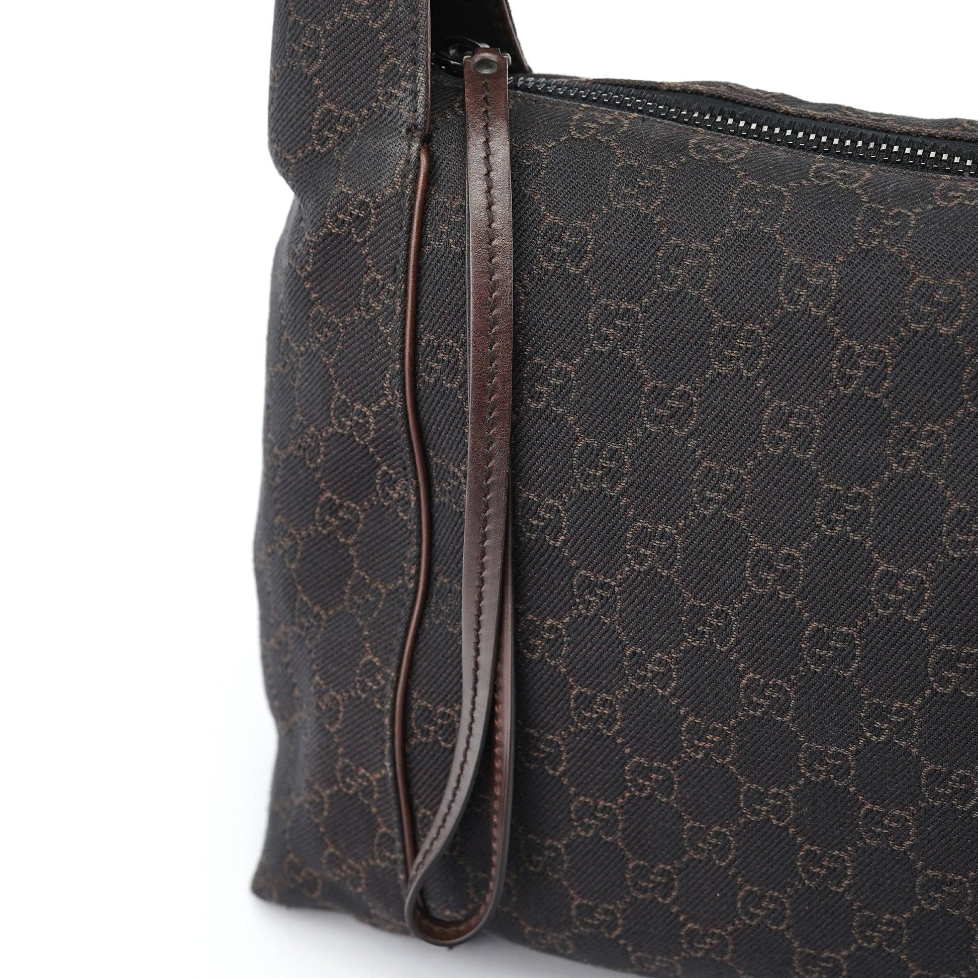 Designed by Tom Ford in the early 2000's, this Gucci GG Monogram shoulder bag exudes sophistication. Handcrafted in the brown GG monogram canvas with calfskin leather trim bearing the Gucci logo, it features anthracite hardware and a convenient zipper closure. Inside, the satin-lined interior houses a practical zipper pocket for organization.