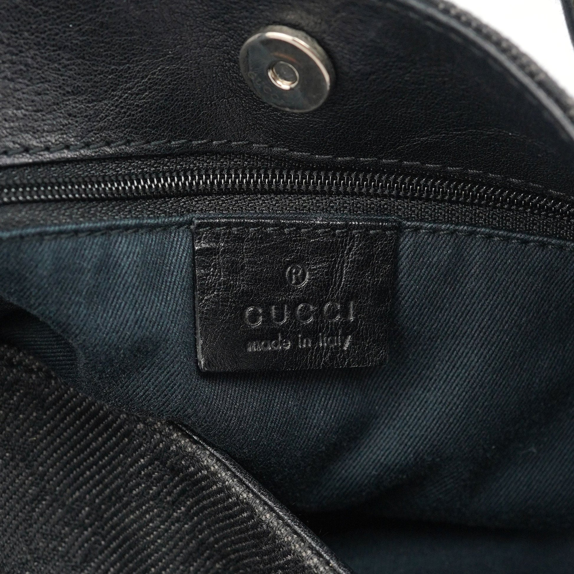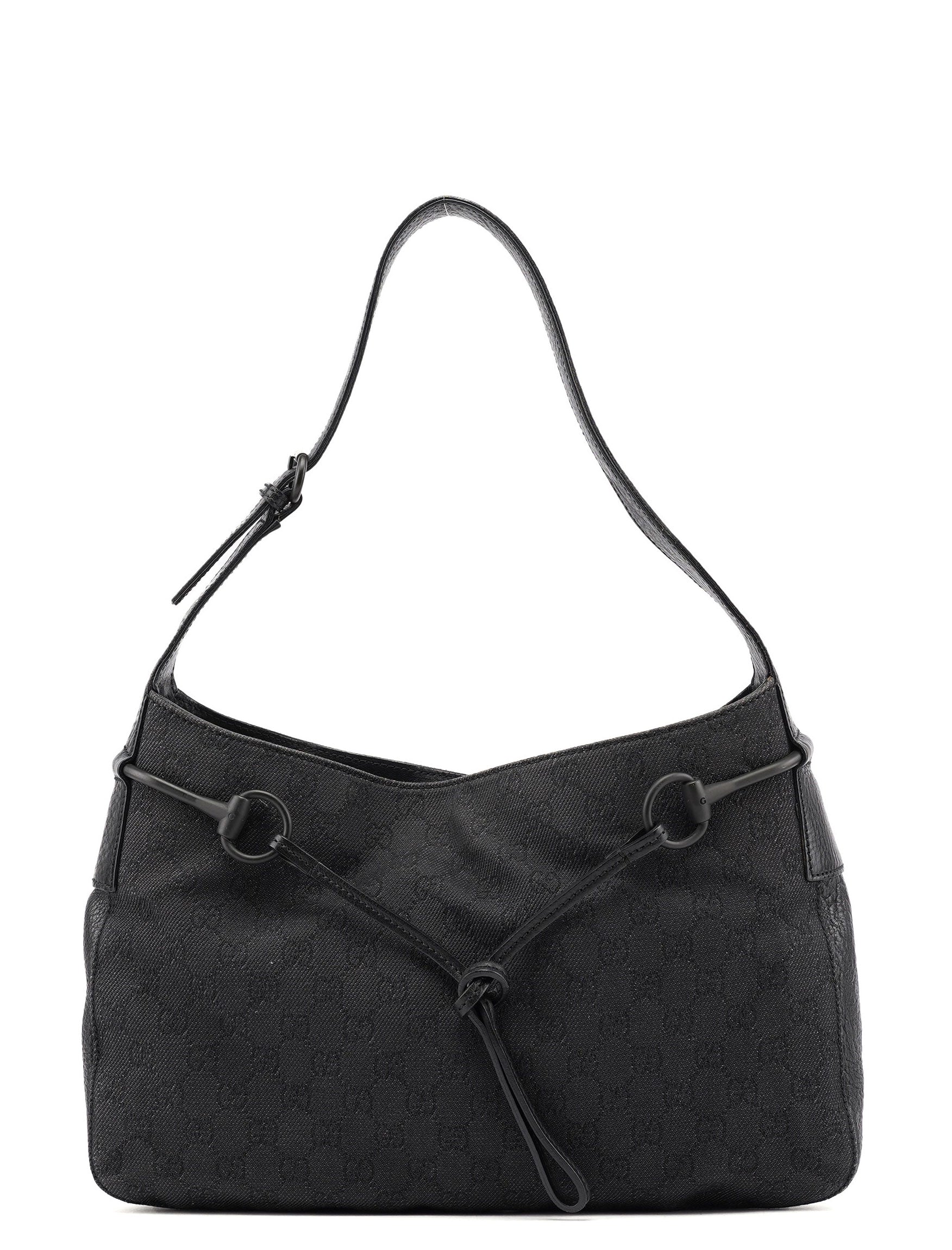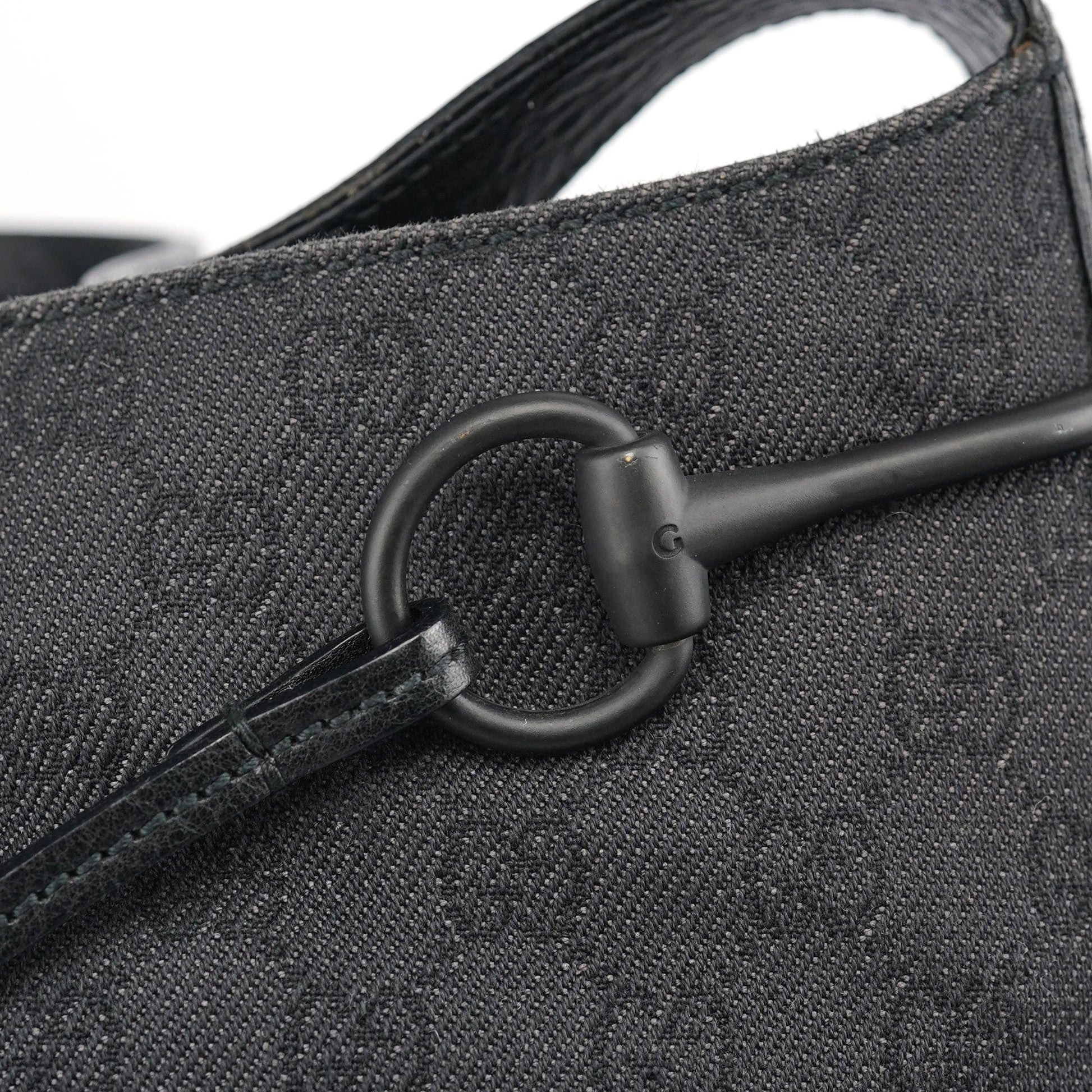 Designed by Tom Ford in the early 2000s, the Gucci GG Horsebit shoulder bag is crafted from black GG monogram canvas with anthracite horsebit hardware. A belt detail on the handle adds distinction, while the magnetic closure secures a cotton-lined interior with a zipper pocket.