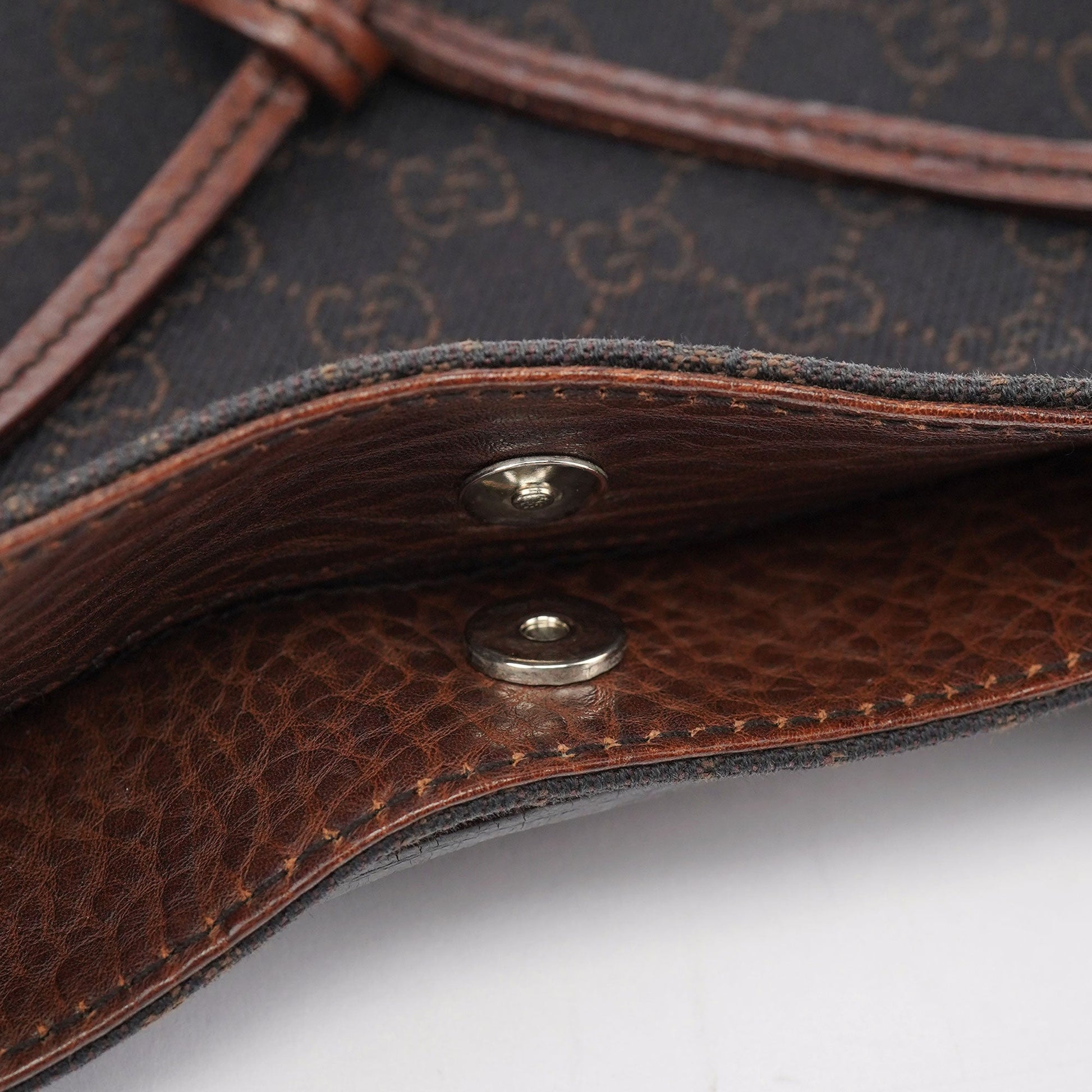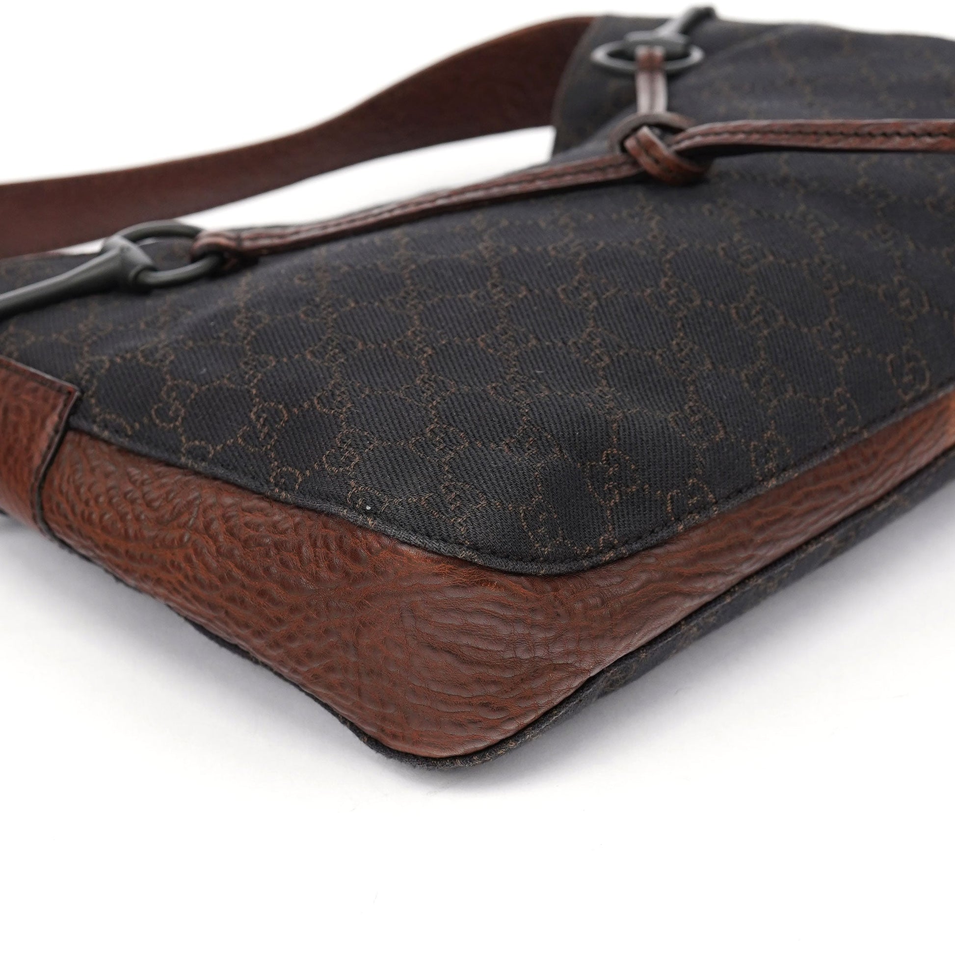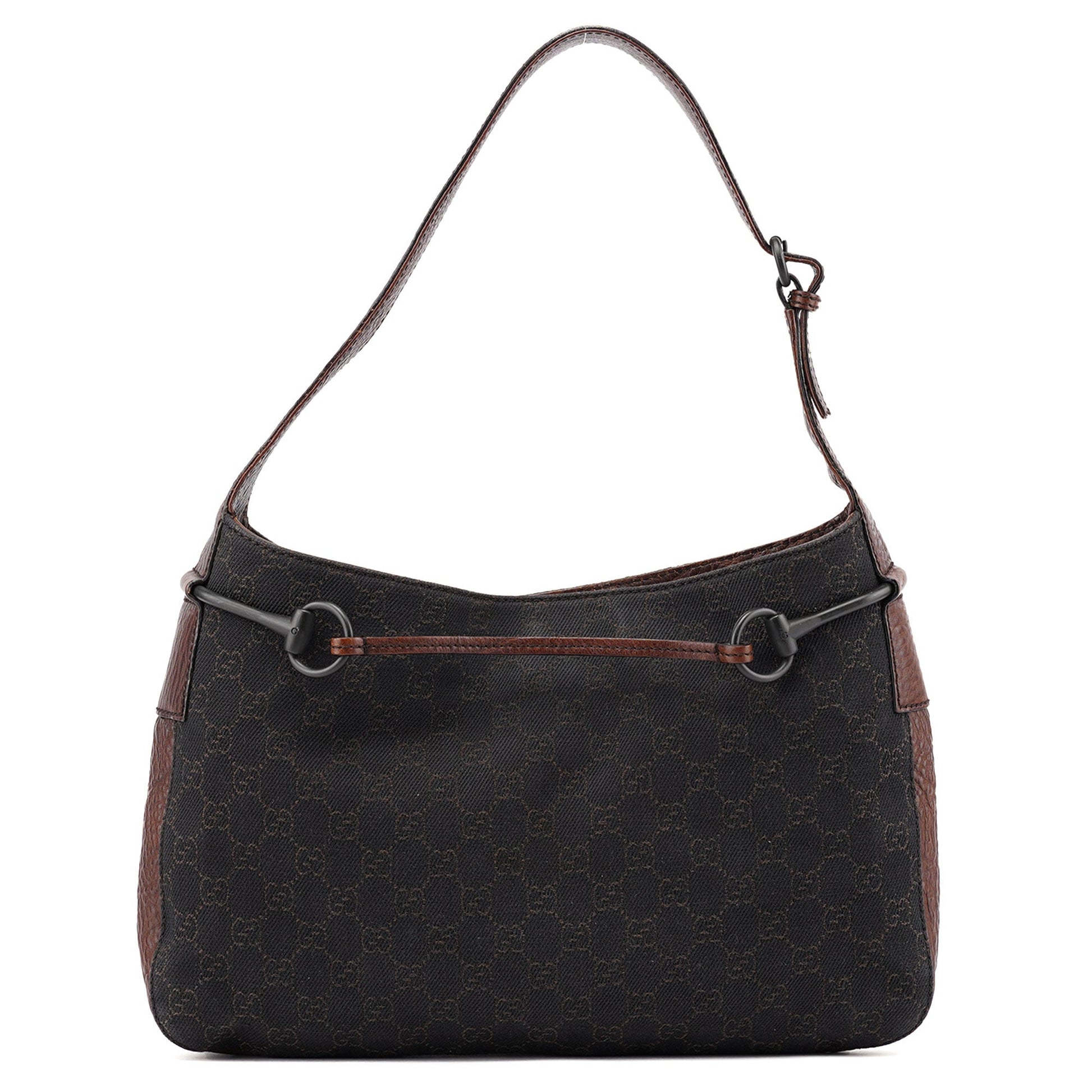 Designed by Tom Ford in the early 2000s, the Gucci GG Horsebit shoulder bag is crafted from brown GG monogram canvas with anthracite horsebit hardware. A belt detail on the handle adds distinction, while the magnetic closure secures a cotton-lined interior with a zipper pocket.