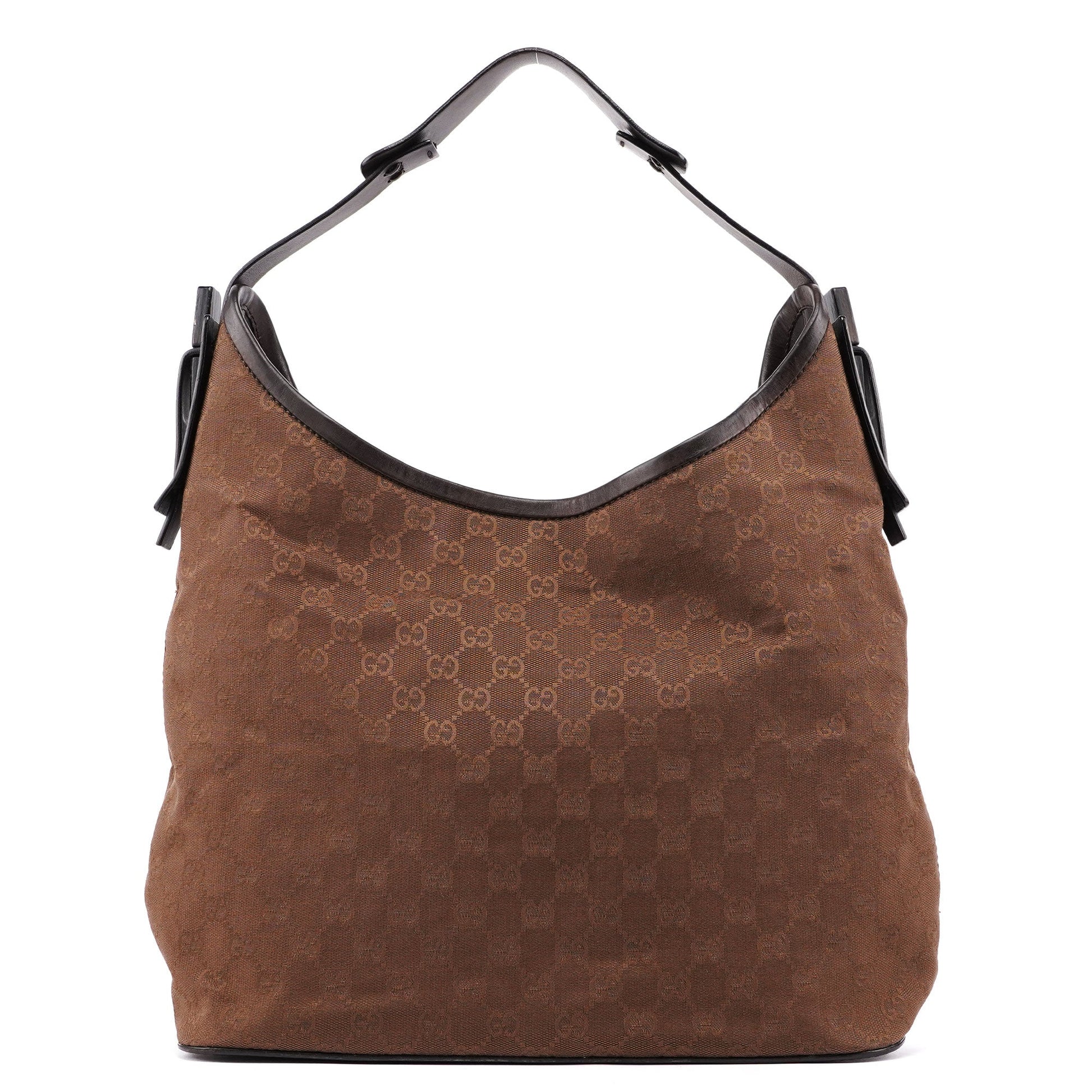 Designed by Tom Ford in the mid 1990s, this Gucci GG hobo shoulder bag is handcrafted in brown GG monogram canvas with tonal leather trim. It features a wooden detail with Gucci logo engraved. The cotton-lined interior features a convenient zipper pocket and magnetic closure.