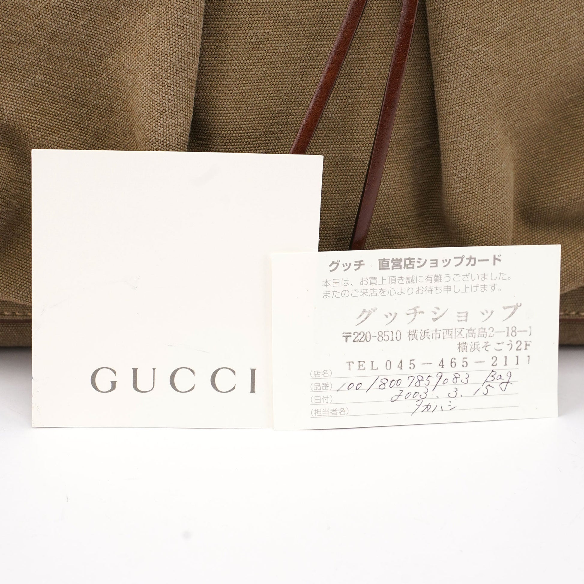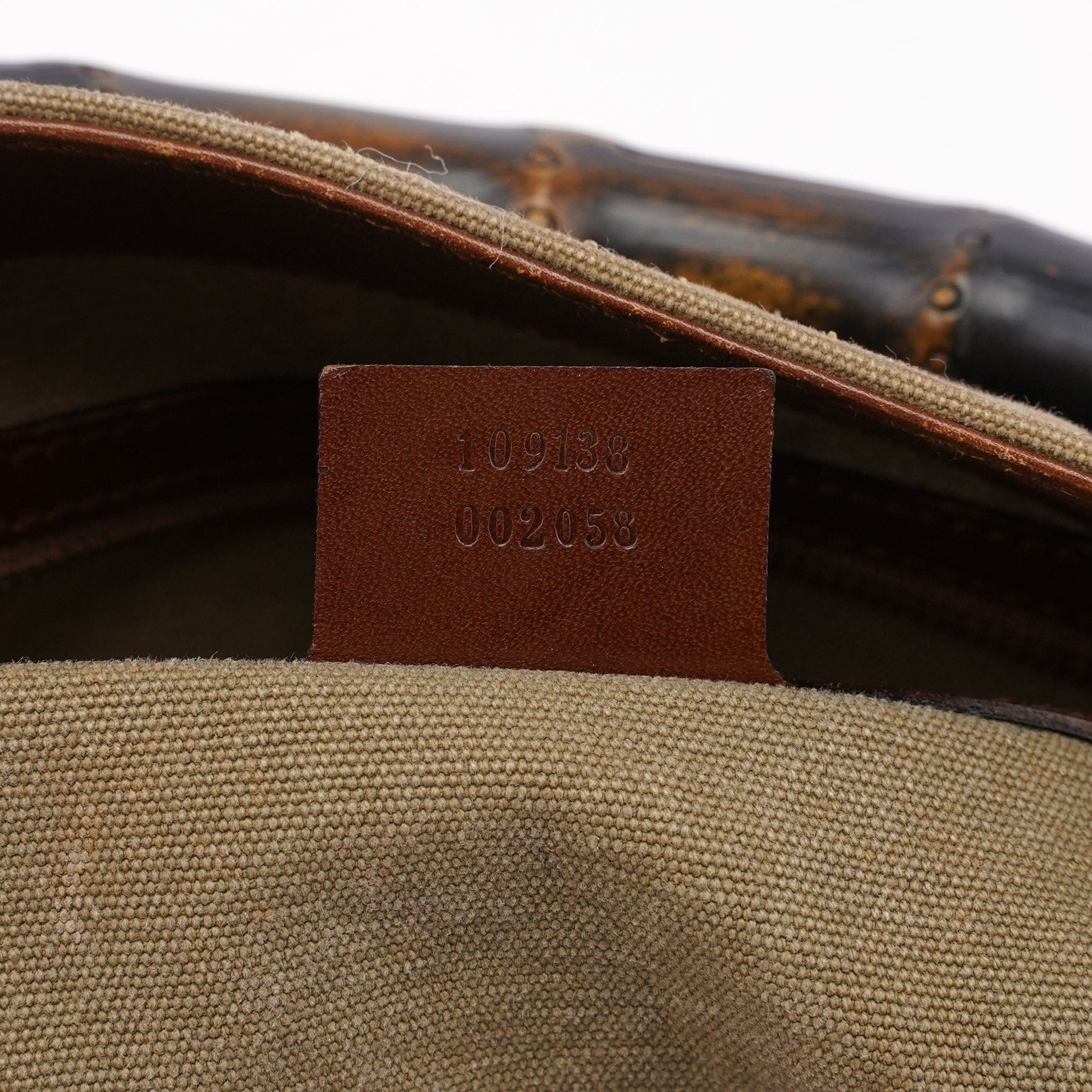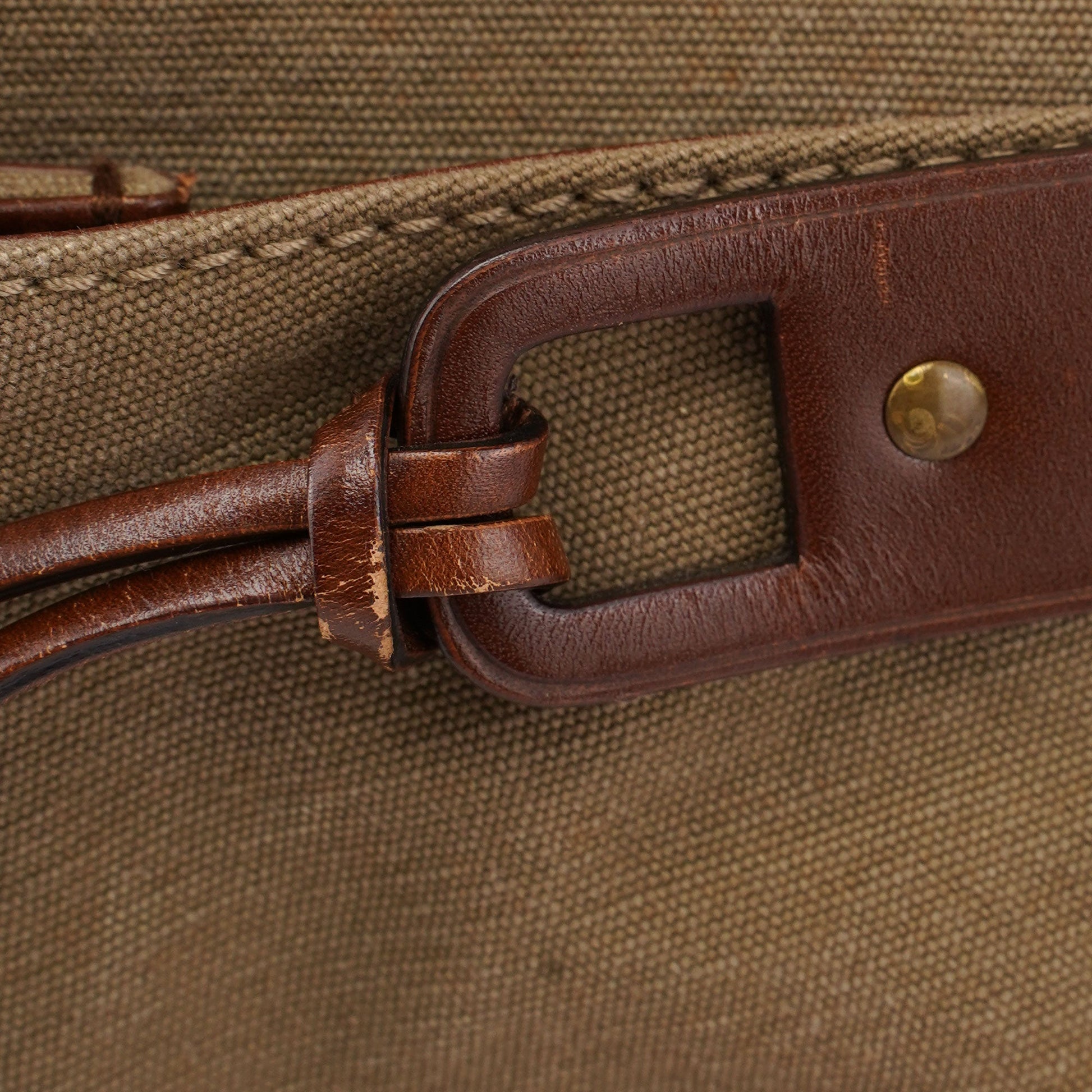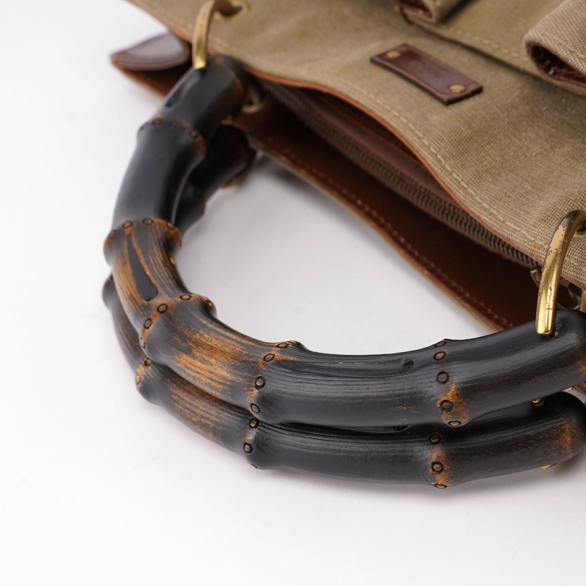 Designed by Tom Ford in 2002, this Gucci Bamboo bag is handcrafted from kaki cotton canvas and features bamboo handles and complementing brown leather trim, accented with brass hardware. Inside, three storage compartments, including an interior zip pocket, ensuring space and organization for your essentials.