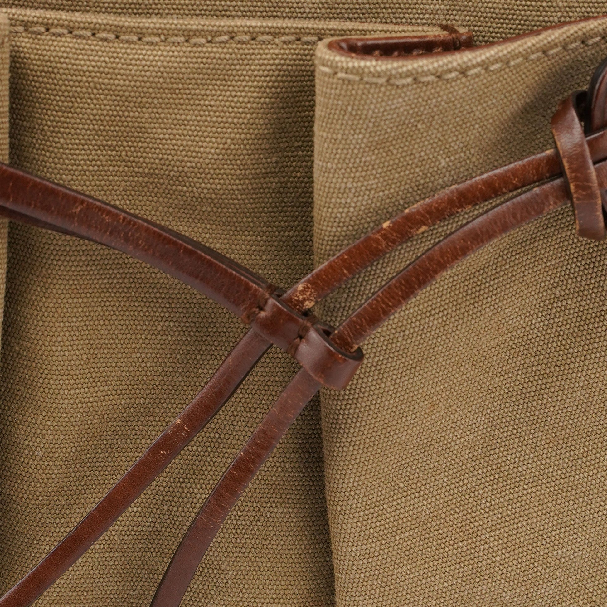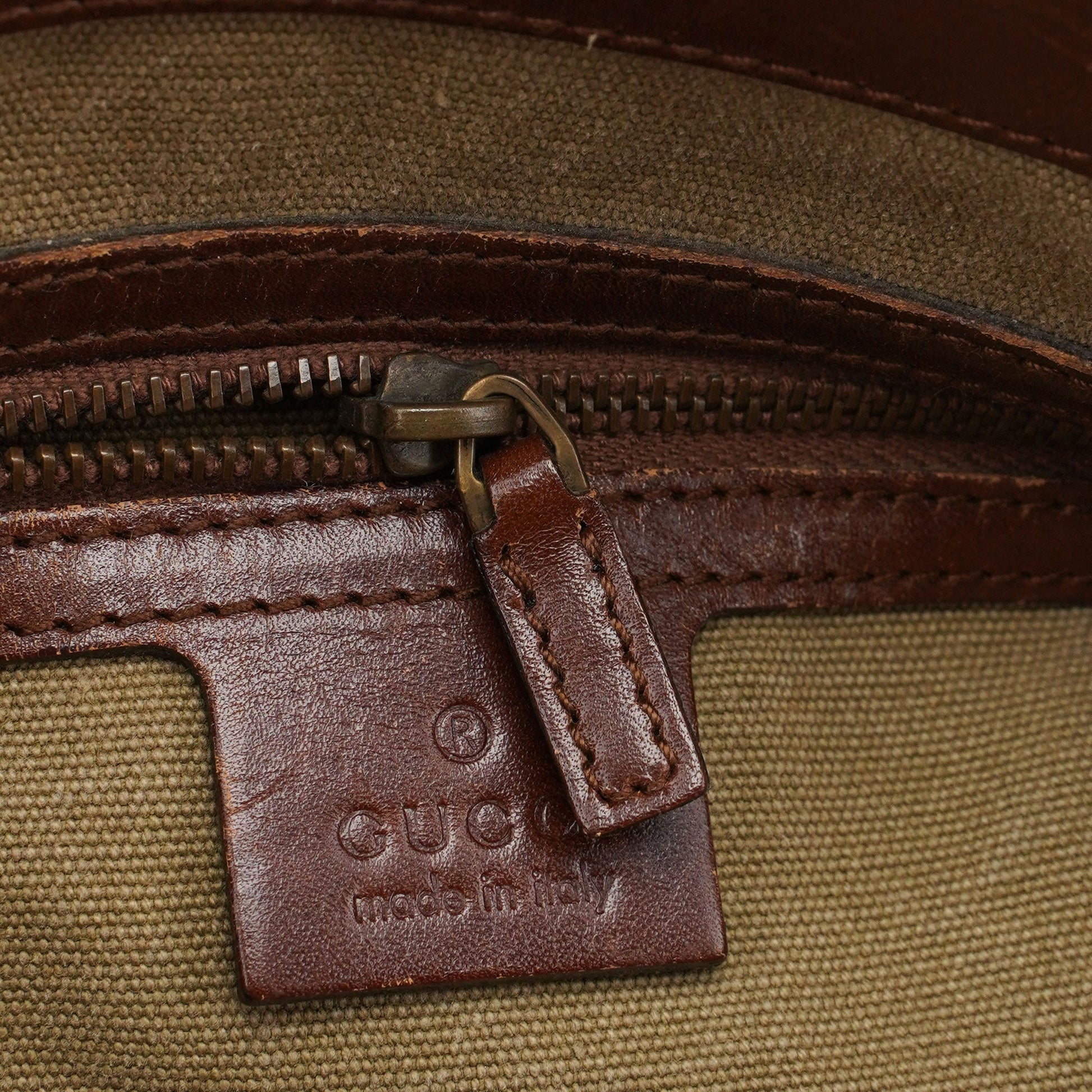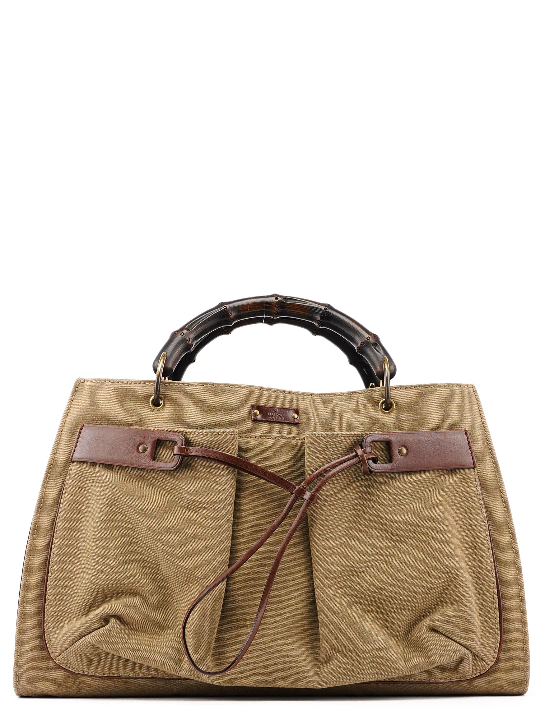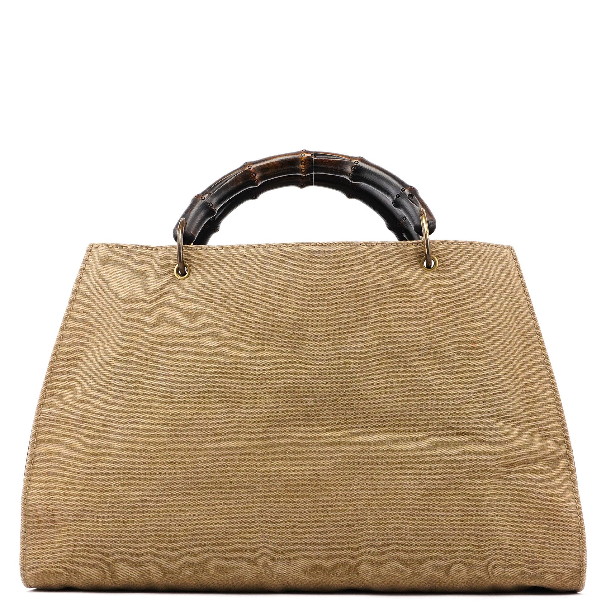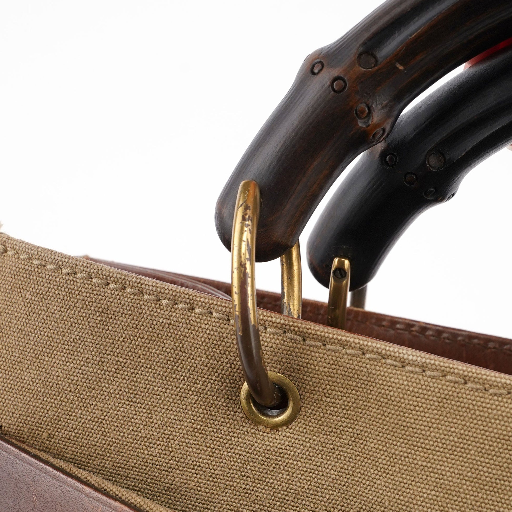 Designed by Tom Ford in 2003, this Gucci Bamboo bag is handcrafted from kaki cotton canvas and features bamboo handles and complementing brown leather trim, accented with brass hardware. Inside, three storage compartments, including an interior zip pocket, ensuring space and organization for your essentials.