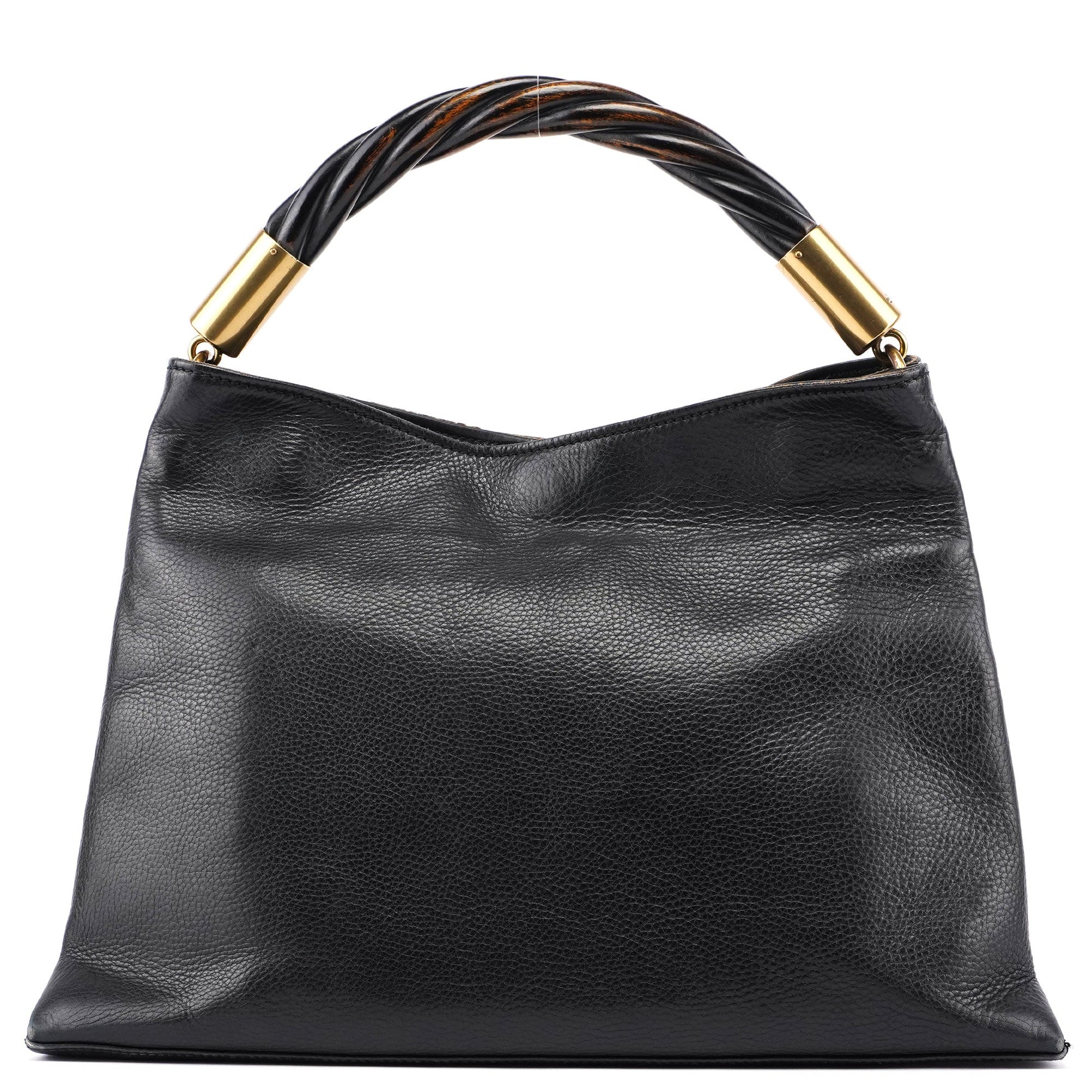 Handcrafted from black tumbled leather, this Gucci Wood Knot handle bag by Tom Ford from the iconic 2003 collection features a beautiful wooden knot handle with gold-tone hardware engraved with the Gucci logo, a magnetic closure, and a GG monogram interior with an interior zipper pocket. The Gucci logo is embossed at the front, showcasing timeless elegance.