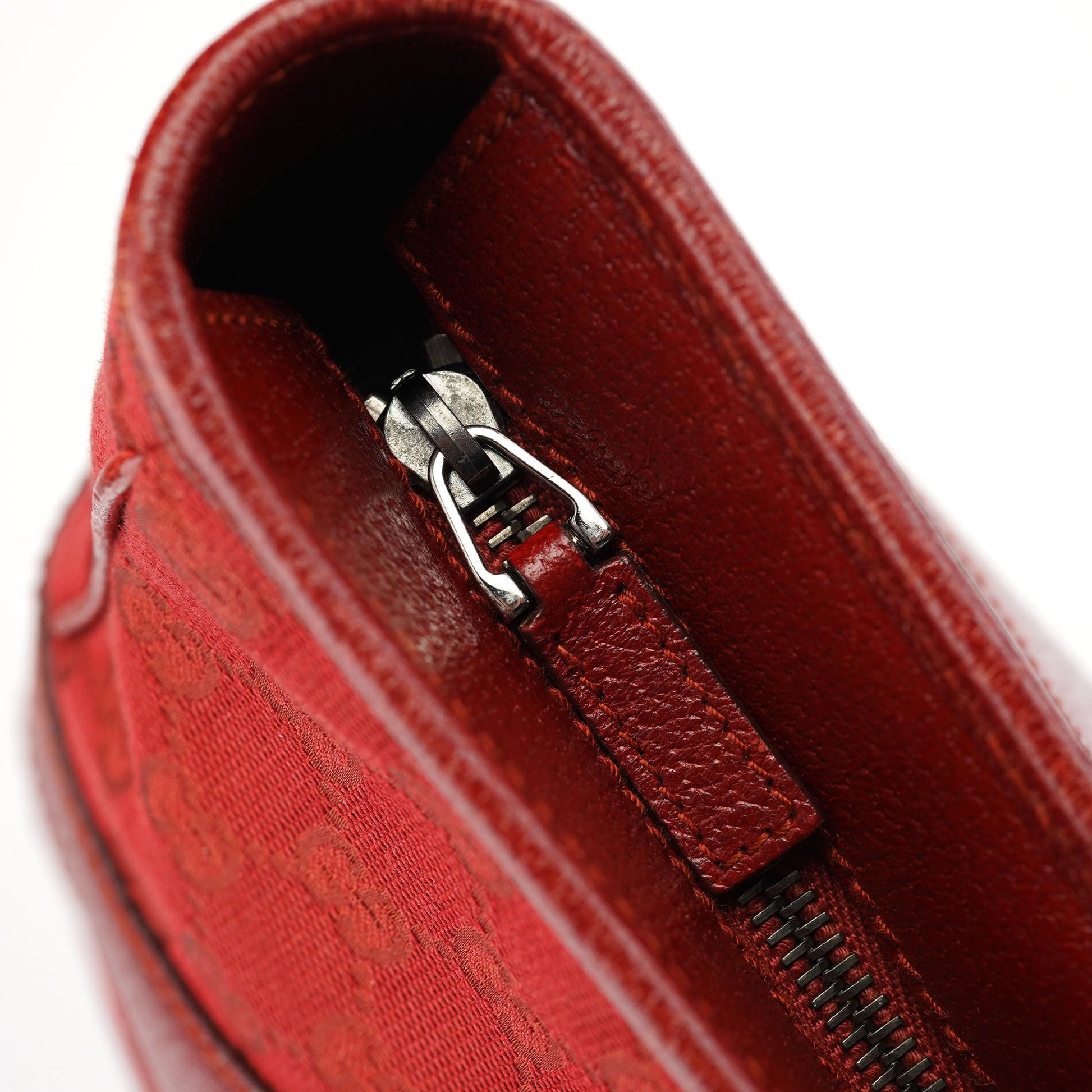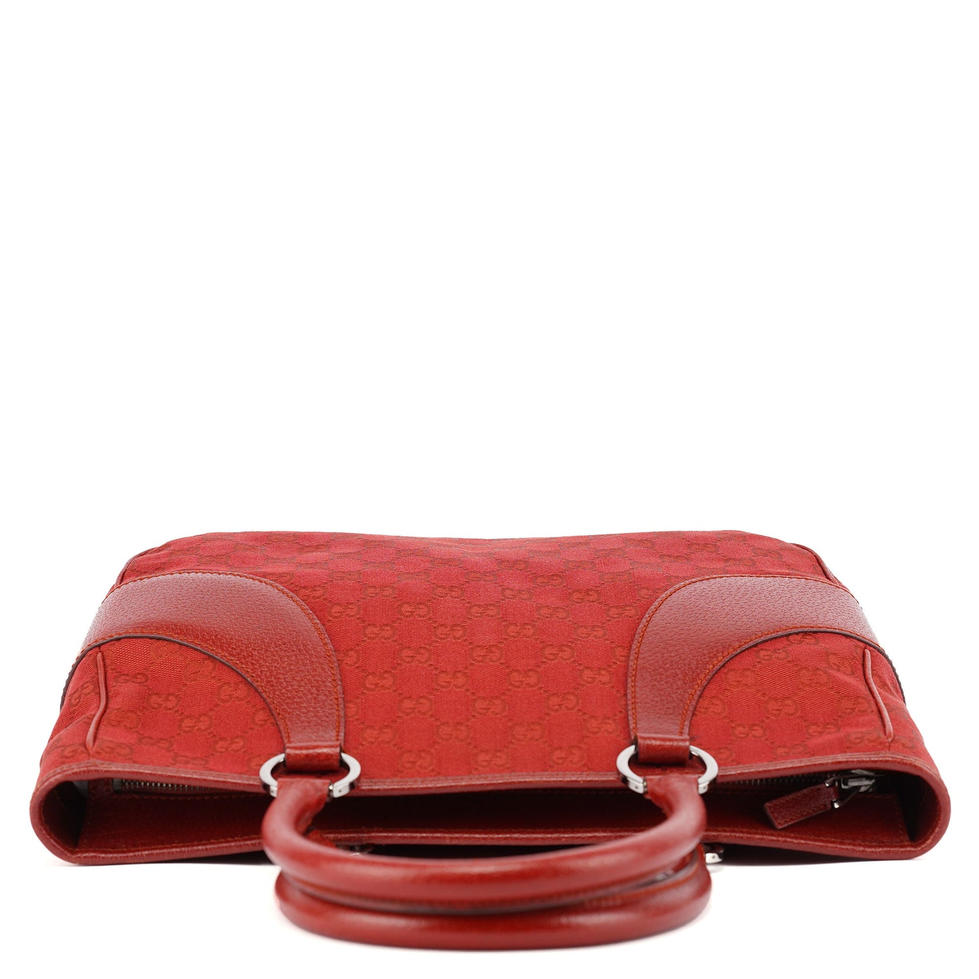 Designed by Tom Ford in the late 1990s, this Gucci GG monogram tote bag is handcrafted from red GG canvas with tonal calfskin leather trim. It features silver-tone hardware and a cotton-lined interior with a zipper pocket for added functionality.