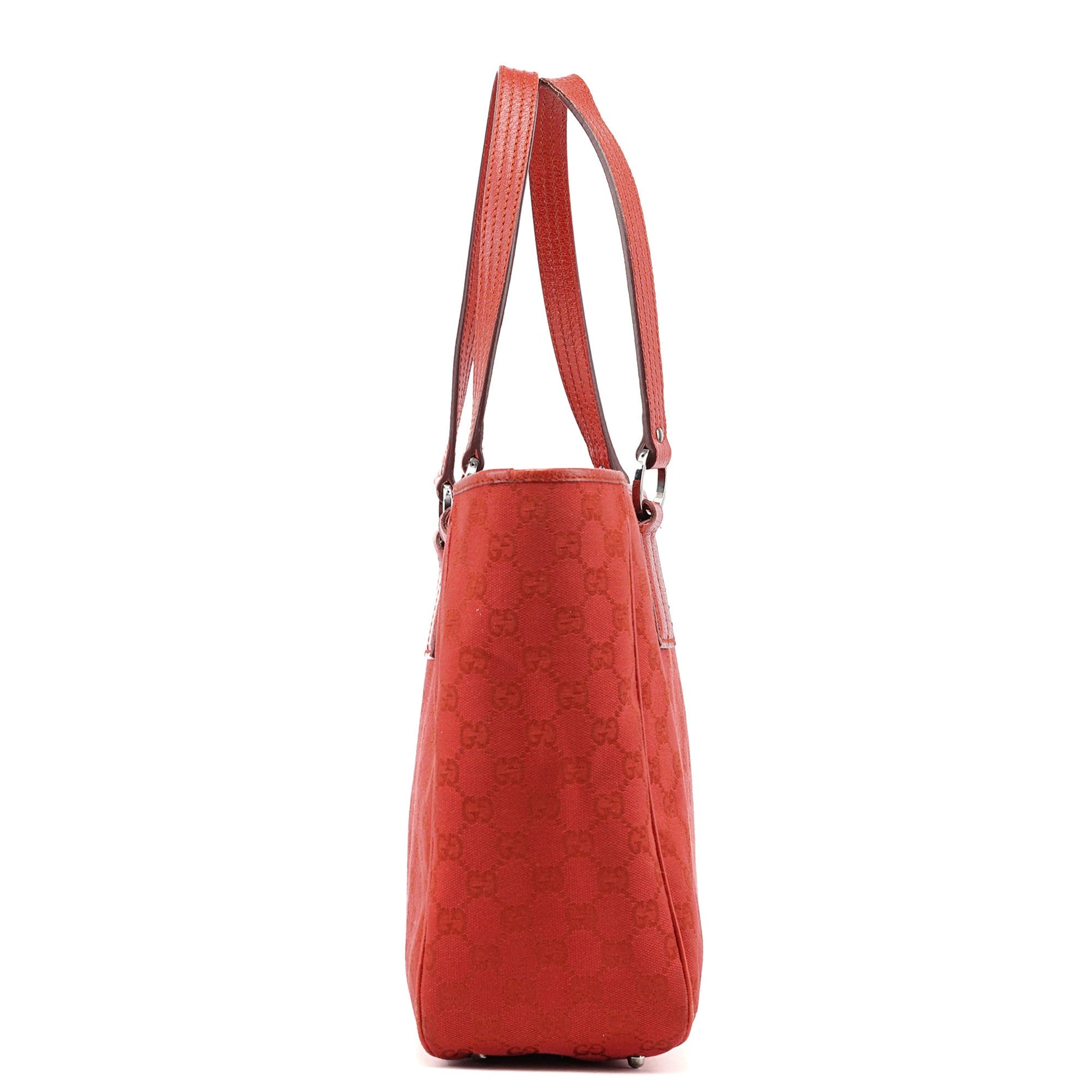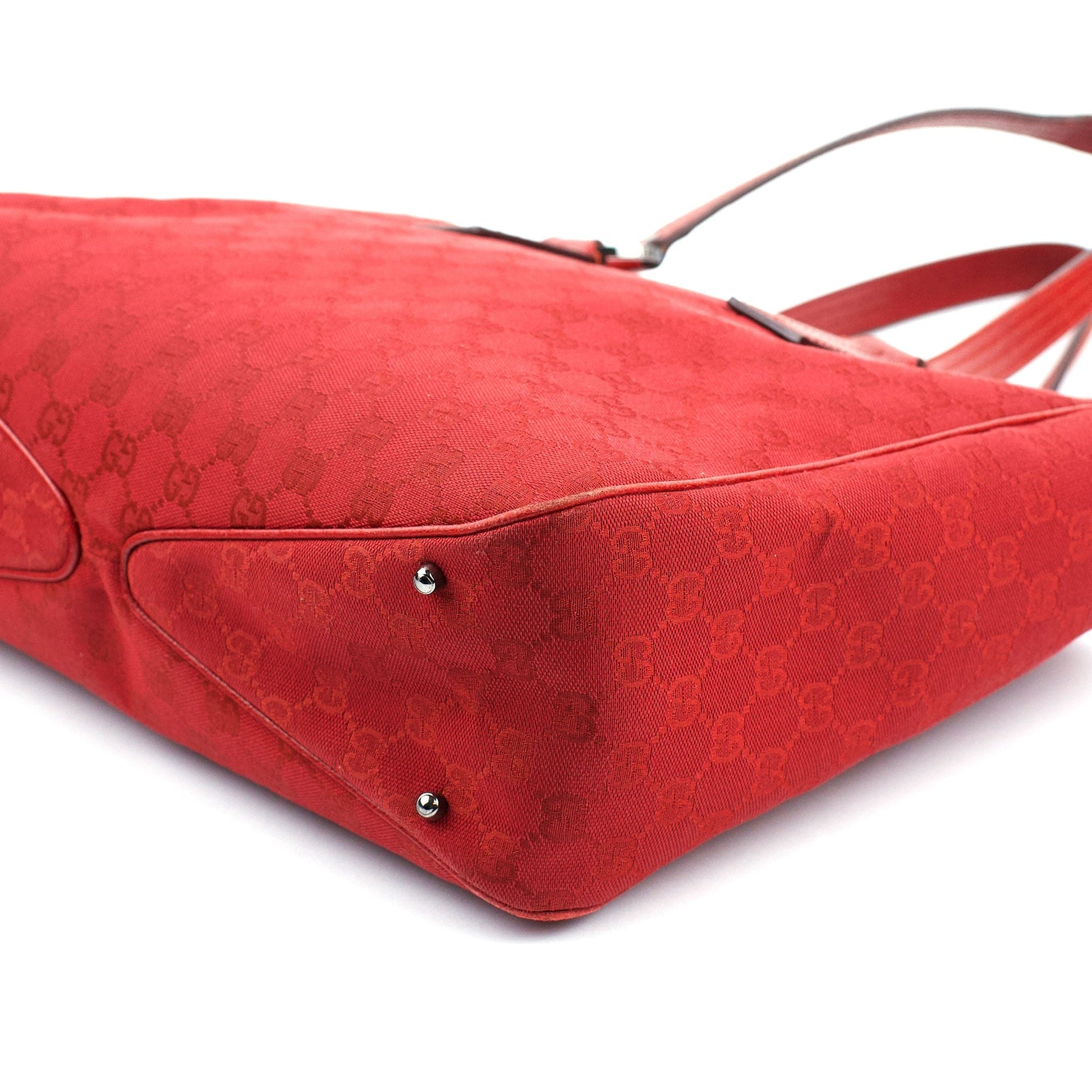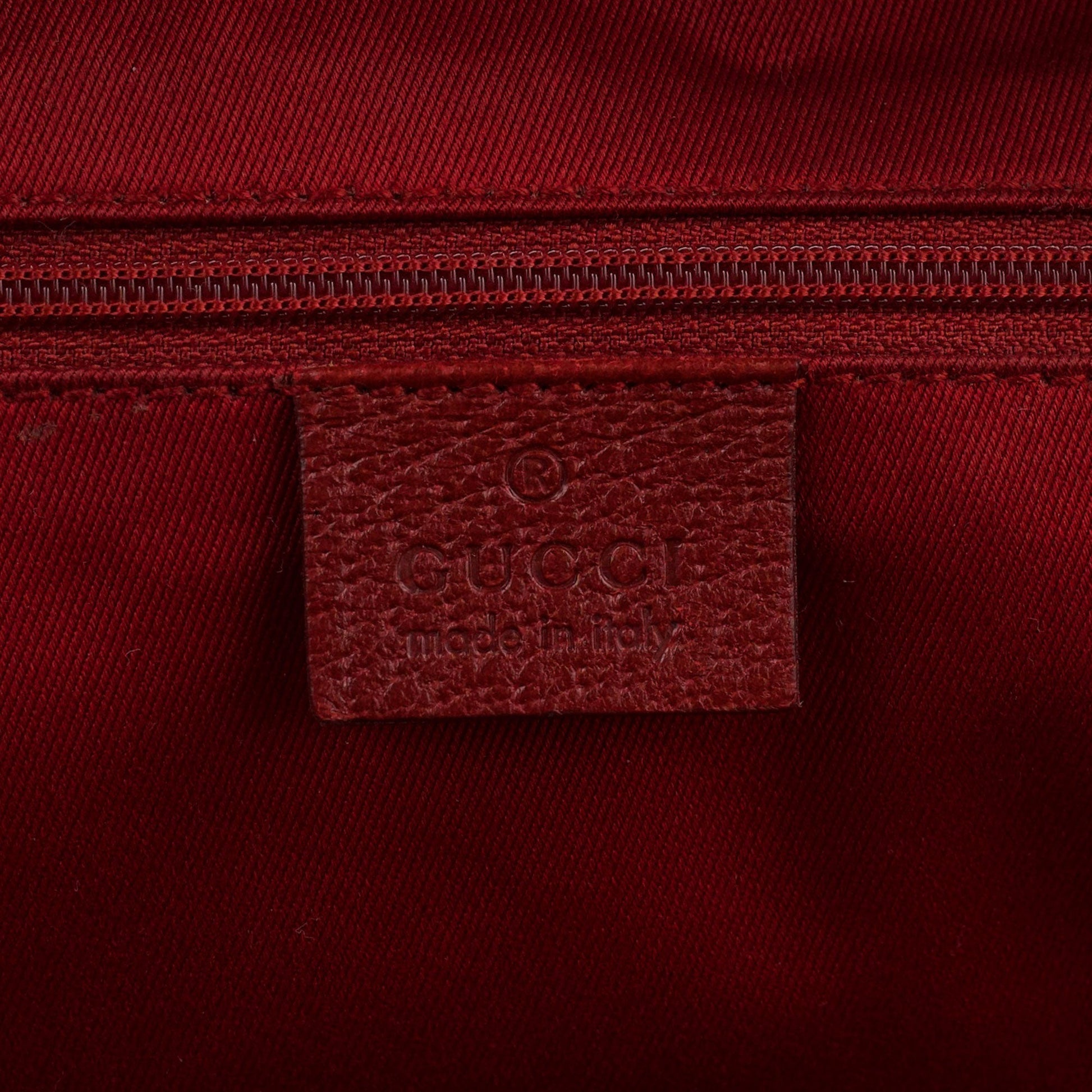 Designed by Tom Ford in the late 1990s, this Gucci GG monogram tote bag is handcrafted from red GG canvas with tonal calfskin leather trim. It features black-tone hardware and a cotton-lined interior with a zipper pocket for added functionality.