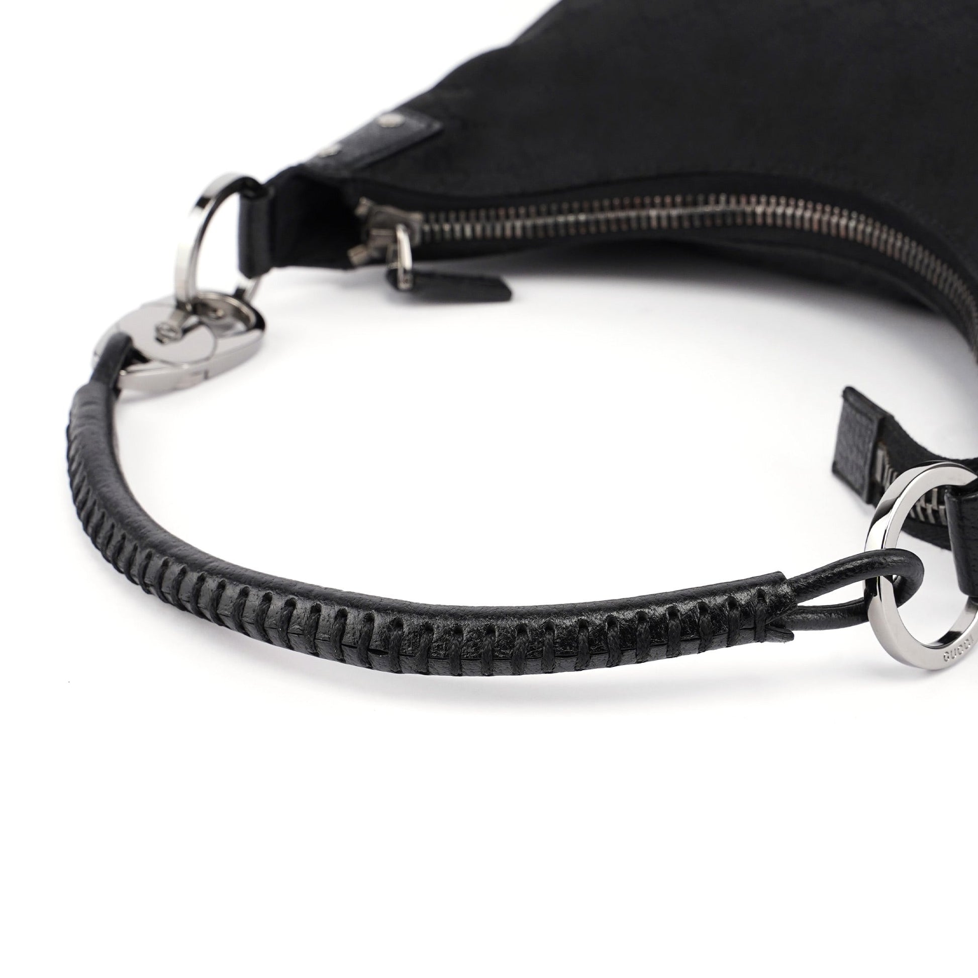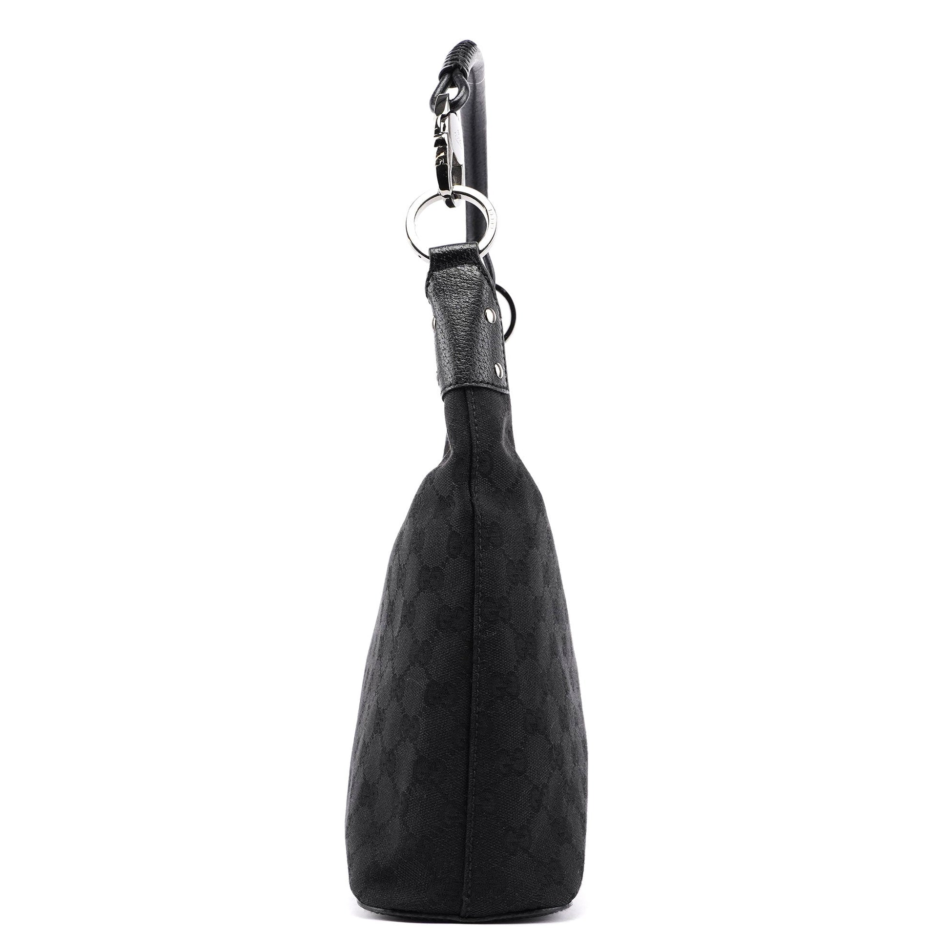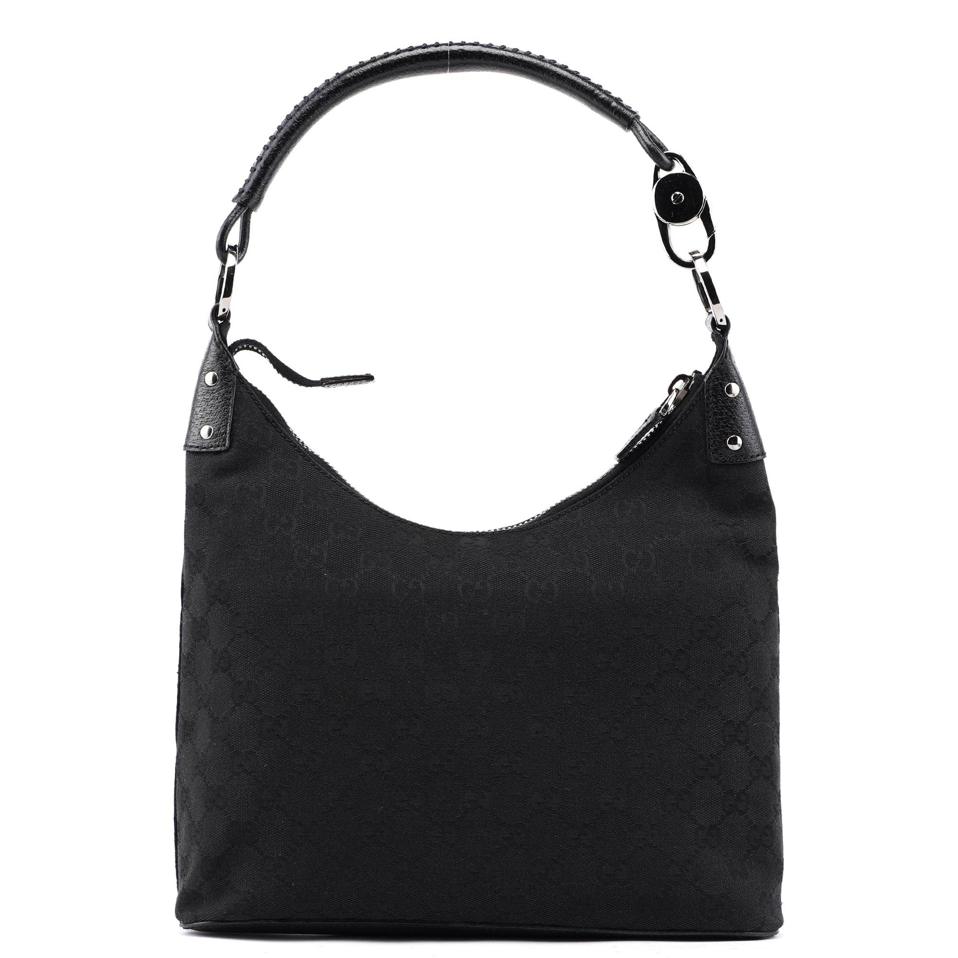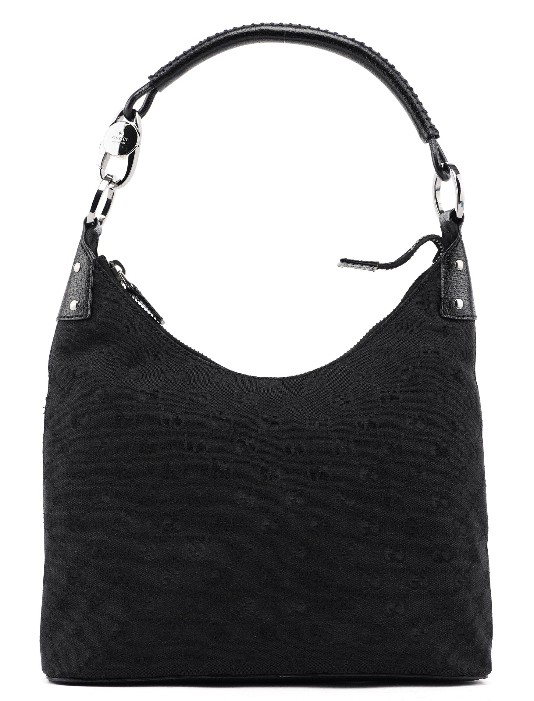 Designed by Tom Ford in the late '90s, this Gucci GG monogram bag is handcrafted from black GG canvas with tonal leather trim and silver-tone hardware engraved with the Gucci logo. It features a zipper closure, a cotton-lined interior, and an interior zipper pocket, showcasing timeless style and functional elegance.