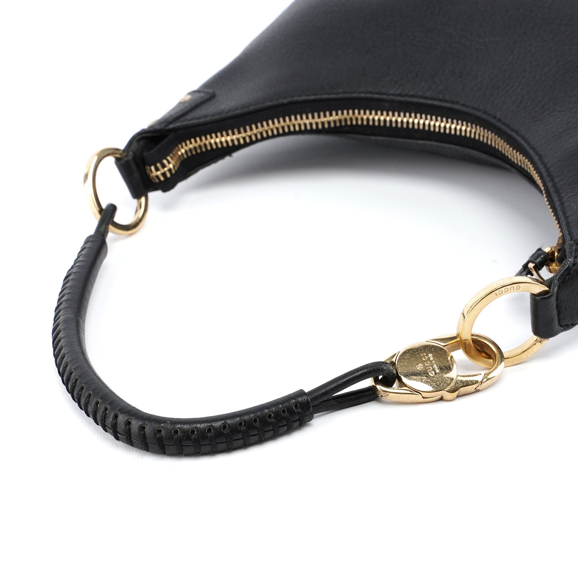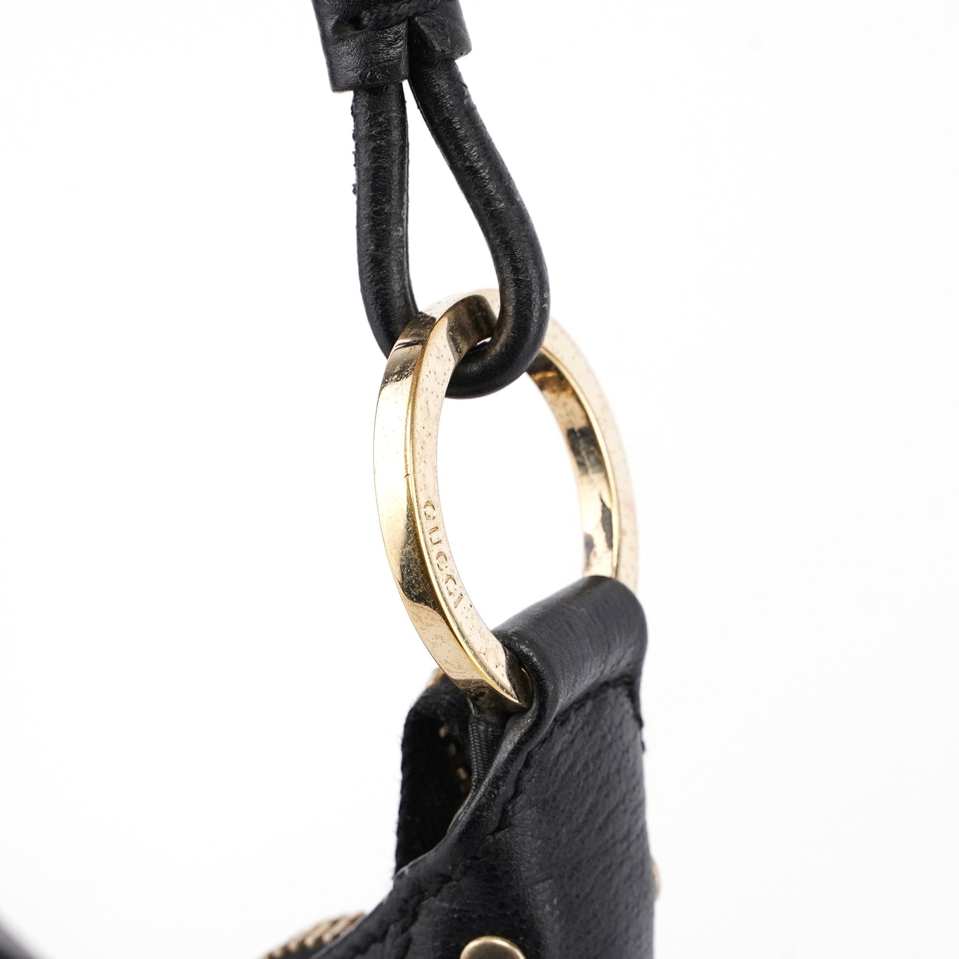 Designed by Tom Ford in the late '90s, this Gucci hobo shoulder bag is handcrafted from black leather and gold-tone hardware engraved with the Gucci logo. It features a zipper closure, a cotton-lined interior, and an interior zipper pocket, showcasing timeless style and functional elegance.