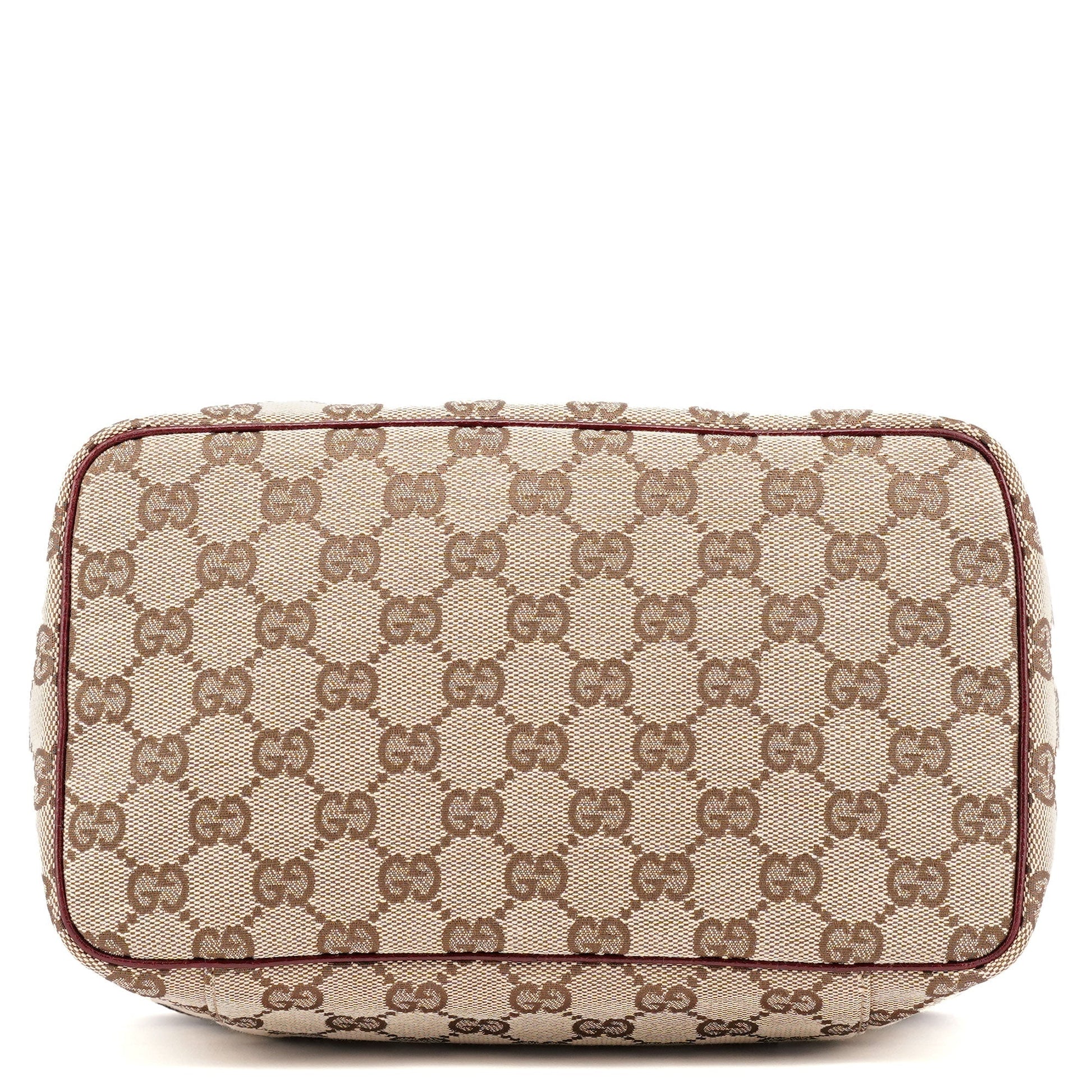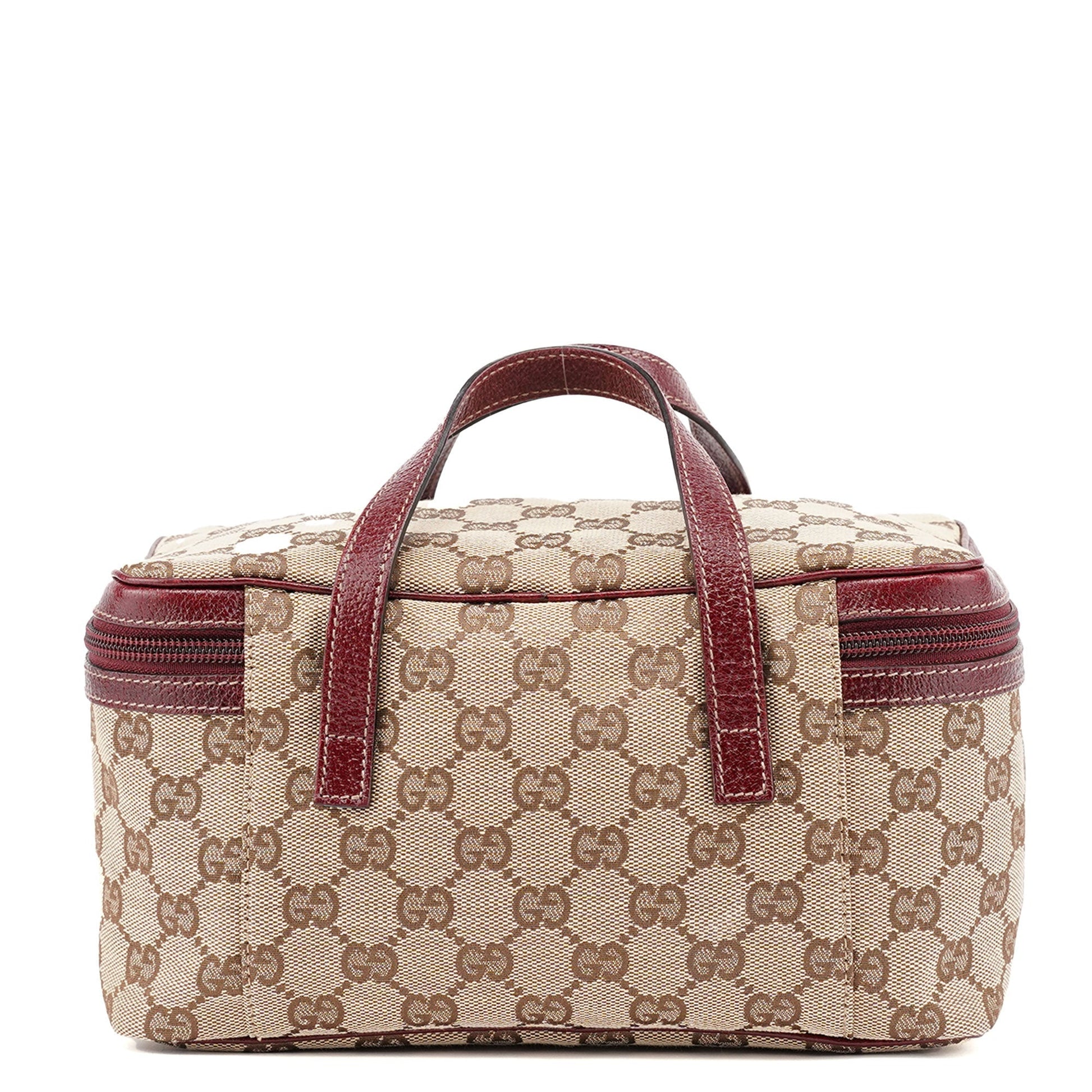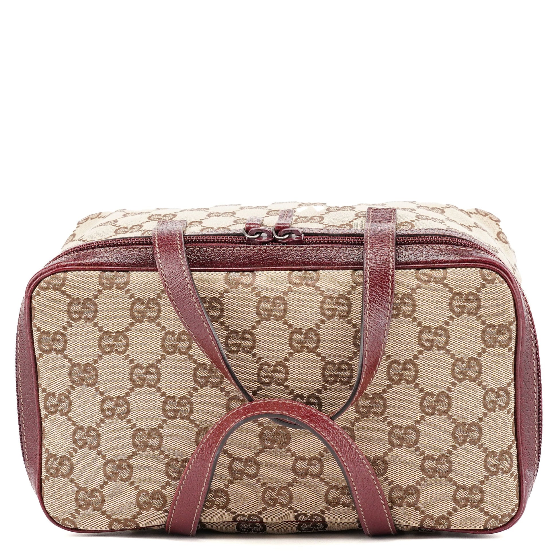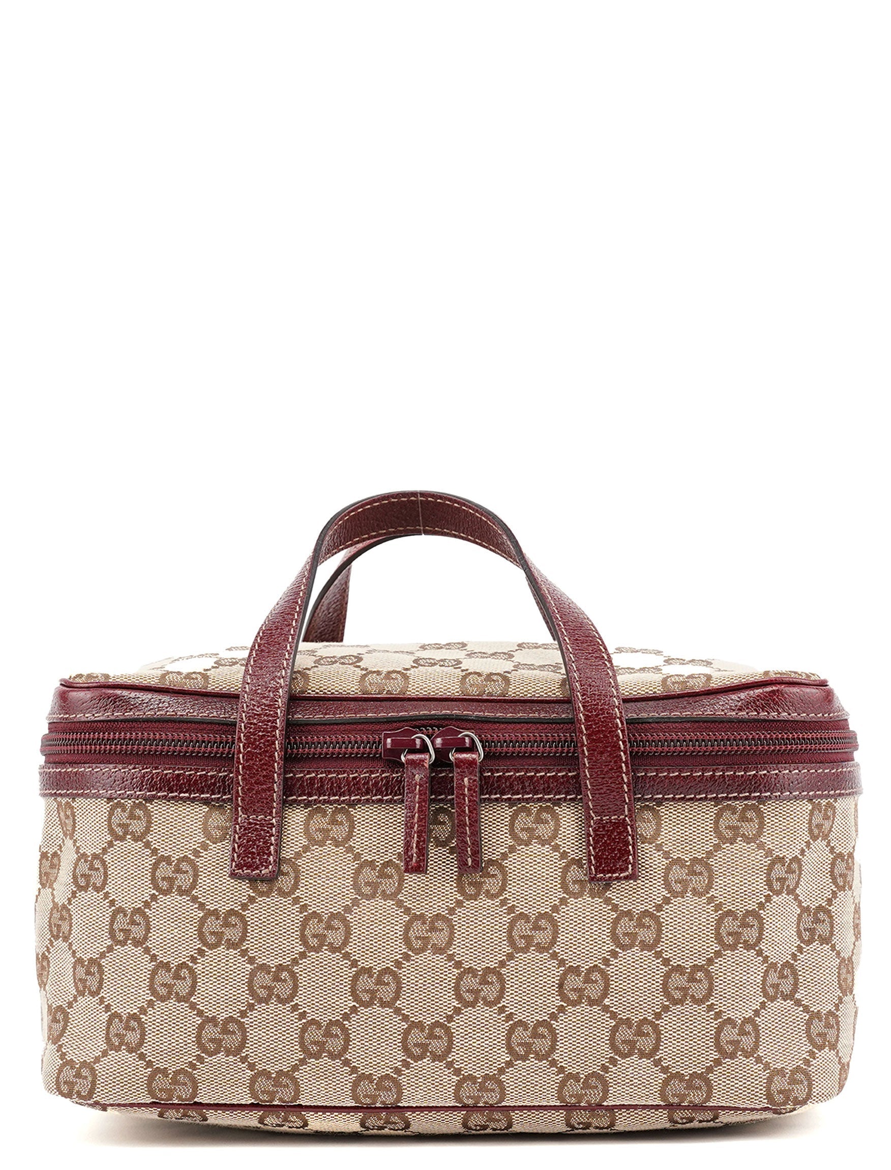 Designed in the early 2000s, this Gucci GG vanity bag is a design by Tom Ford. This bag is handcrafted from beige GG monogram canvas and burgundy leather trim. The double zipper opening leads to a satin-lined interior.