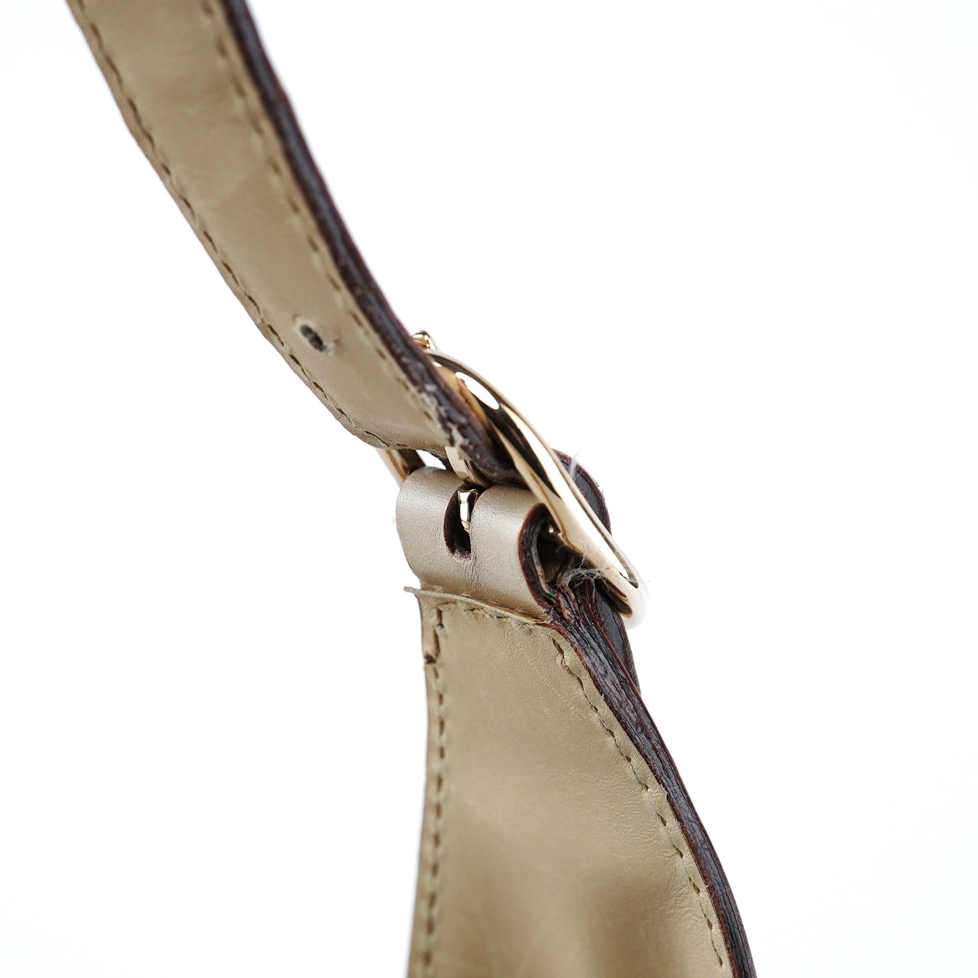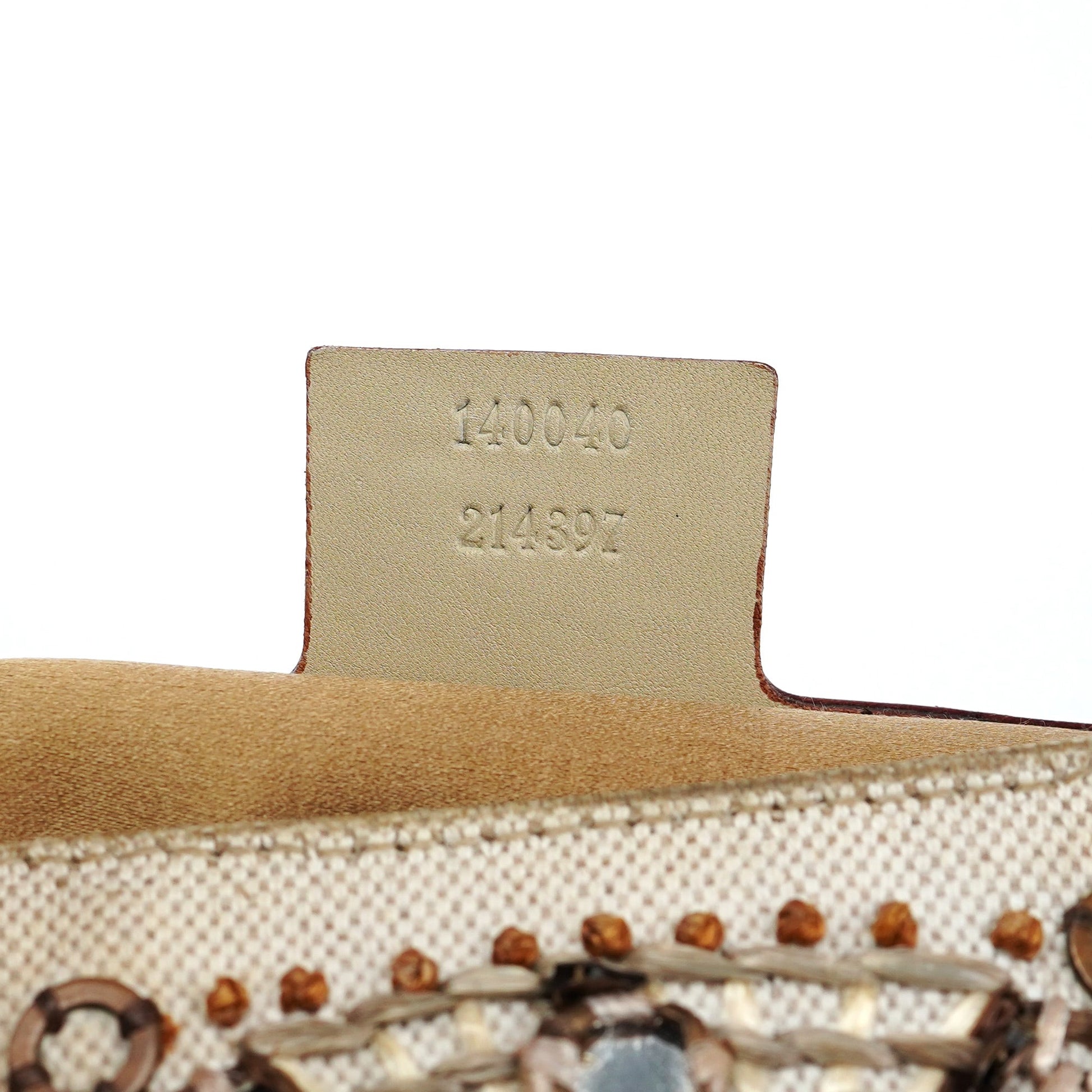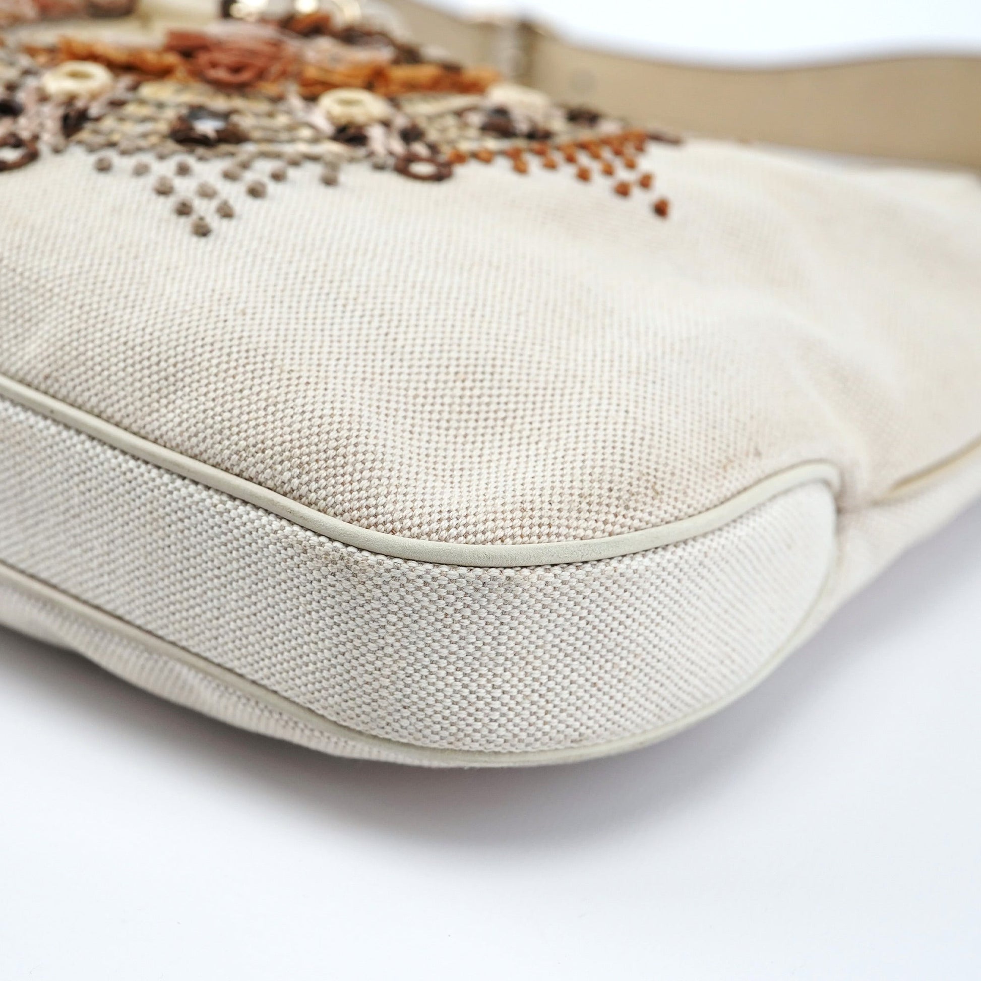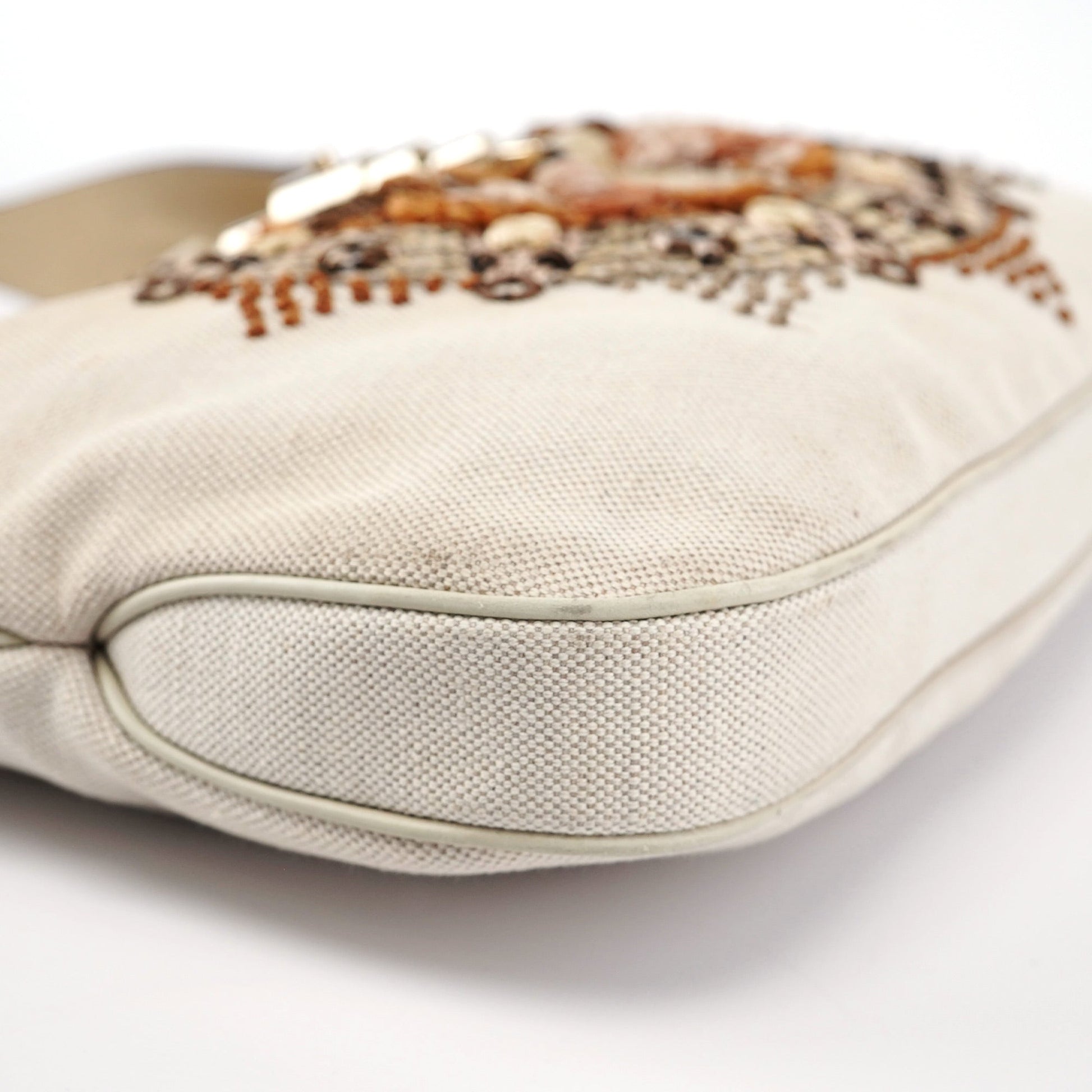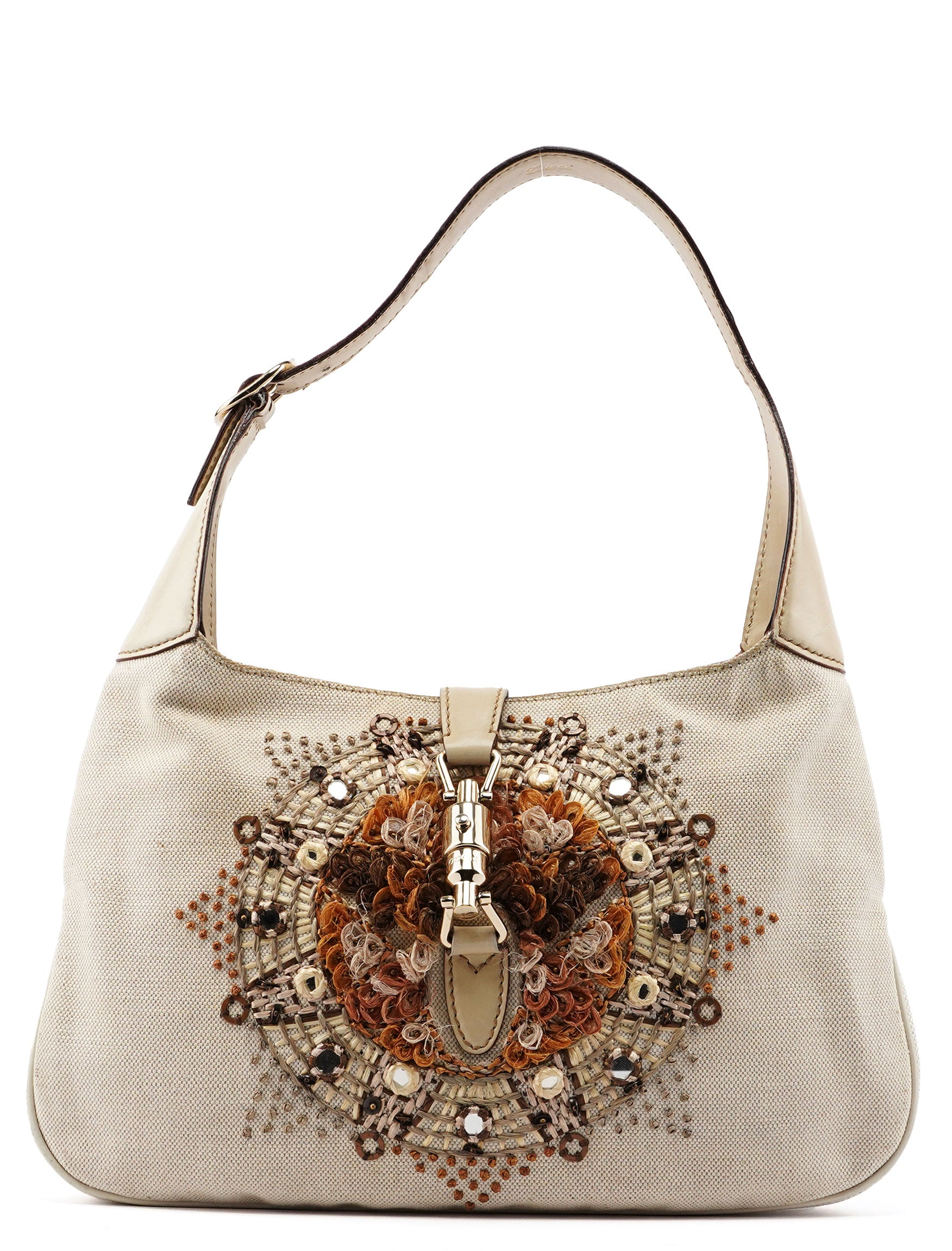 Discover the Gucci Jackie, originally designed by Tom Ford in the late 1990's. This iteration is handcrafted in beige canvas with embroidered sequin detailing, it features gold-tone hardware engraved with the Gucci logo and beige leather trim. The iconic Jackie-style closure opens to a silk-lined interior with a zipper pocket for organized storage.