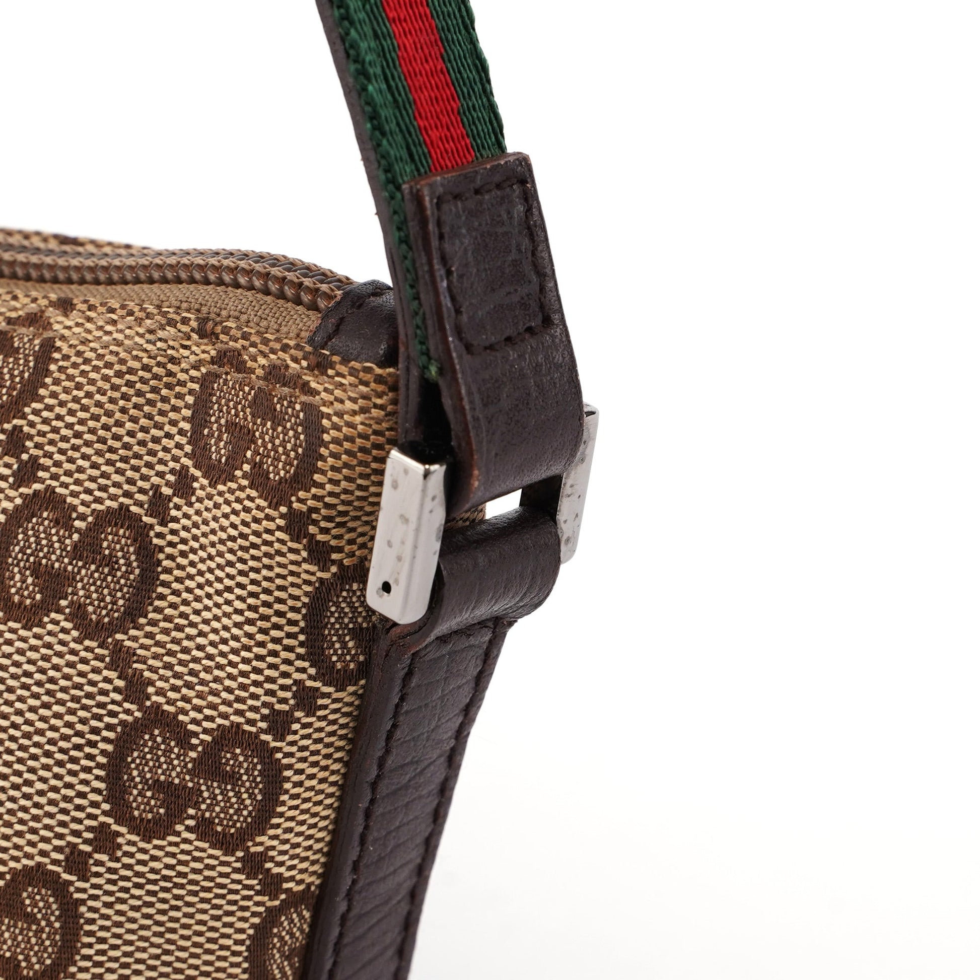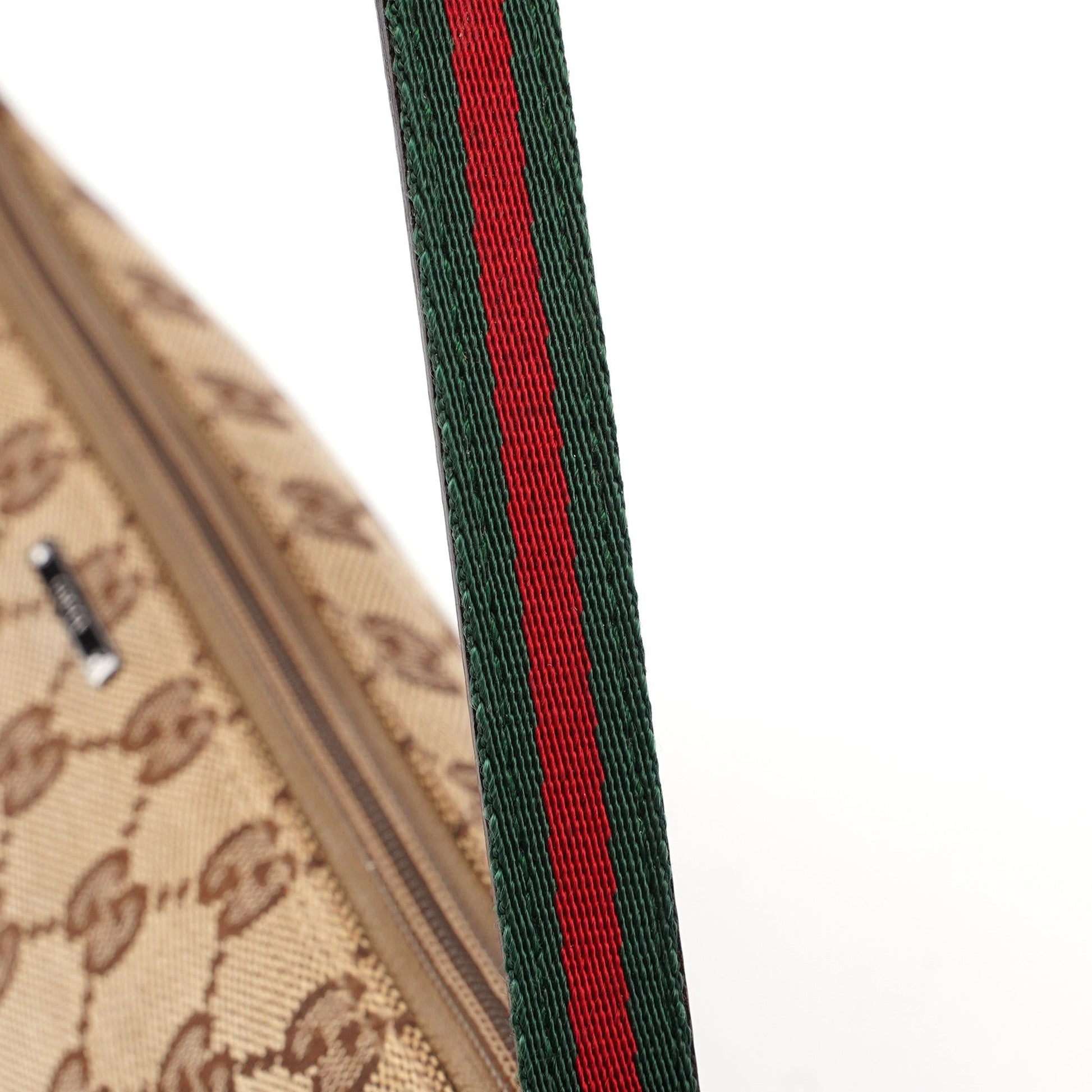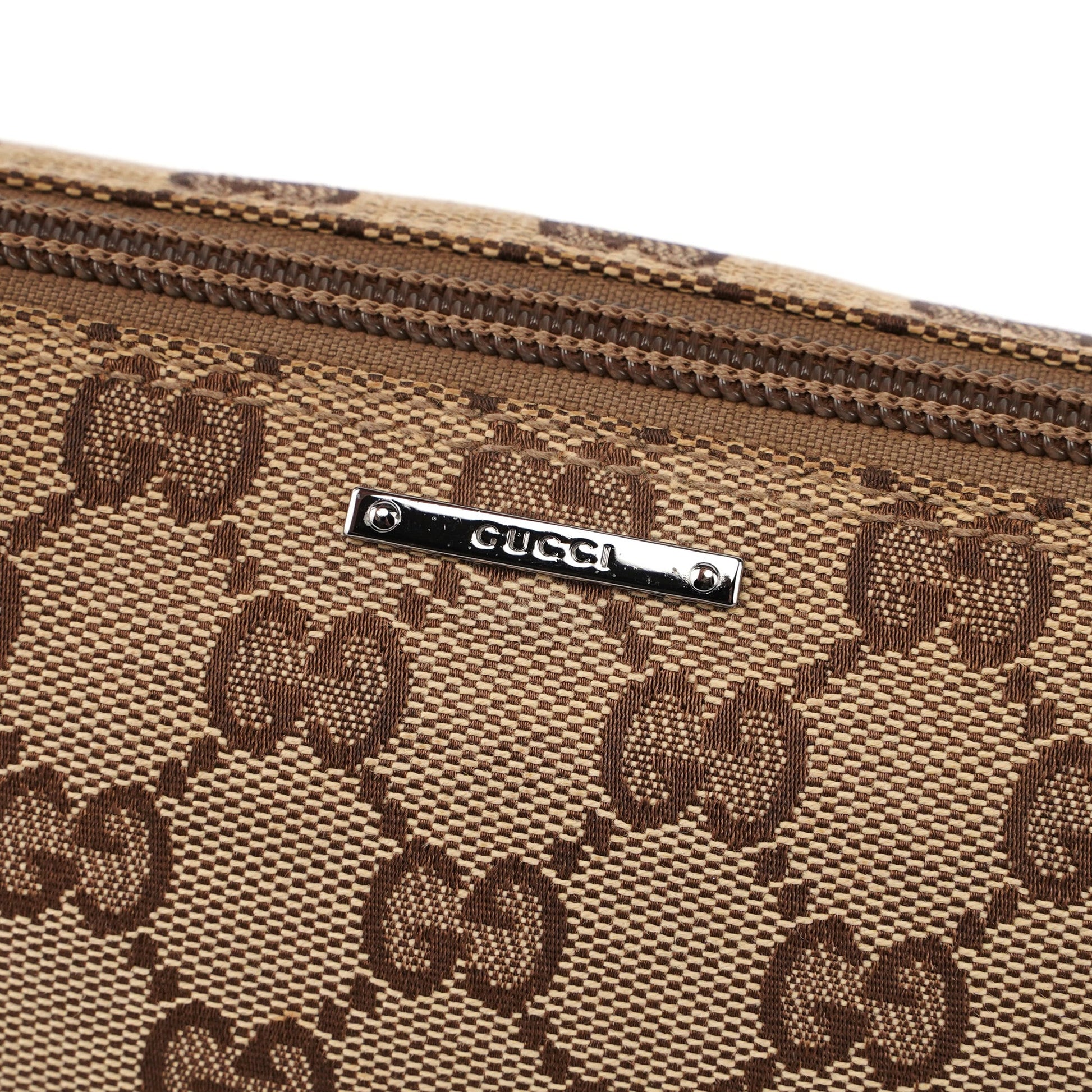 Explore timeless elegance with the Gucci GG Boat Pochette by Tom Ford, circa late 1990s. This exquisite piece combines beige GG canvas with brown leather trim and silver-tone hardware. Its secure zip closure and satin-lined interior offer luxury and practicality, while the subtle Gucci plaque adds a touch of heritage. A perfect blend of vintage charm and sophistication.