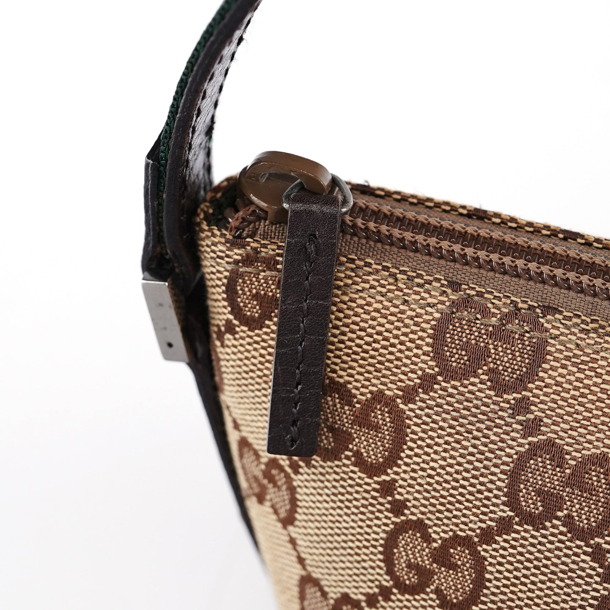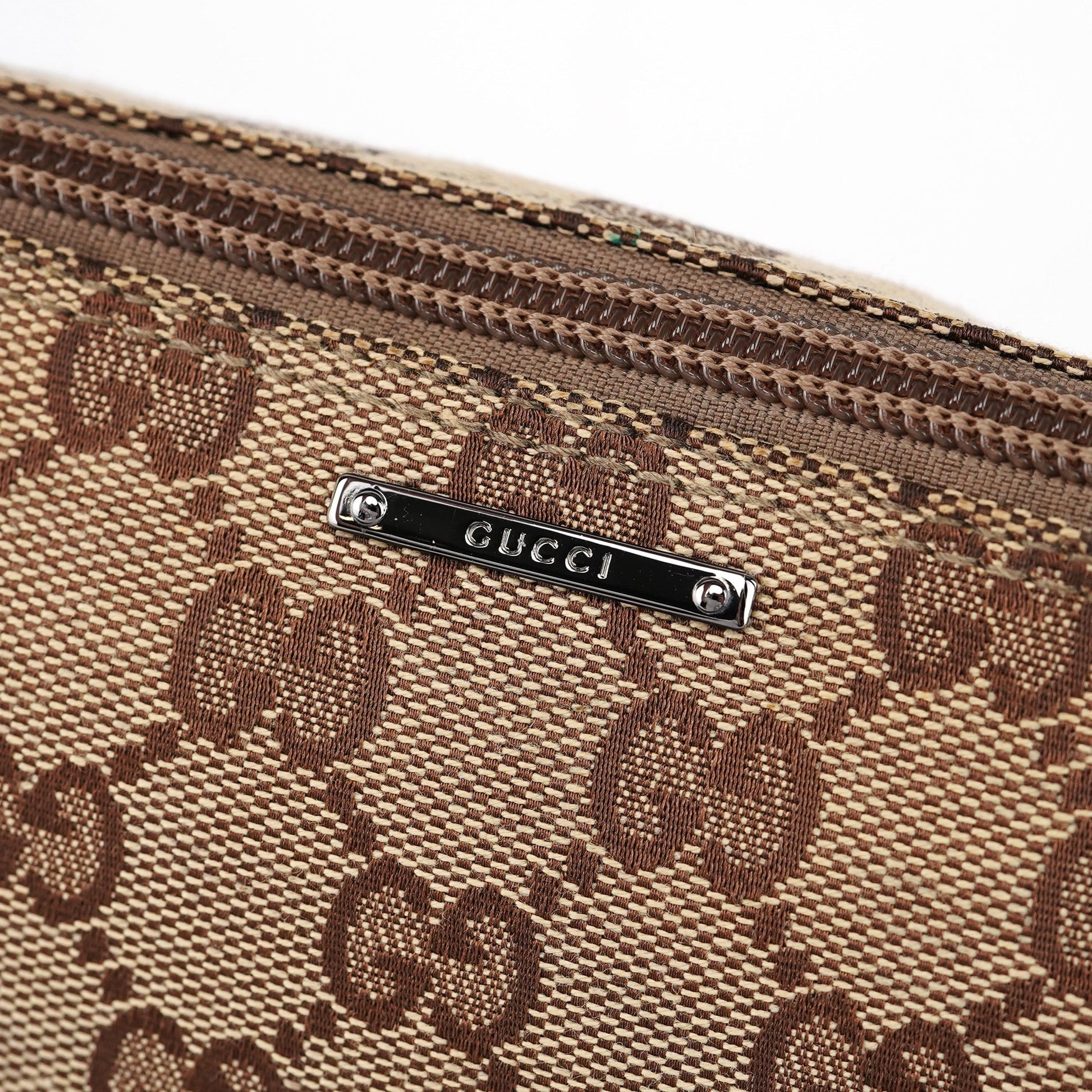 Explore timeless elegance with the Gucci GG Boat Pochette by Tom Ford, circa late 1990s. This exquisite piece combines beige GG canvas with brown leather trim and silver-tone hardware. Its secure zip closure and satin-lined interior offer luxury and practicality, while the subtle Gucci plaque adds a touch of heritage. A perfect blend of vintage charm and sophistication.