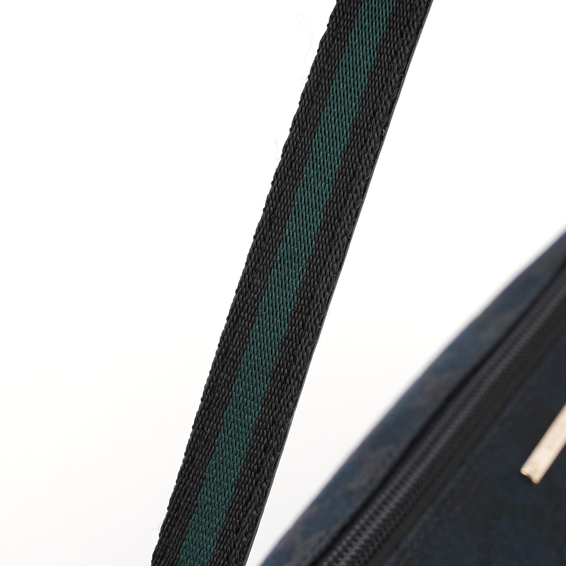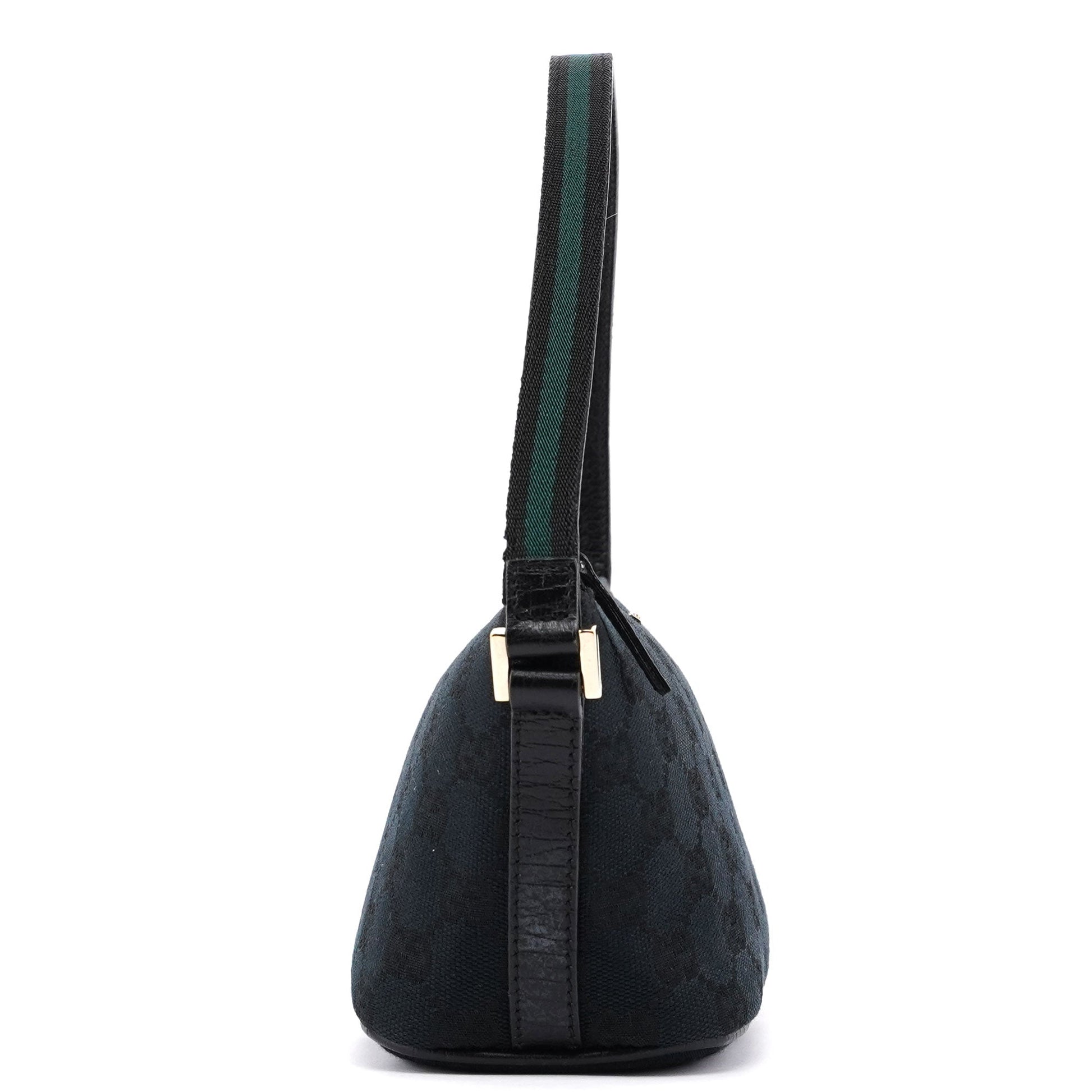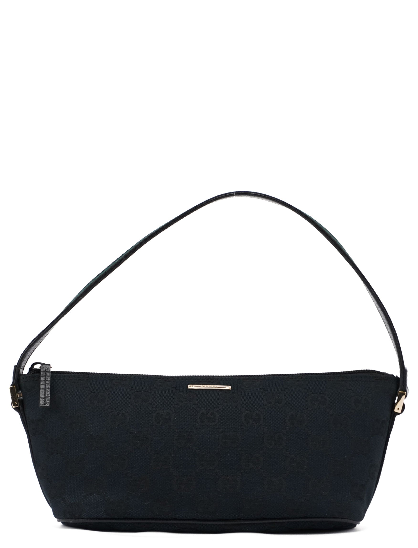 Explore timeless elegance with the Gucci GG Boat Pochette by Tom Ford, circa late 1990s. This exquisite piece combines black GG canvas with tonal leather trim, a black and green cotton handle and gold-tone hardware. Its secure zip closure and satin-lined interior offer luxury and practicality, while the subtle Gucci plaque adds a touch of heritage.
