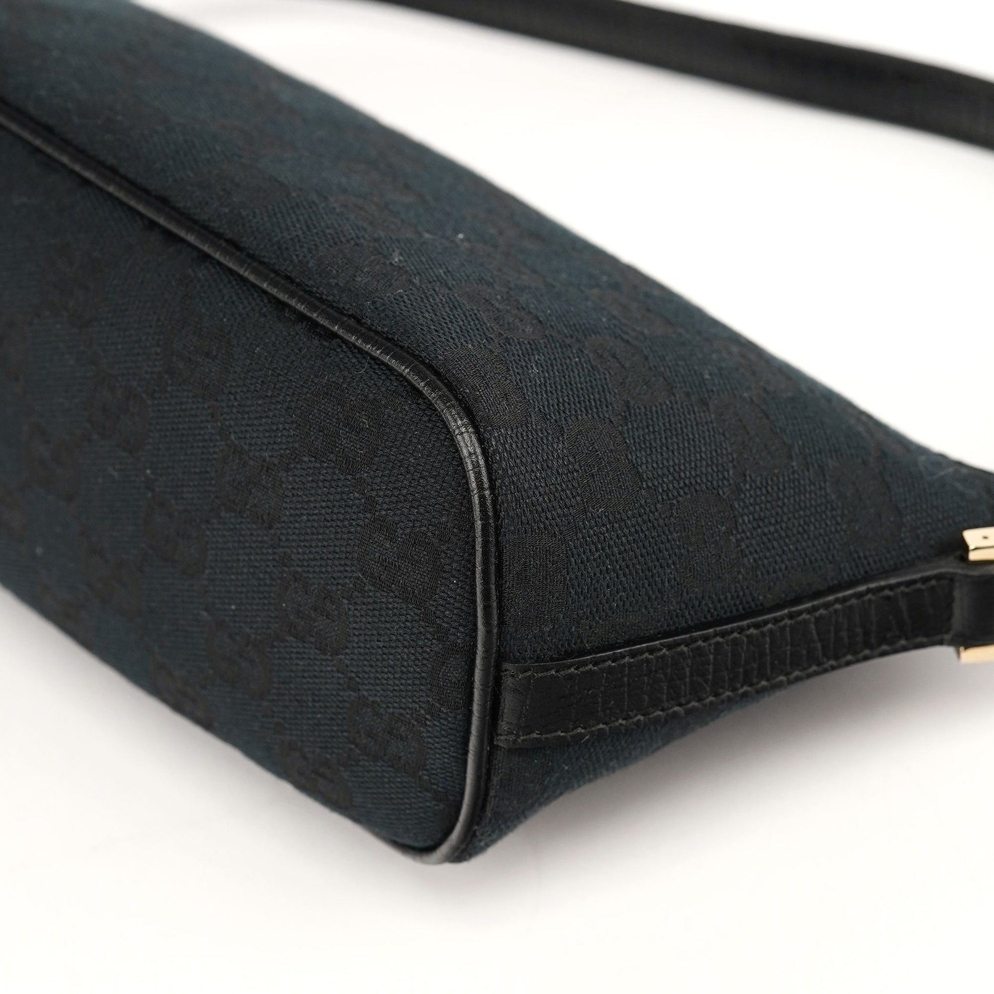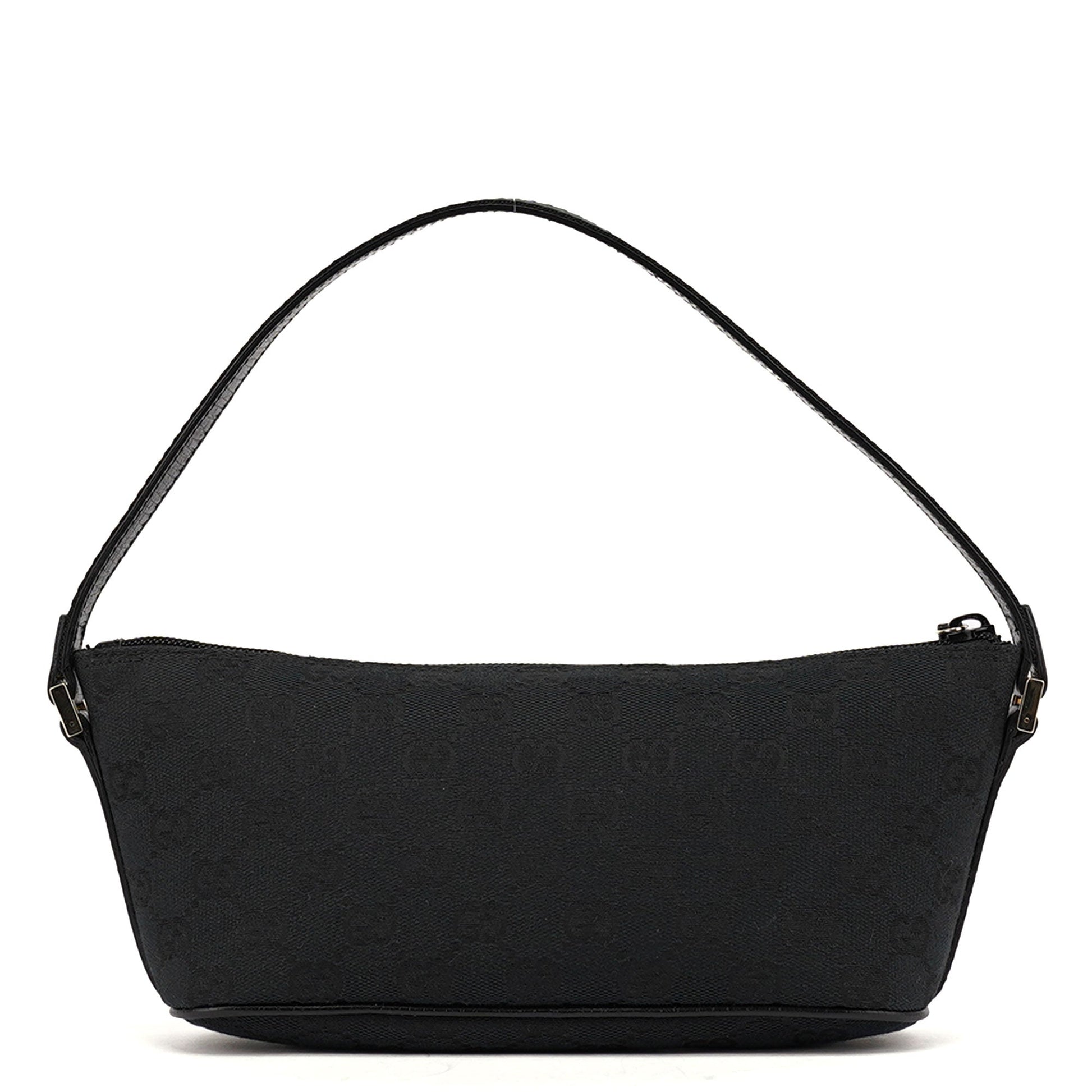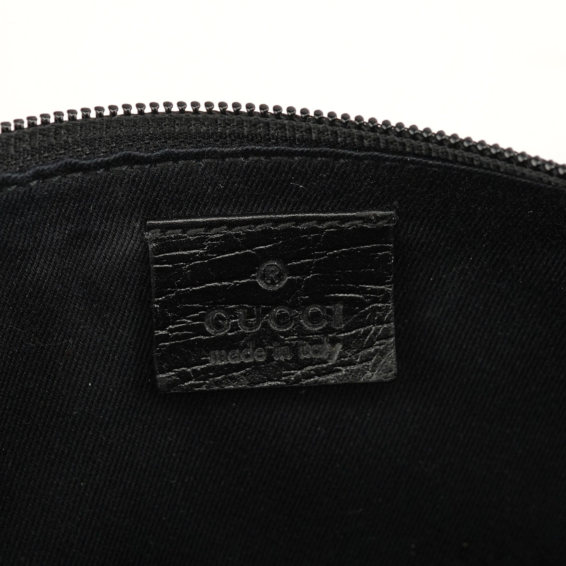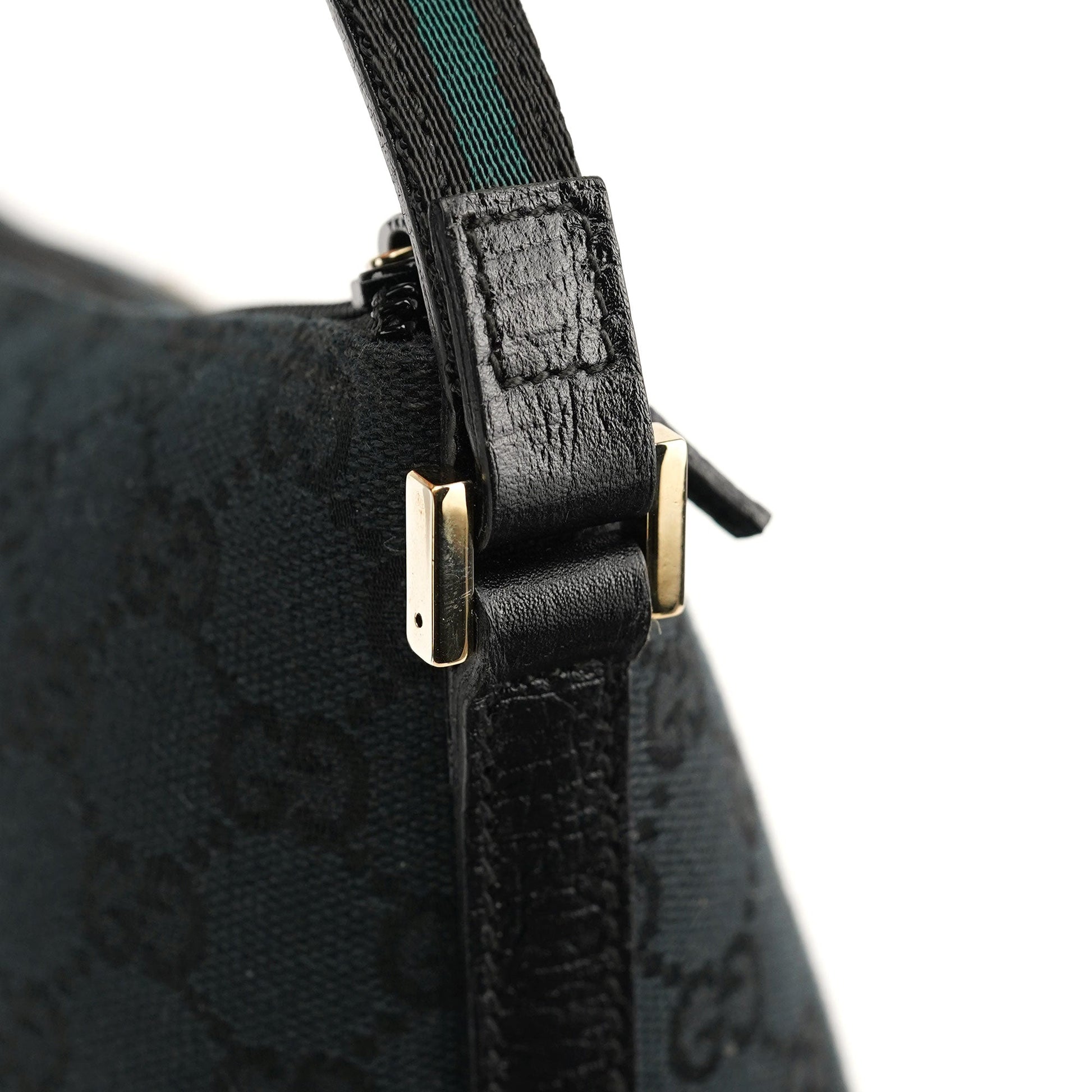 Explore timeless elegance with the Gucci GG Boat Pochette by Tom Ford, circa late 1990s. This exquisite piece combines black GG canvas with tonal leather trim, a black and green cotton handle and gold-tone hardware. Its secure zip closure and satin-lined interior offer luxury and practicality, while the subtle Gucci plaque adds a touch of heritage.