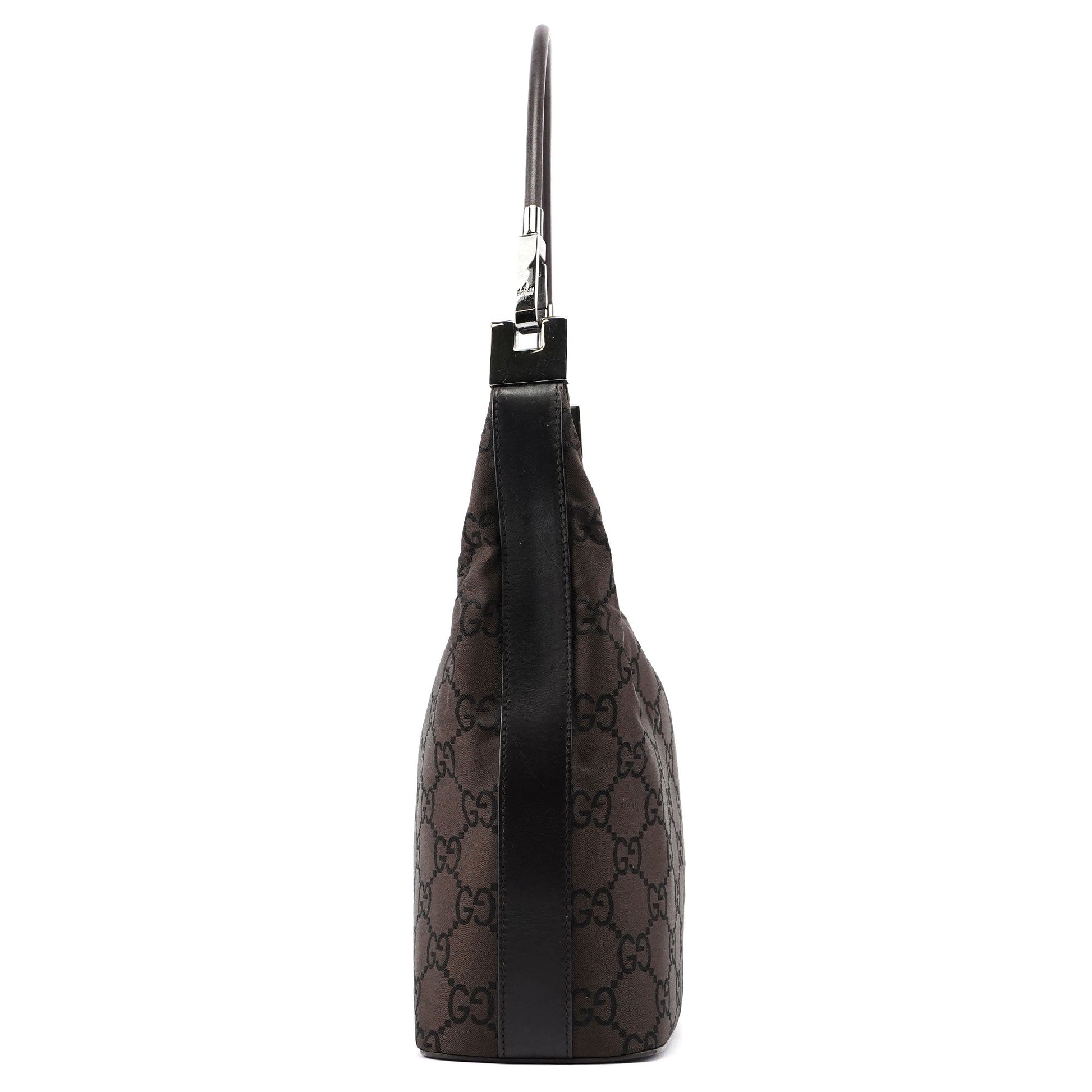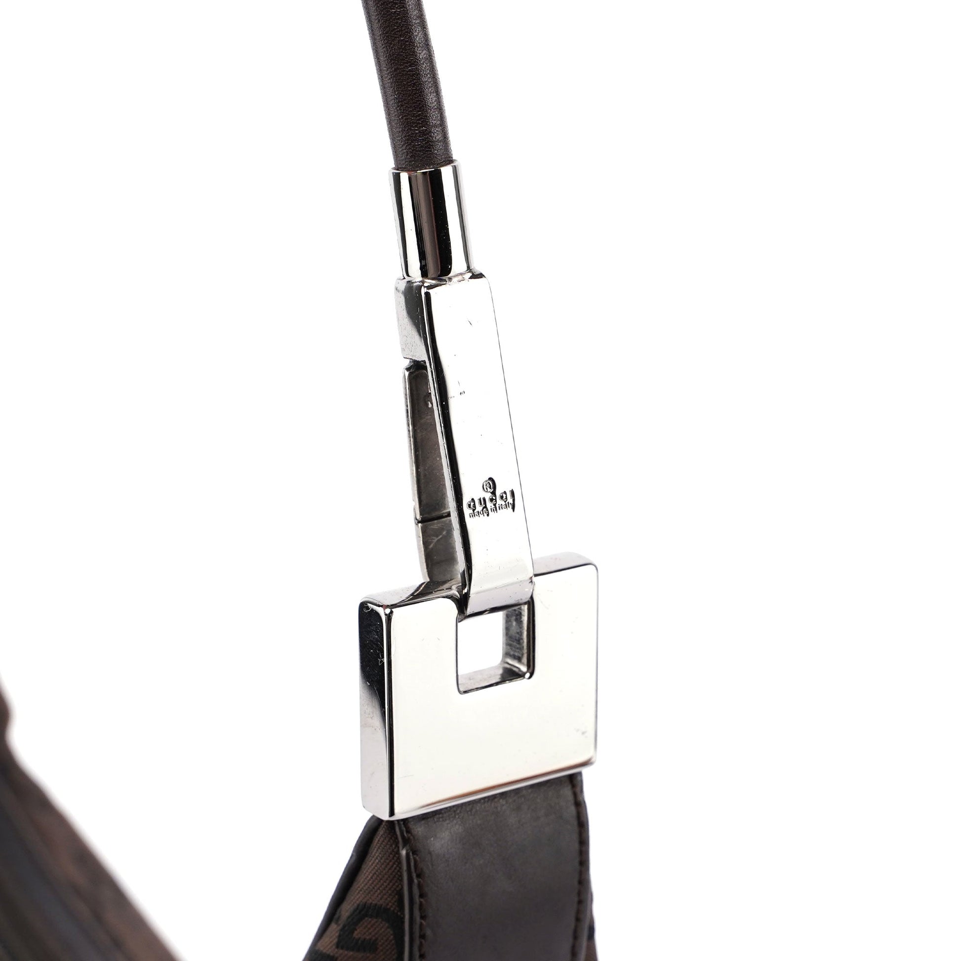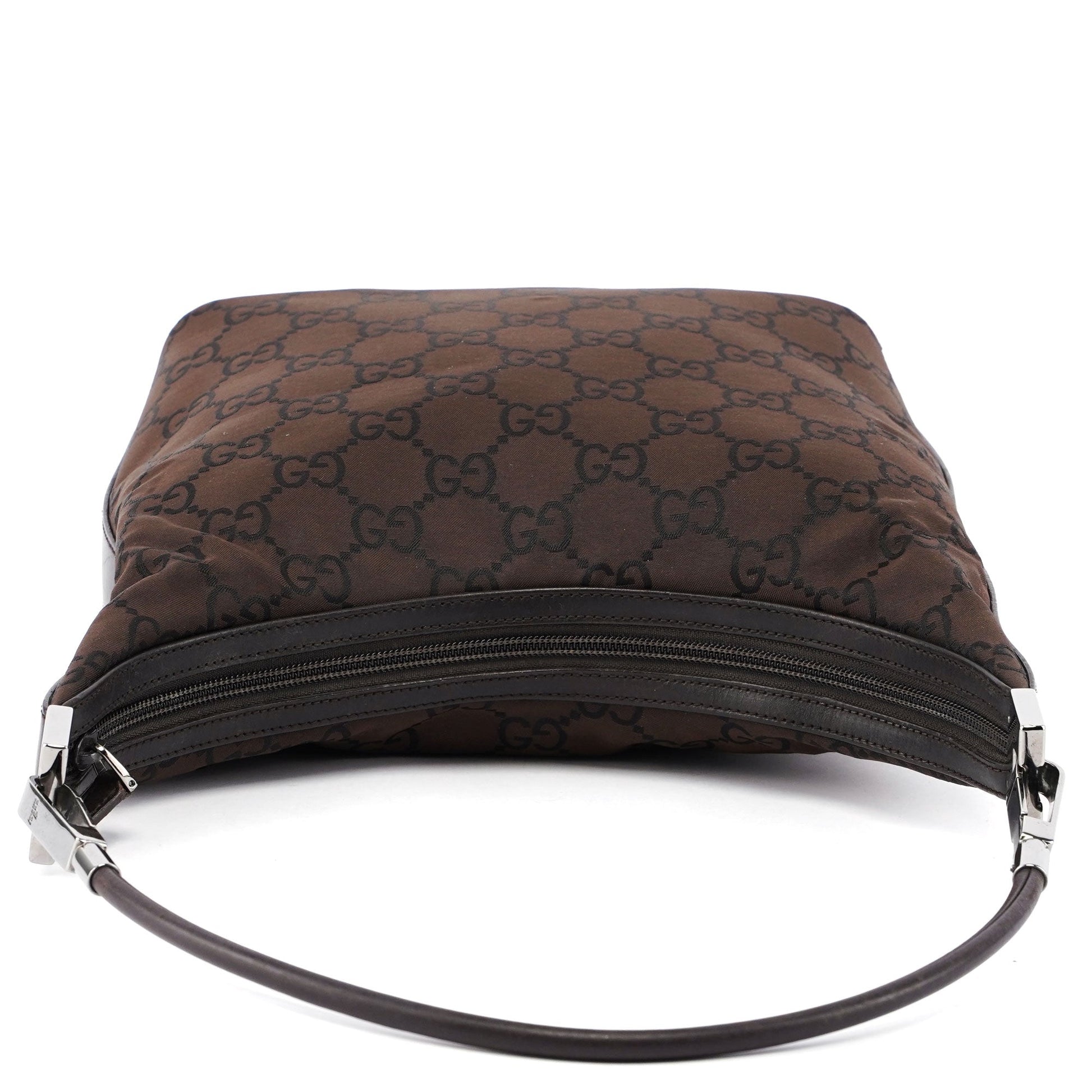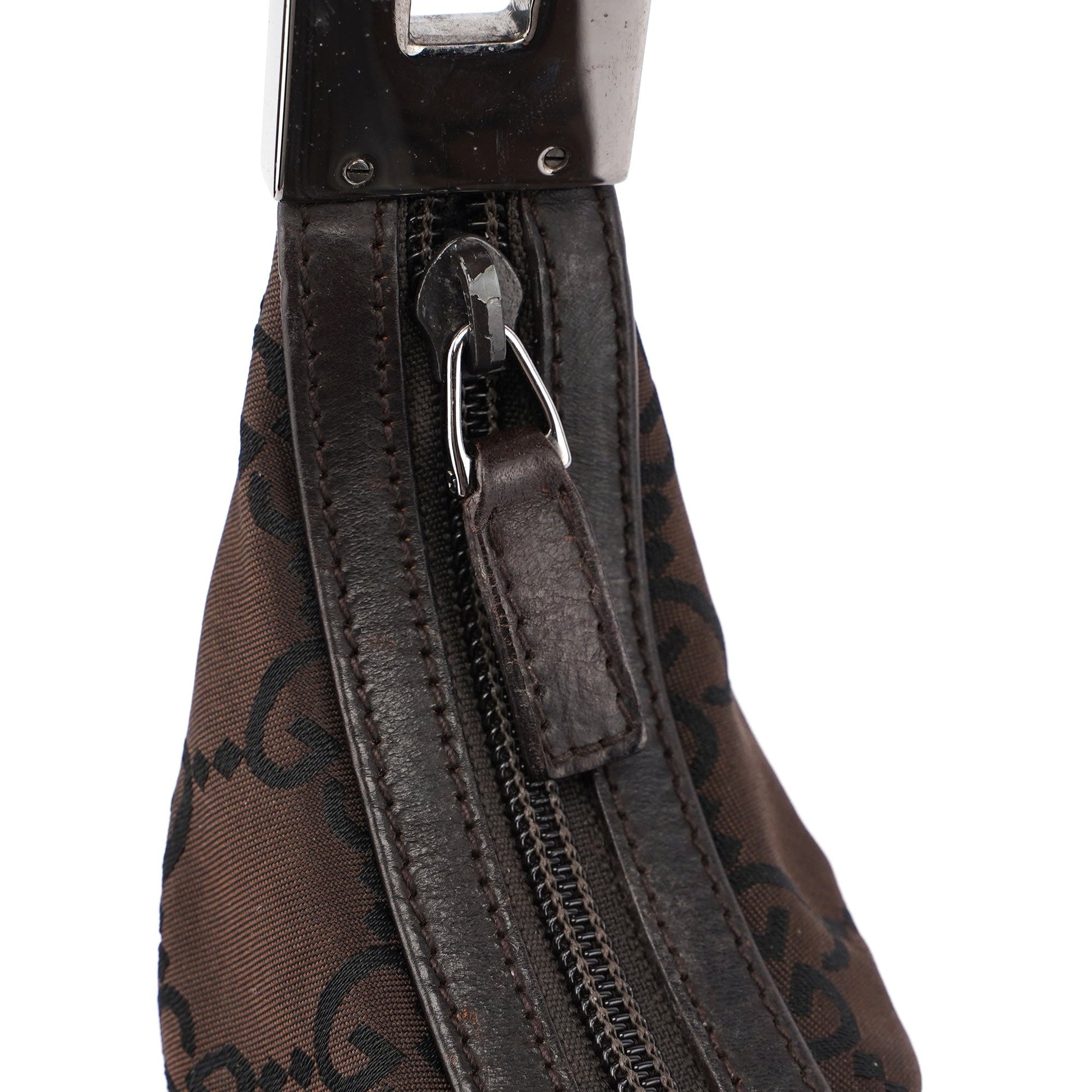 Designed by Tom Ford in the late '90s, the Gucci GG monogram shoulder bag exudes elegance. Handcrafted in brown GG monogram canvas with tonal leather trim and handle, it boasts silver-tone hardware engraved with the Gucci logo. The zipper closure opens to a monogram cotton interior featuring an interior zipper pocket.