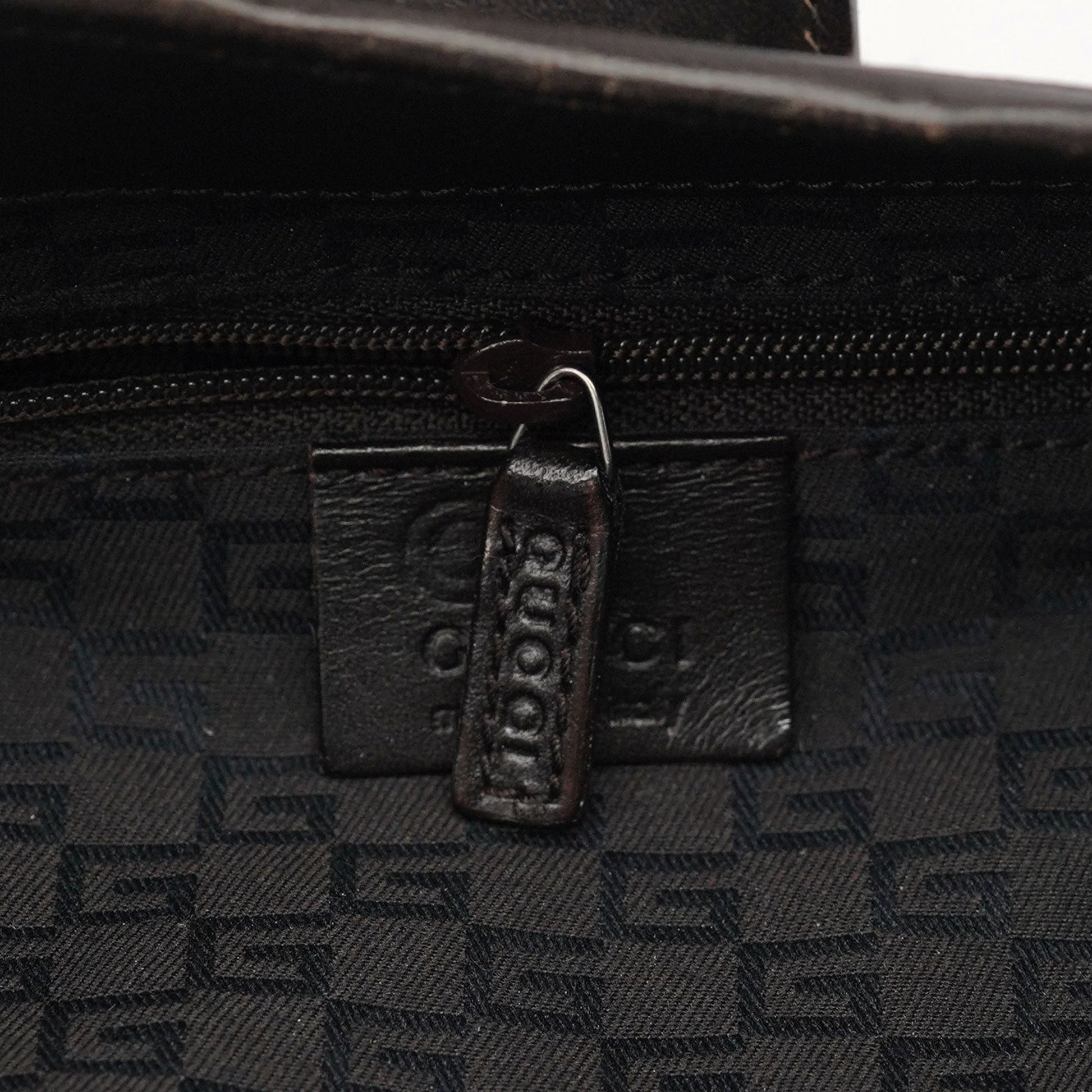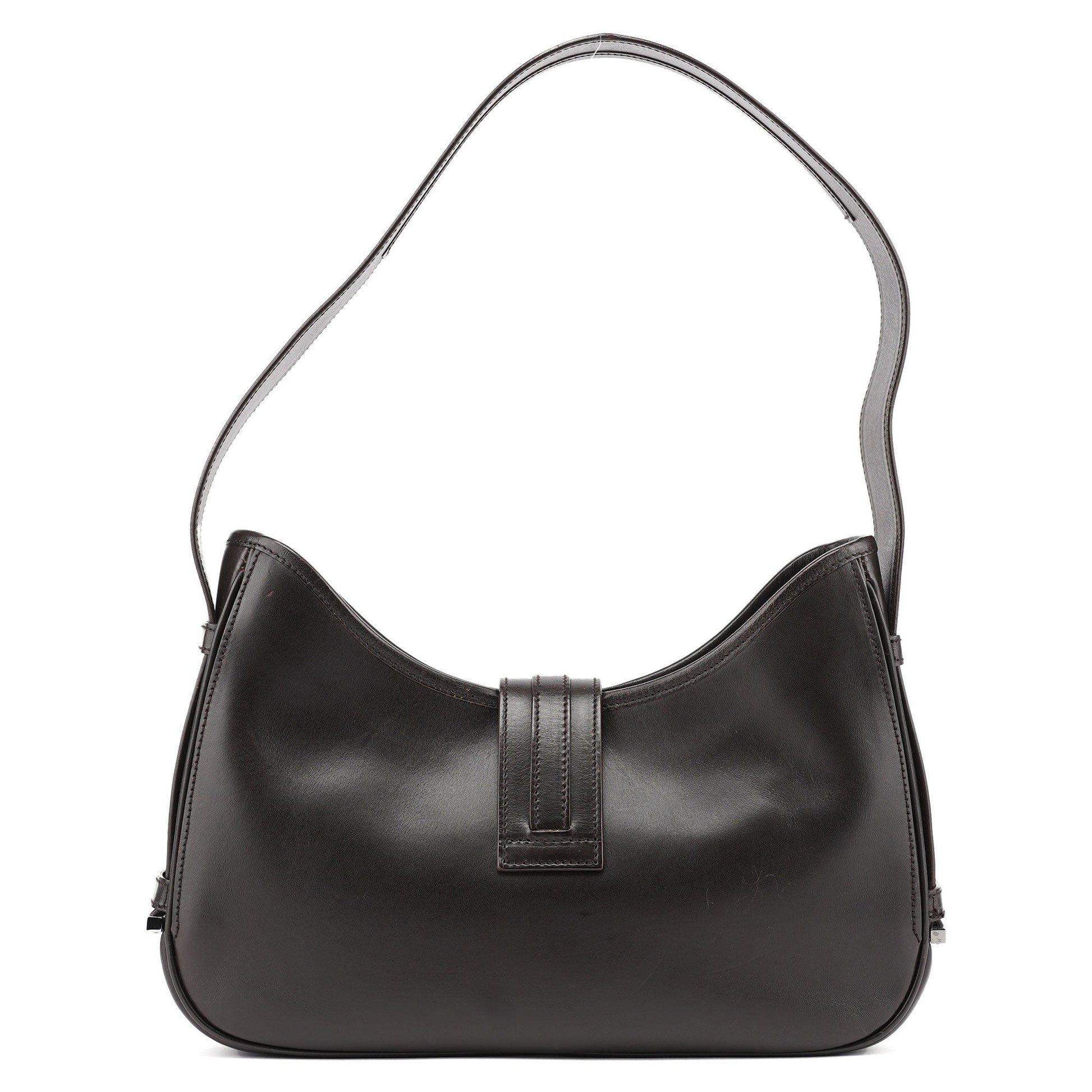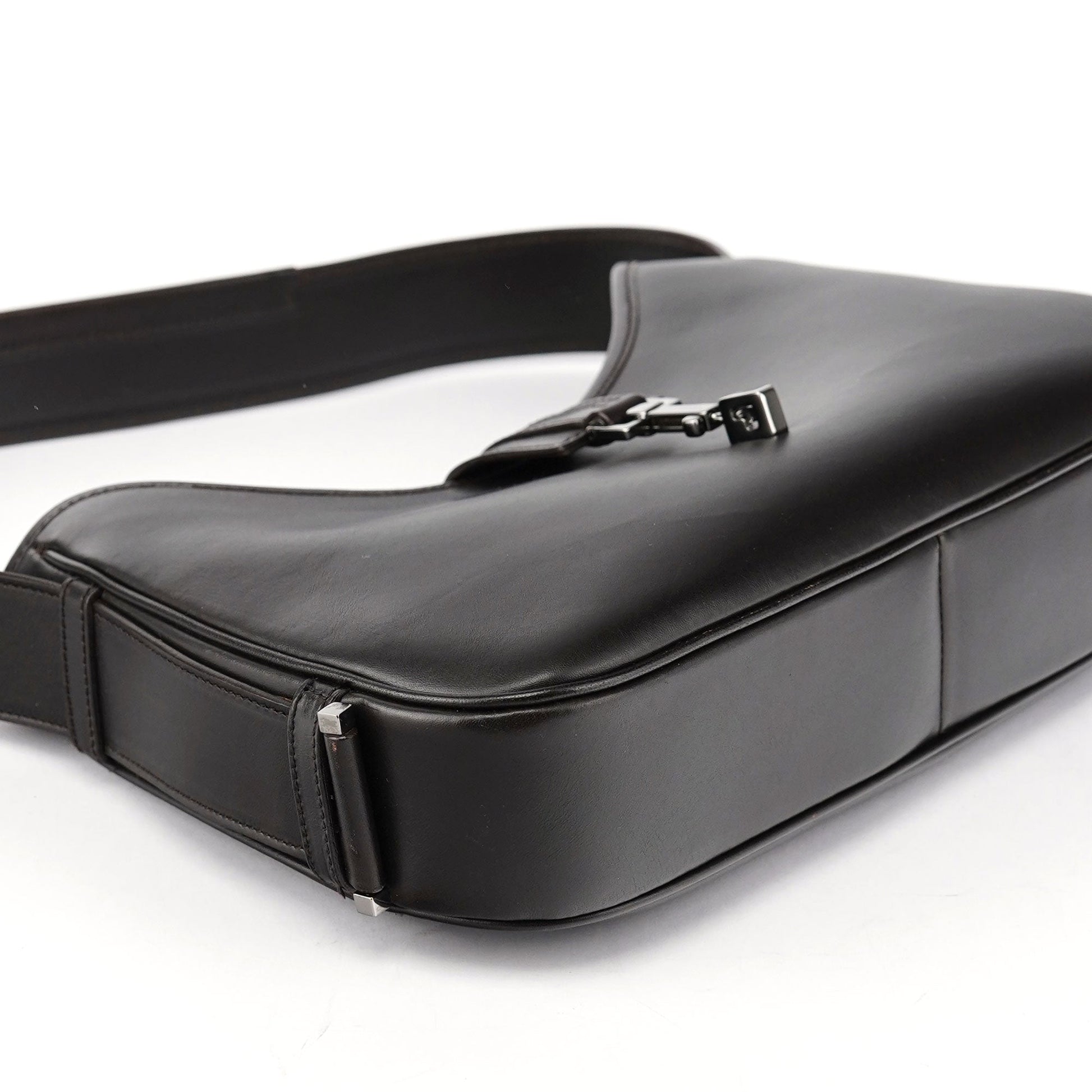 Designed by Tom Ford in the early 2000s, the Gucci Jackie shoulder bag exudes sophistication. Made from brown calfskin leather with silver-tone hardware engraved with the iconic Gucci logo, it features the signature Jackie clasp closure. Inside, the satin-lined interior offers practicality with a convenient interior zipper pocket.