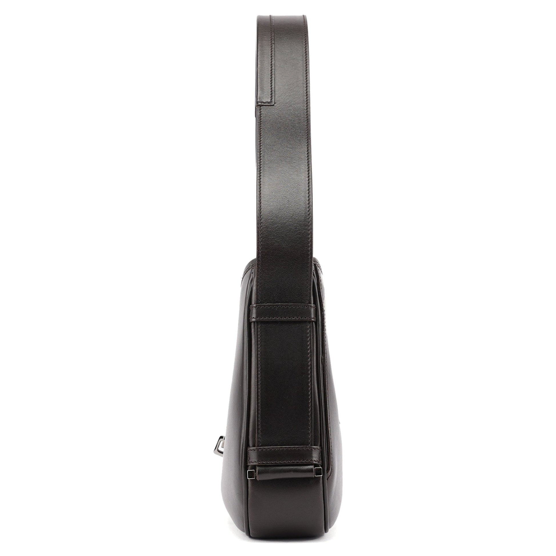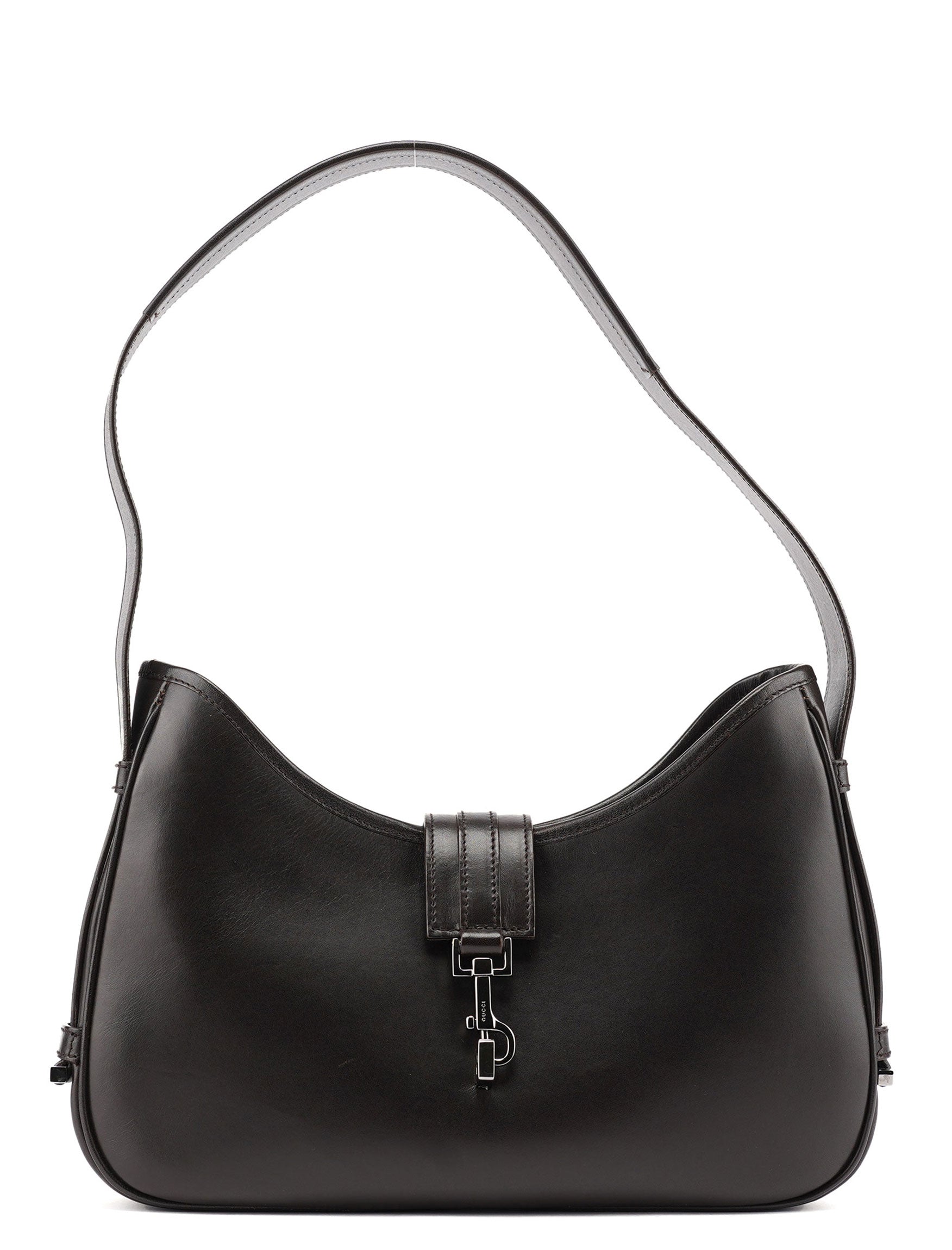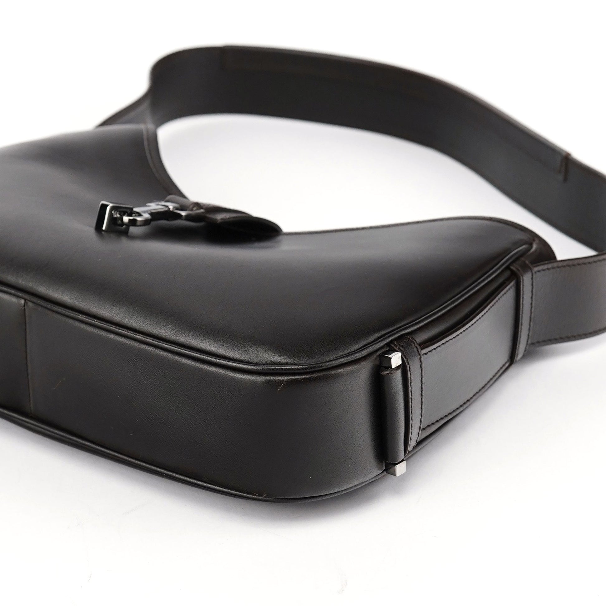 Designed by Tom Ford in the early 2000s, the Gucci Jackie shoulder bag exudes sophistication. Made from brown calfskin leather with silver-tone hardware engraved with the iconic Gucci logo, it features the signature Jackie clasp closure. Inside, the satin-lined interior offers practicality with a convenient interior zipper pocket.