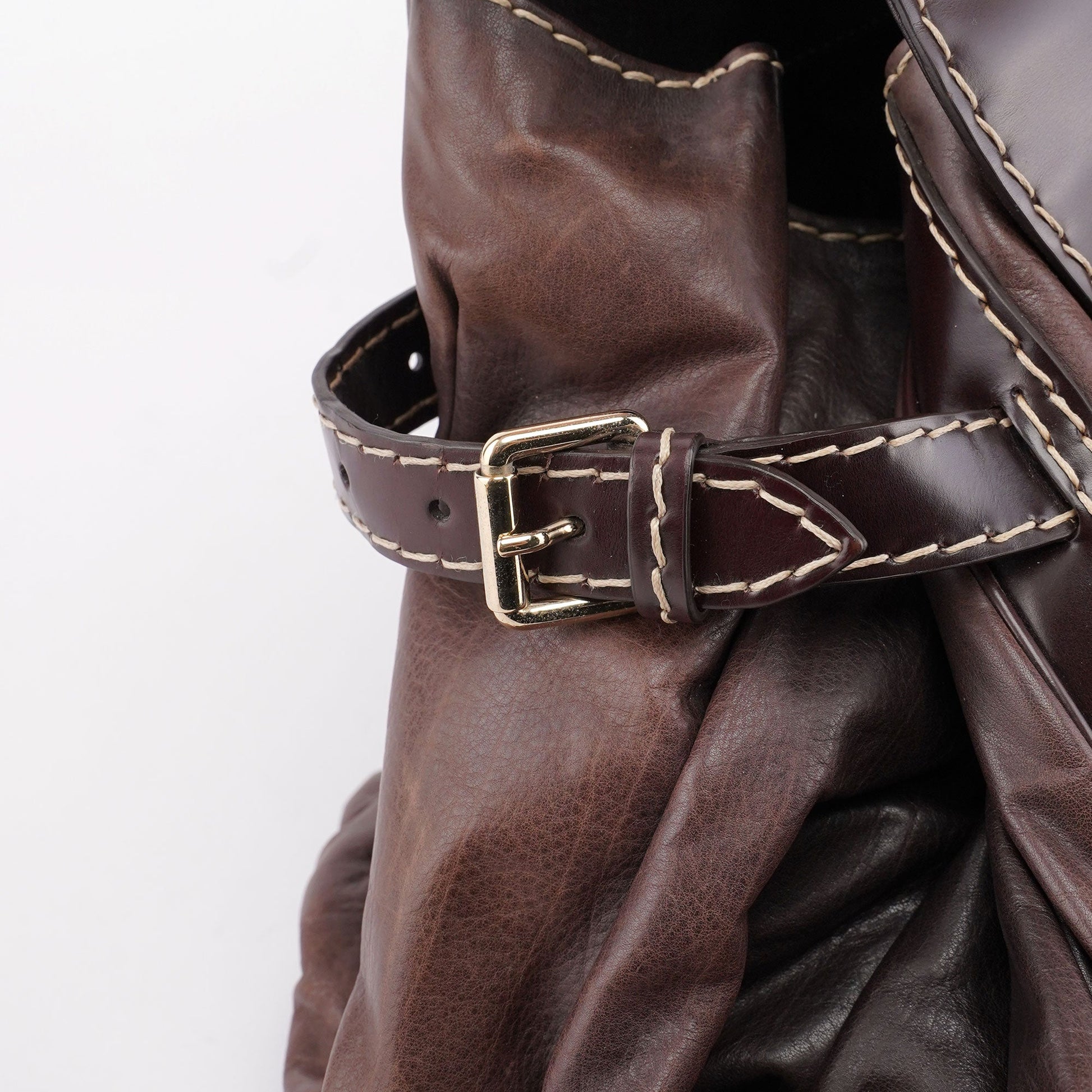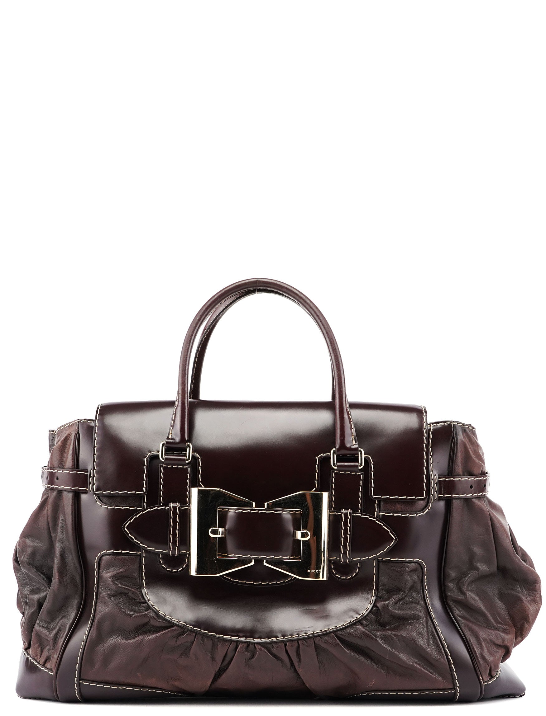 Handcrafted from two kinds of brown leather, this Gucci handbag by Tom Ford from the early 2000s features gold-tone hardware, contrast white stitching on the darkest brown, and a bow belt closure. The interior is lined in satin with an interior zipper pocket, showcasing timeless elegance.