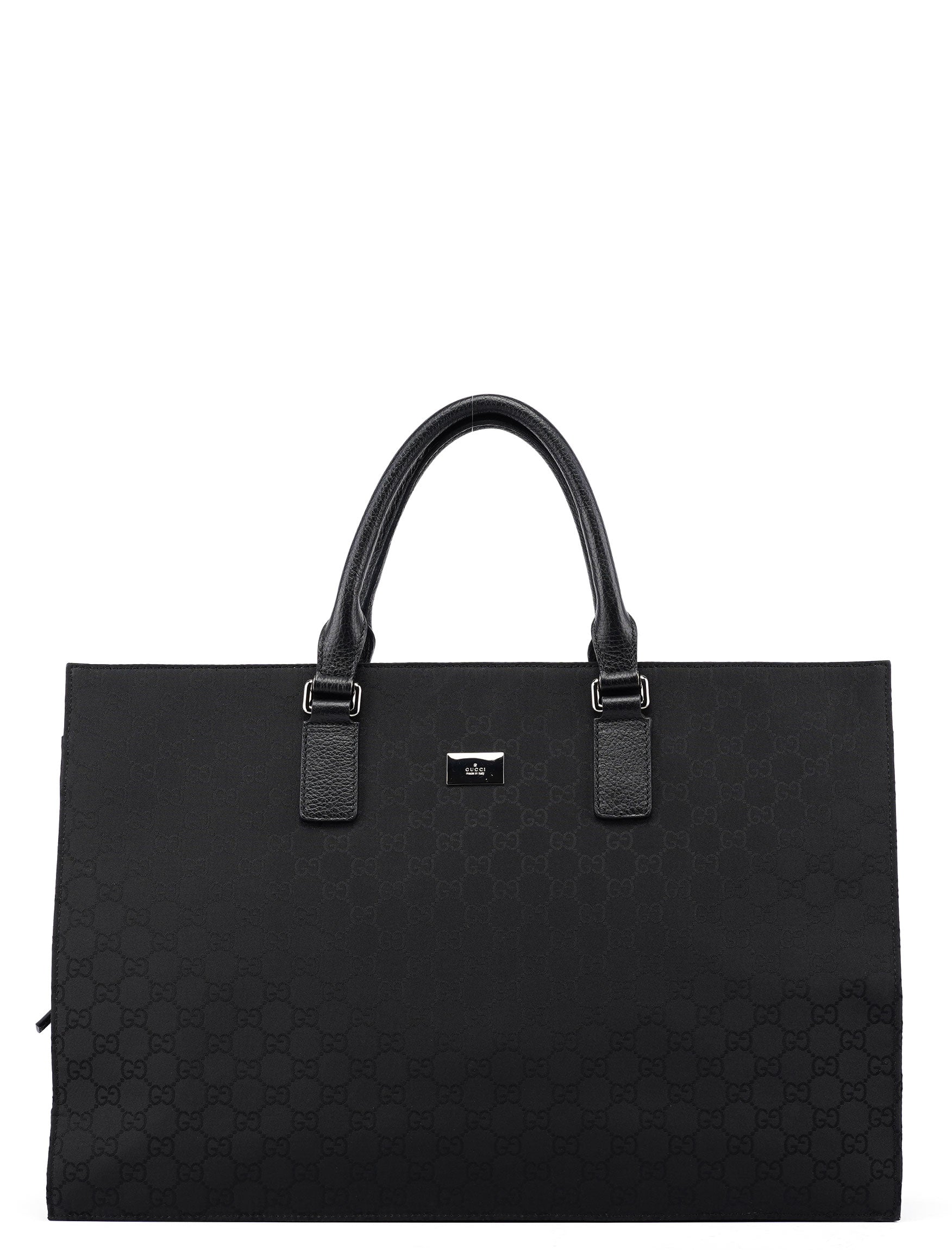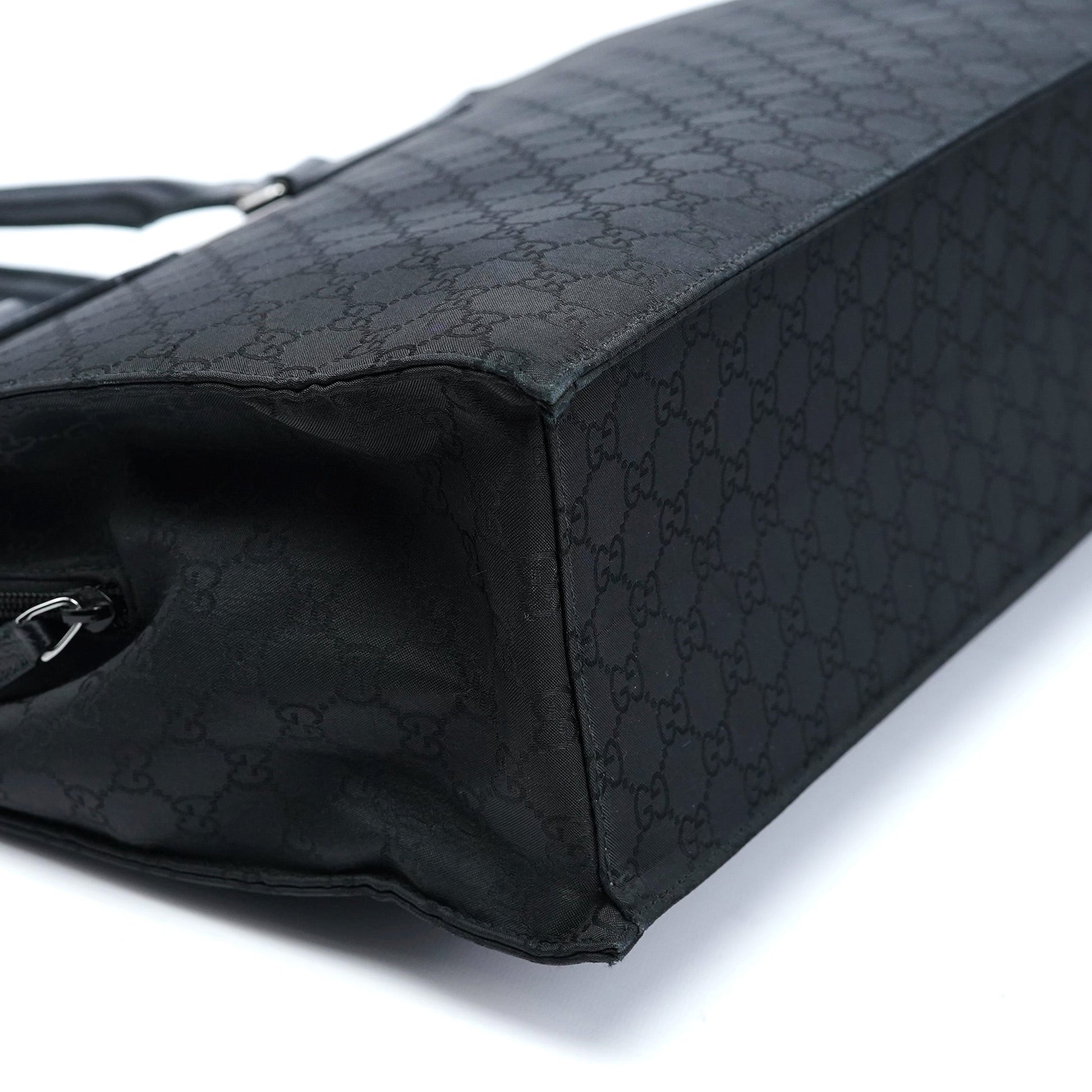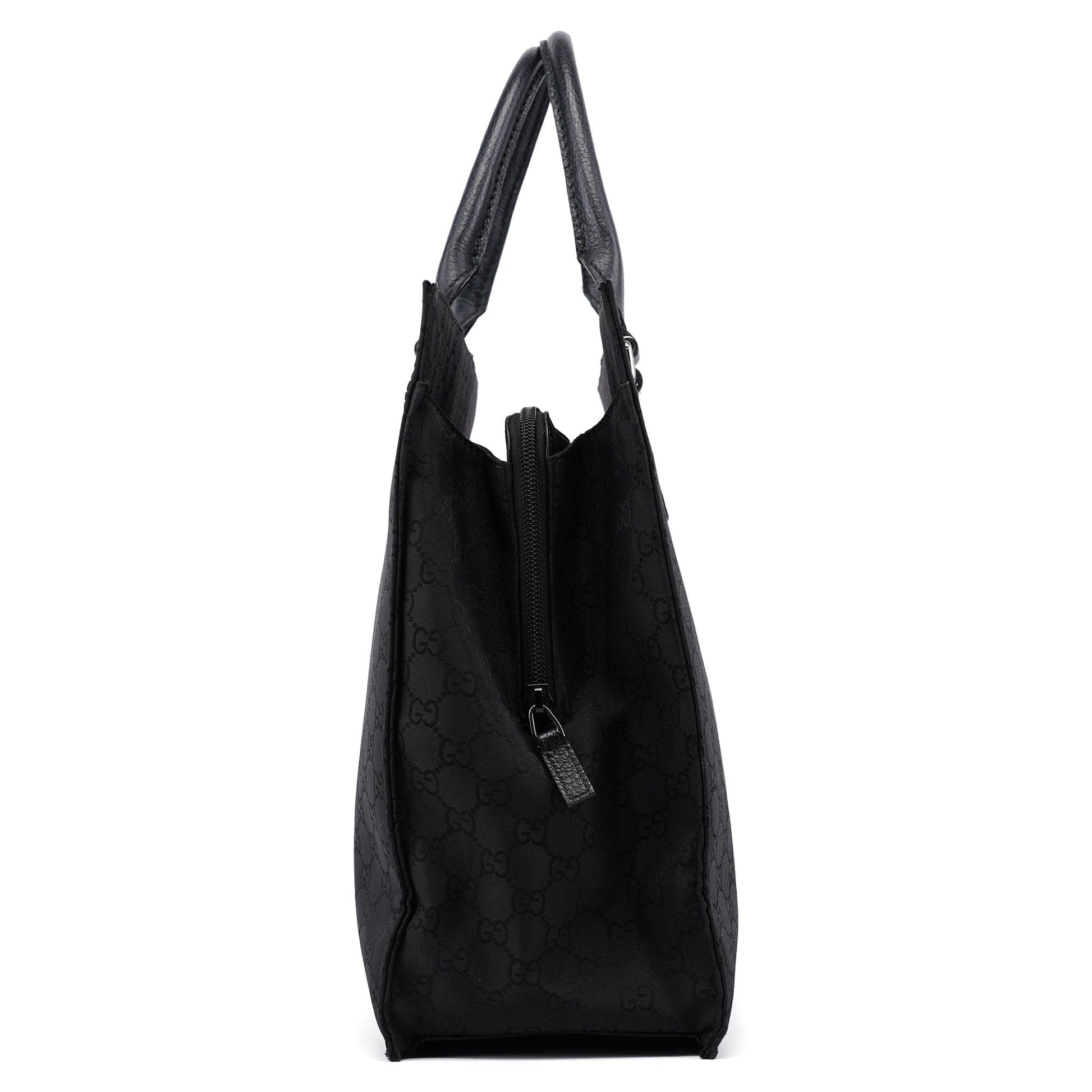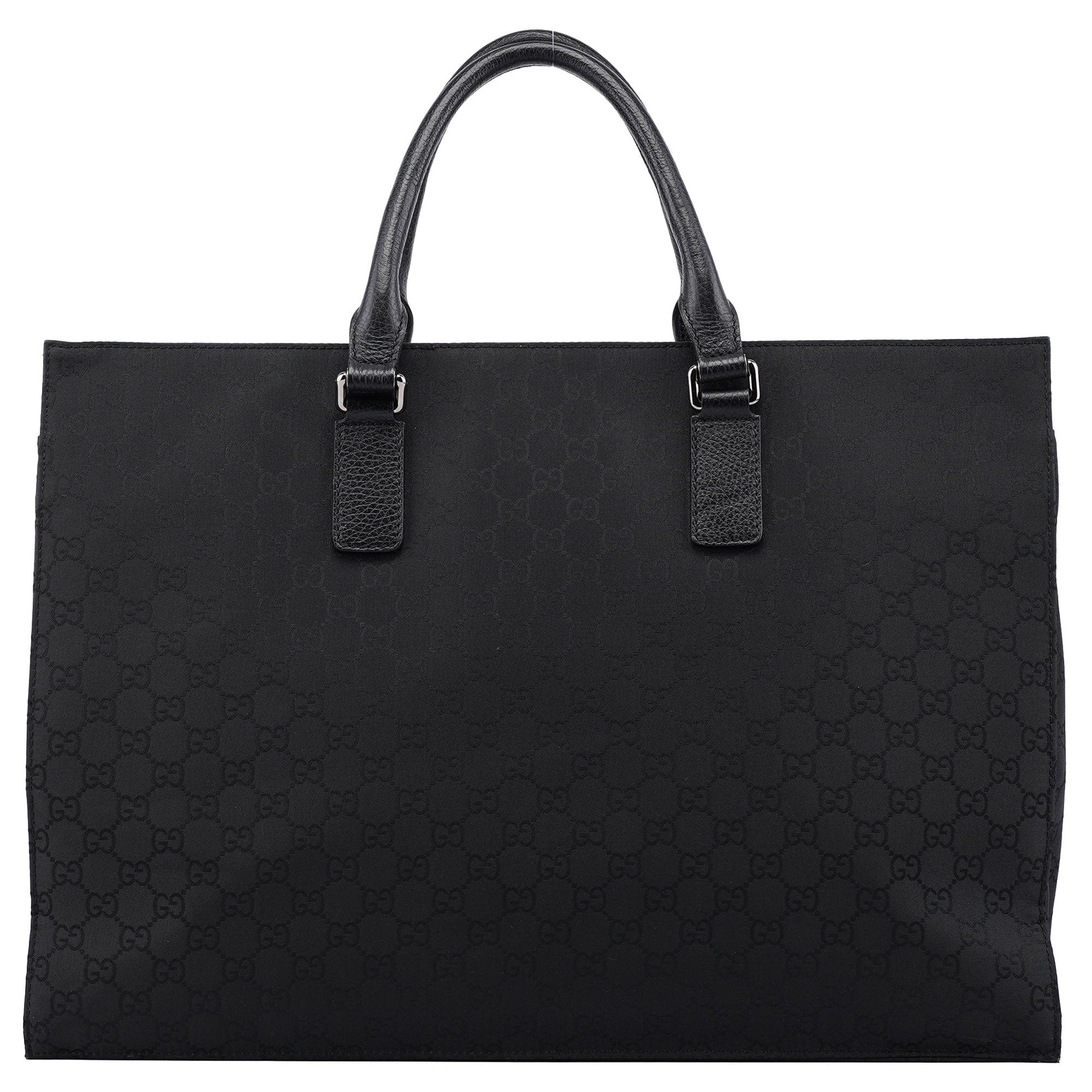 Discover the Gucci GG tote bag, designed by Tom Ford in the late 1990s. Handcrafted in black GG monogram canvas with pebbled leather trim, it features silver-tone hardware engraved with the Gucci logo. The bag offers three satin-lined interior compartments, a pocket for organization, and a Gucci logo plate at the front for a signature finish.