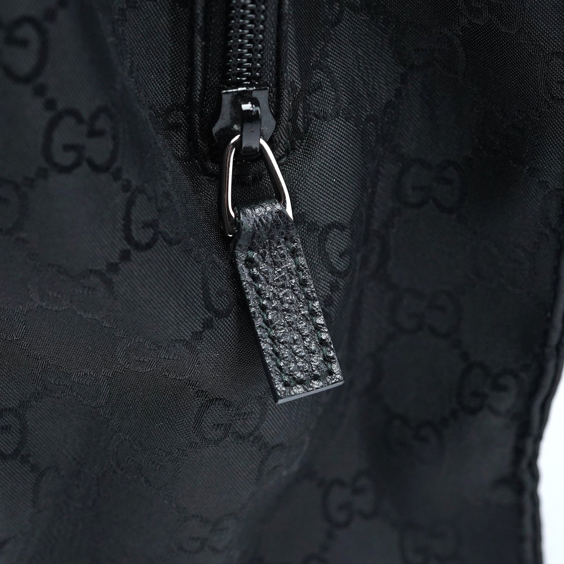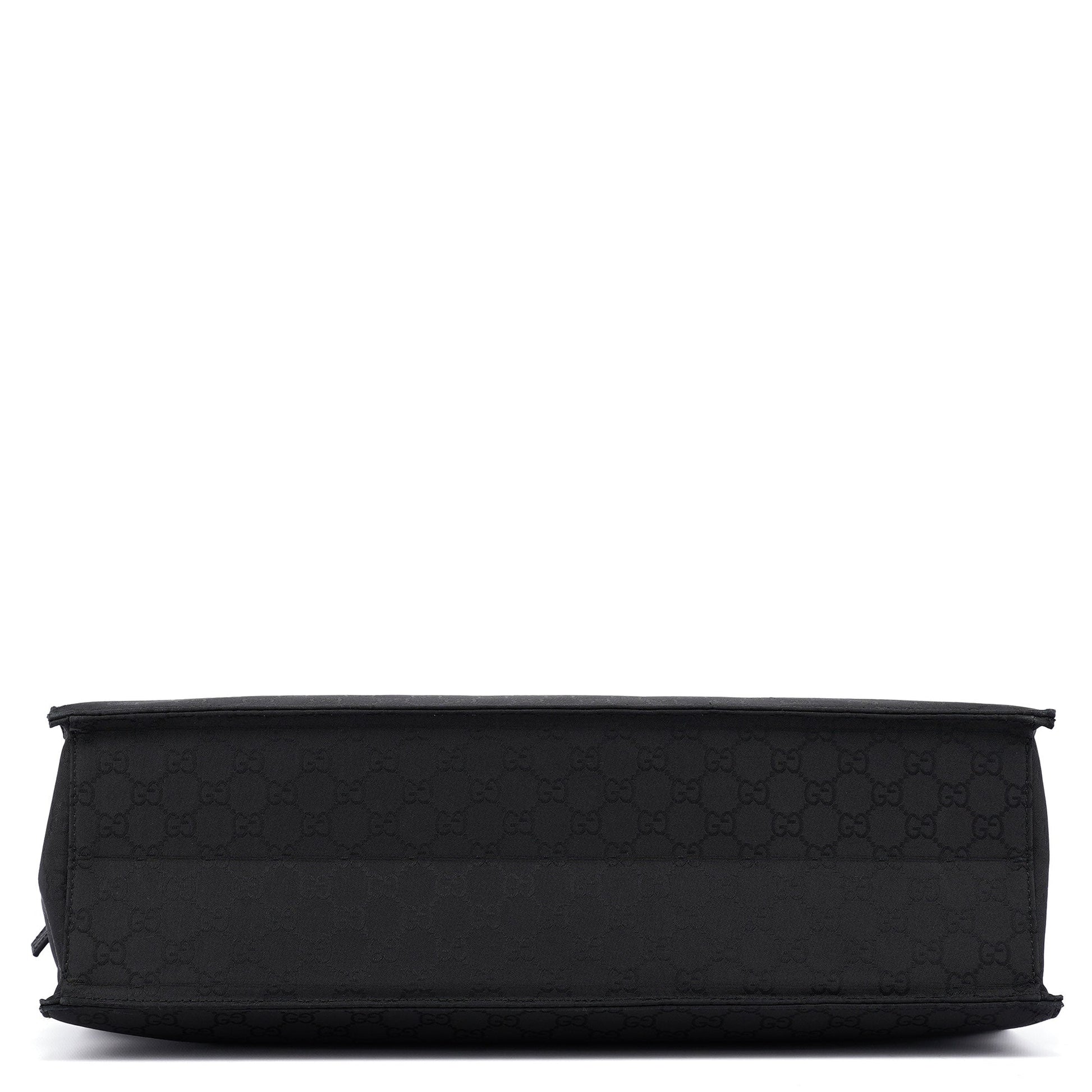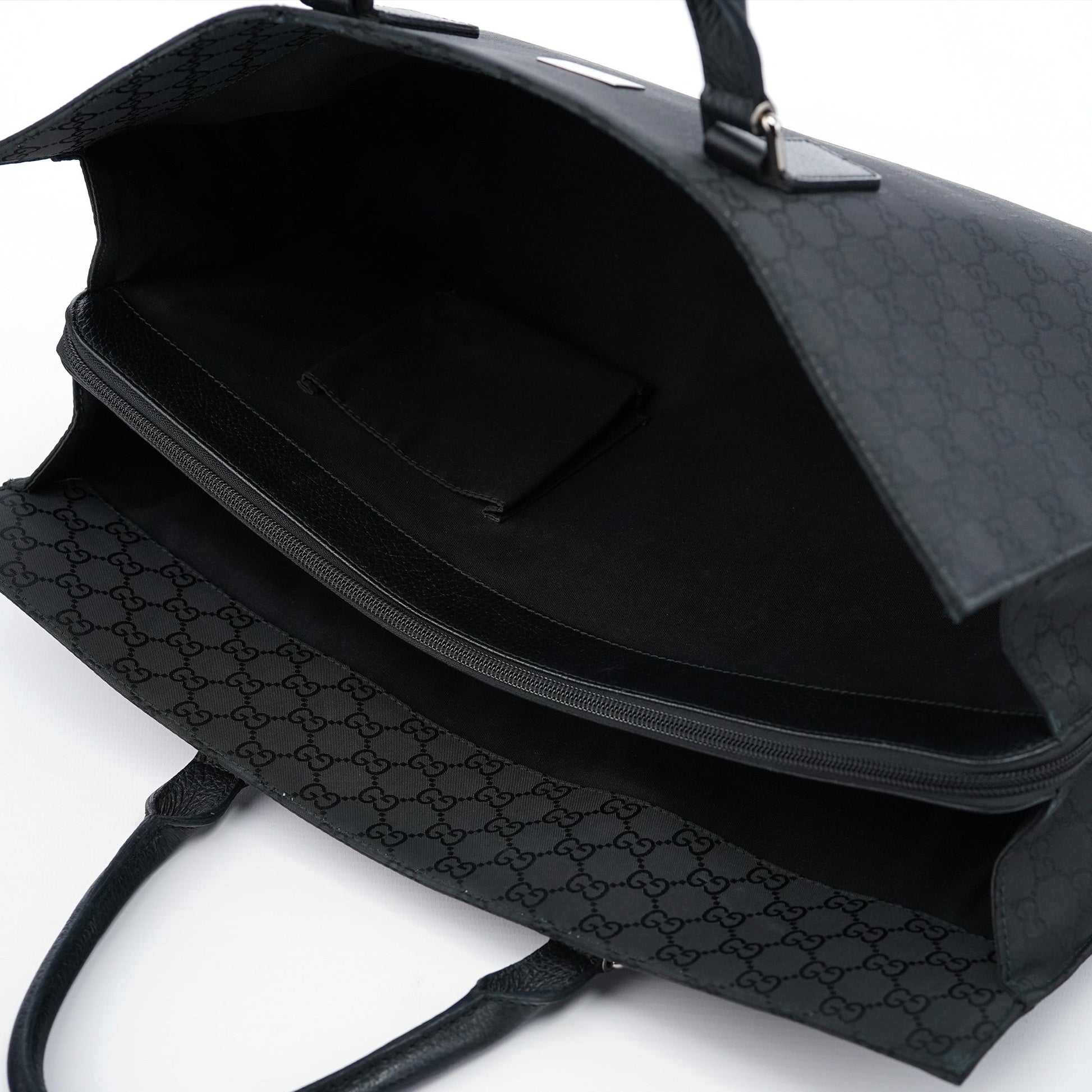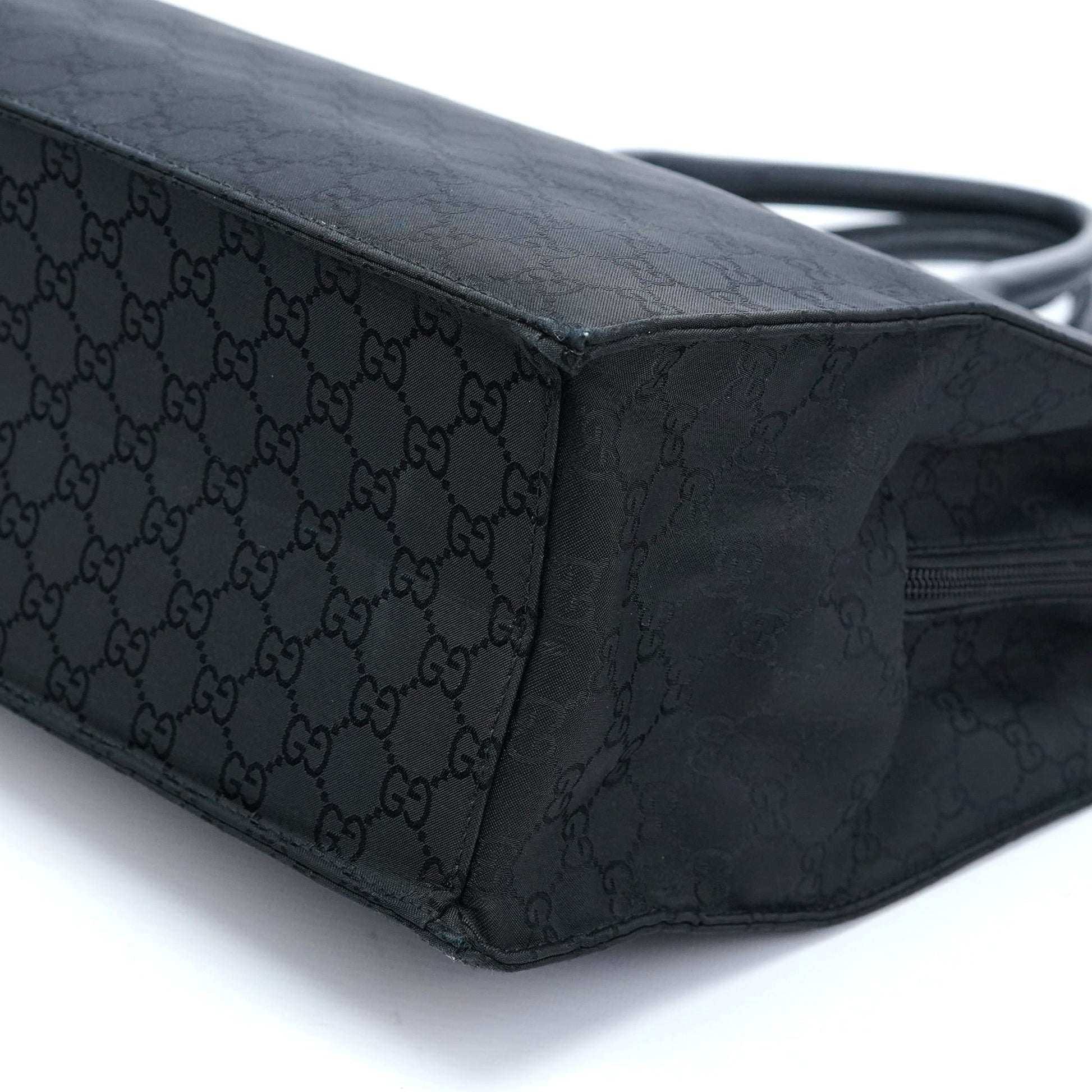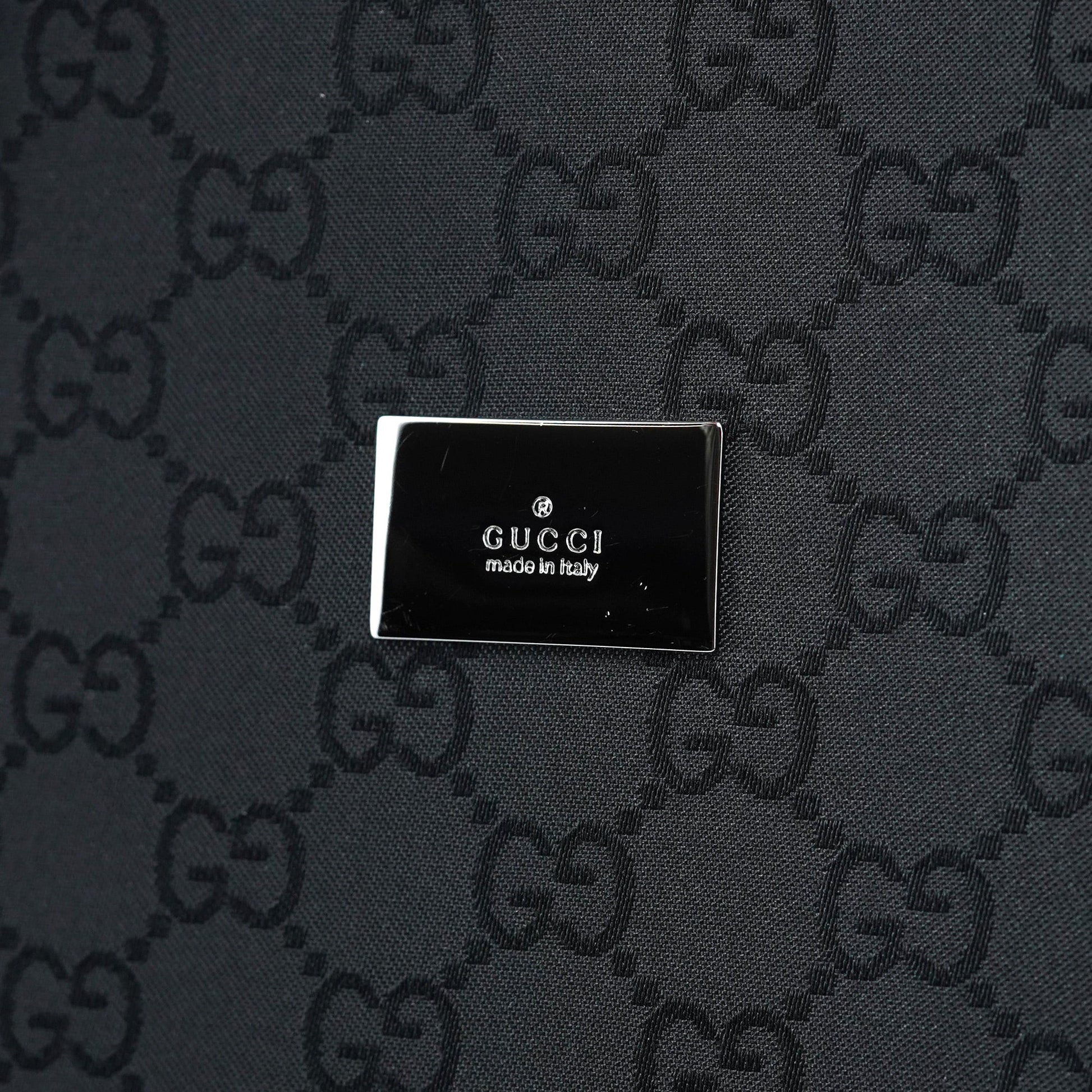 Discover the Gucci GG tote bag, designed by Tom Ford in the late 1990s. Handcrafted in black GG monogram canvas with pebbled leather trim, it features silver-tone hardware engraved with the Gucci logo. The bag offers three satin-lined interior compartments, a pocket for organization, and a Gucci logo plate at the front for a signature finish.