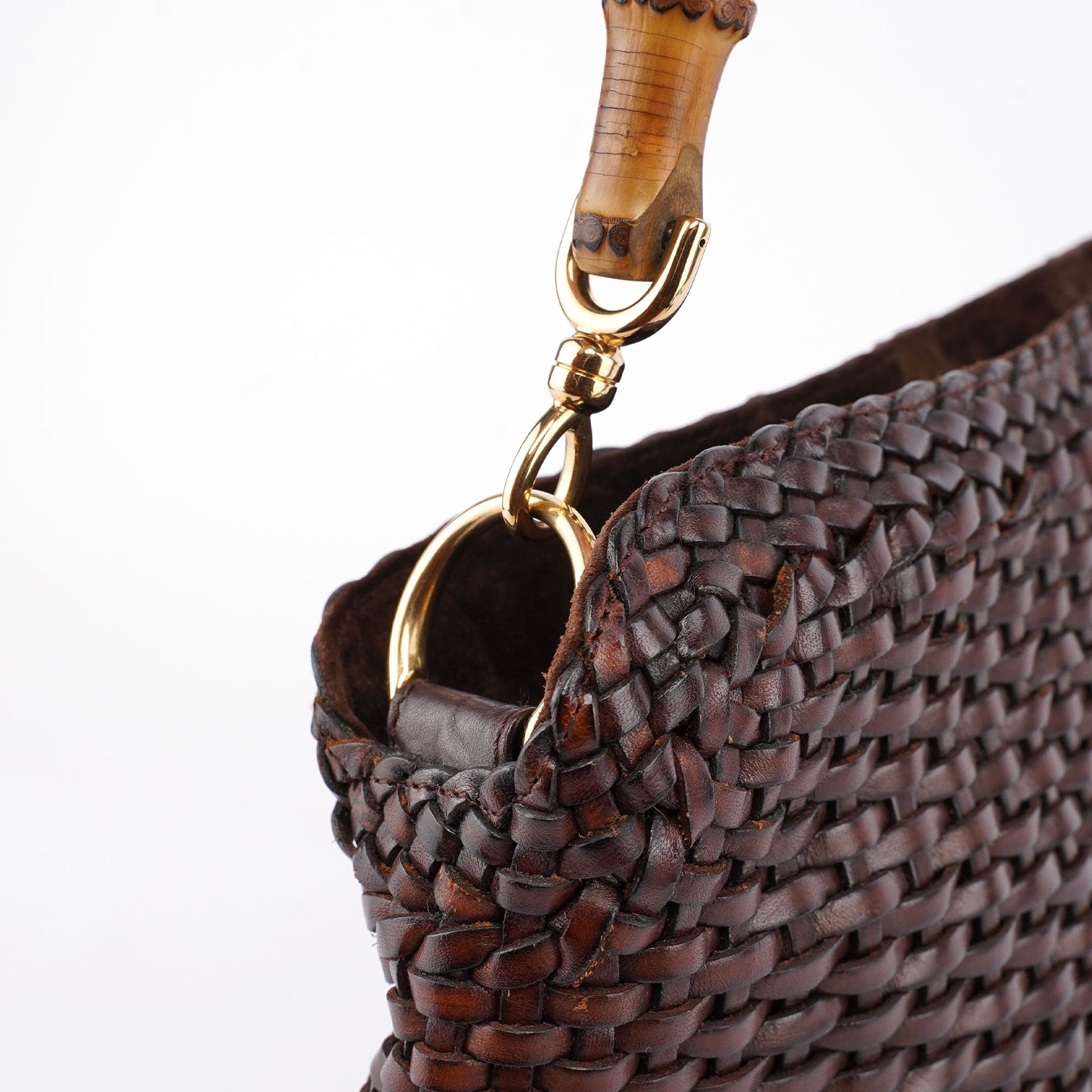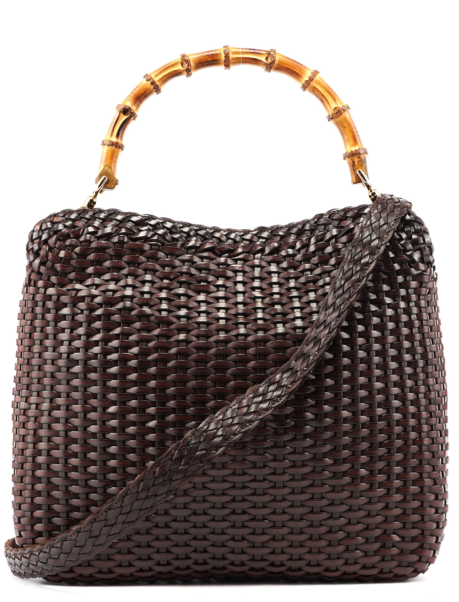 Designed by Tom Ford for the 1996 collection, this Bamboo 2-Way bag is a testament to artisanal craftsmanship, handwoven in brown leather. It features a bamboo handle and gold-tone hardware, complemented by a magnetic closure. A detachable leather strap offers versatile styling options. The interior, elegantly lined with suede, includes an interior zipper pocket.