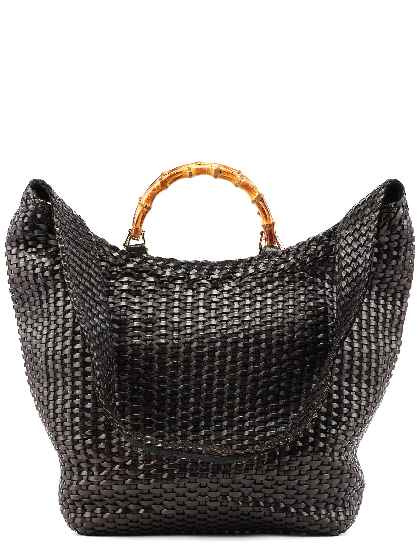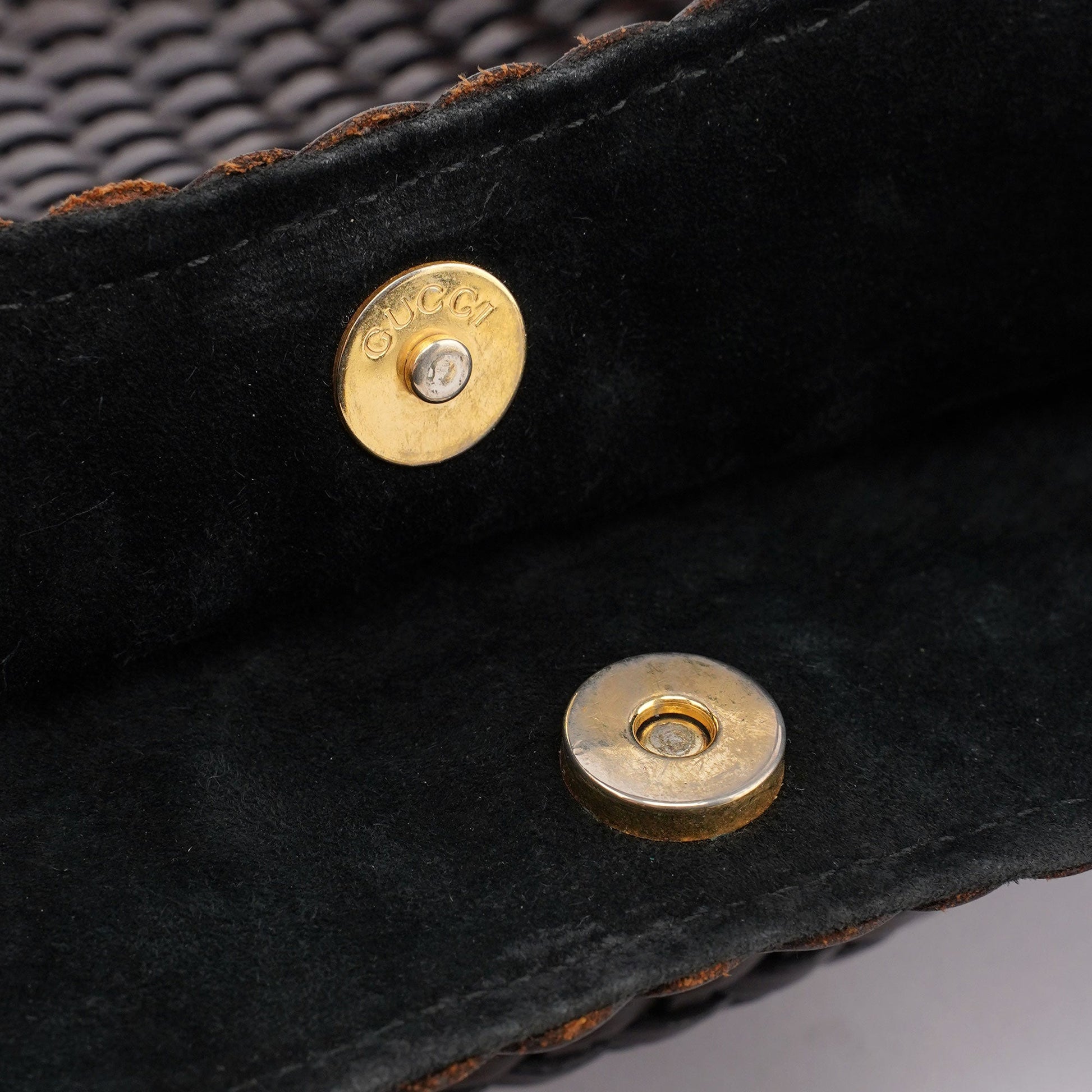 Designed by Tom Ford in 1996, this Bamboo 2-way bag is a testament to artisanal craftsmanship, handwoven in rich brown leather. It features two bamboo handles and gold-tone hardware, complemented by a magnetic closure. A leather shoulder strap offers versatile options. The interior, lined with suede, includes an interior zipper pocket.