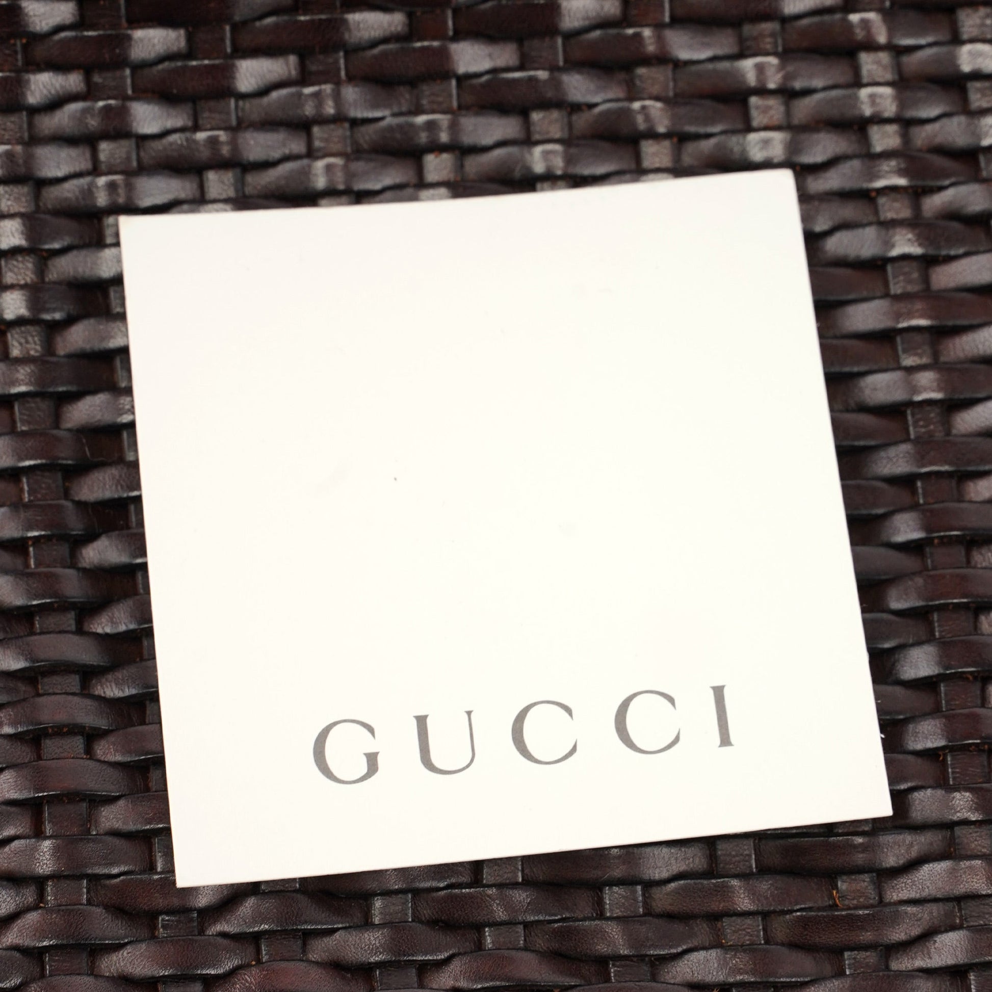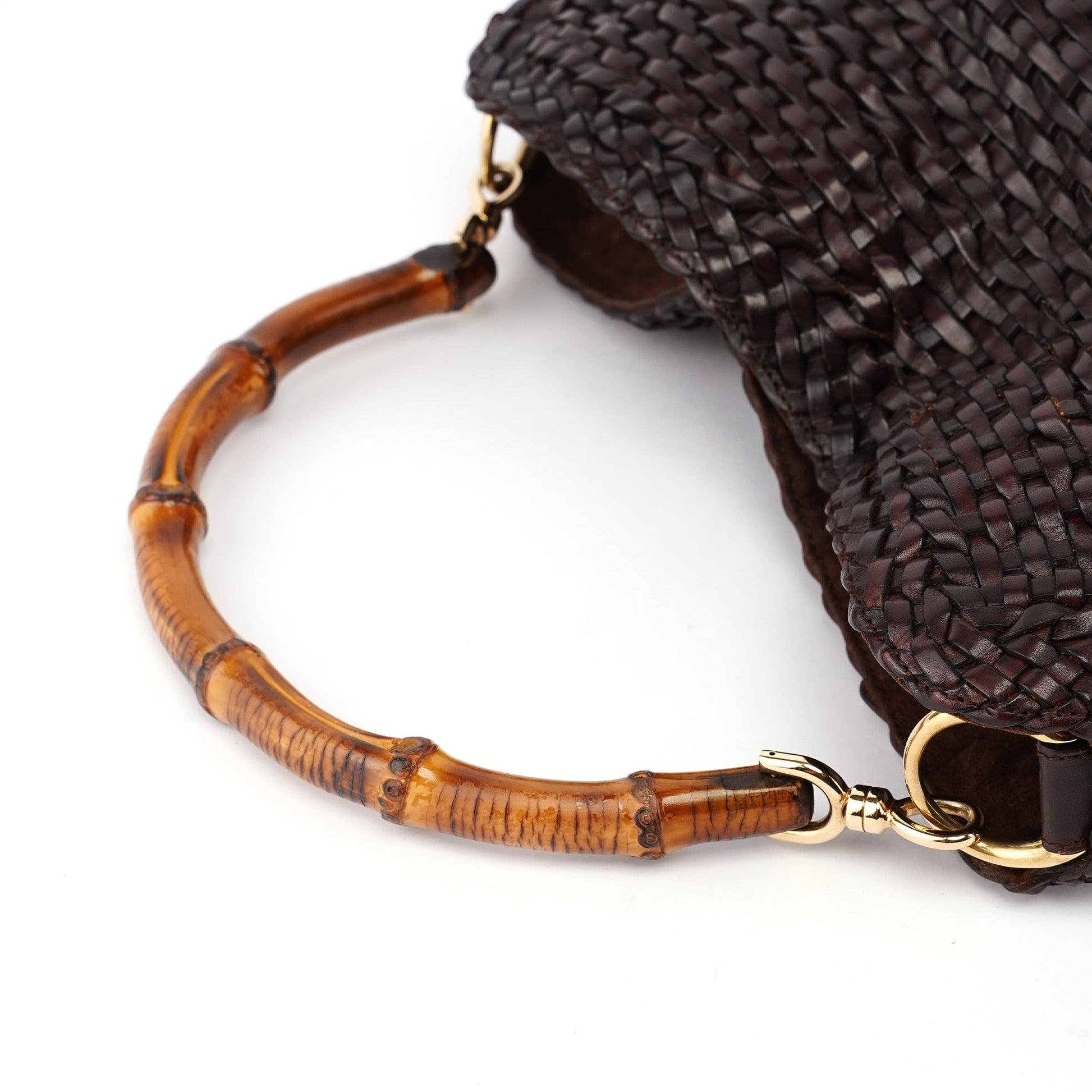 Discover the allure of the brown Gucci woven bag, a 1996 creation by Tom Ford. This exquisite accessory features a bamboo handle, gold-tone hardware, and a detachable shoulder strap for versatile styling. Its magnetic closure opens to a suede-lined interior with a zipper pocket, blending functionality with Tom Ford's iconic design ethos.