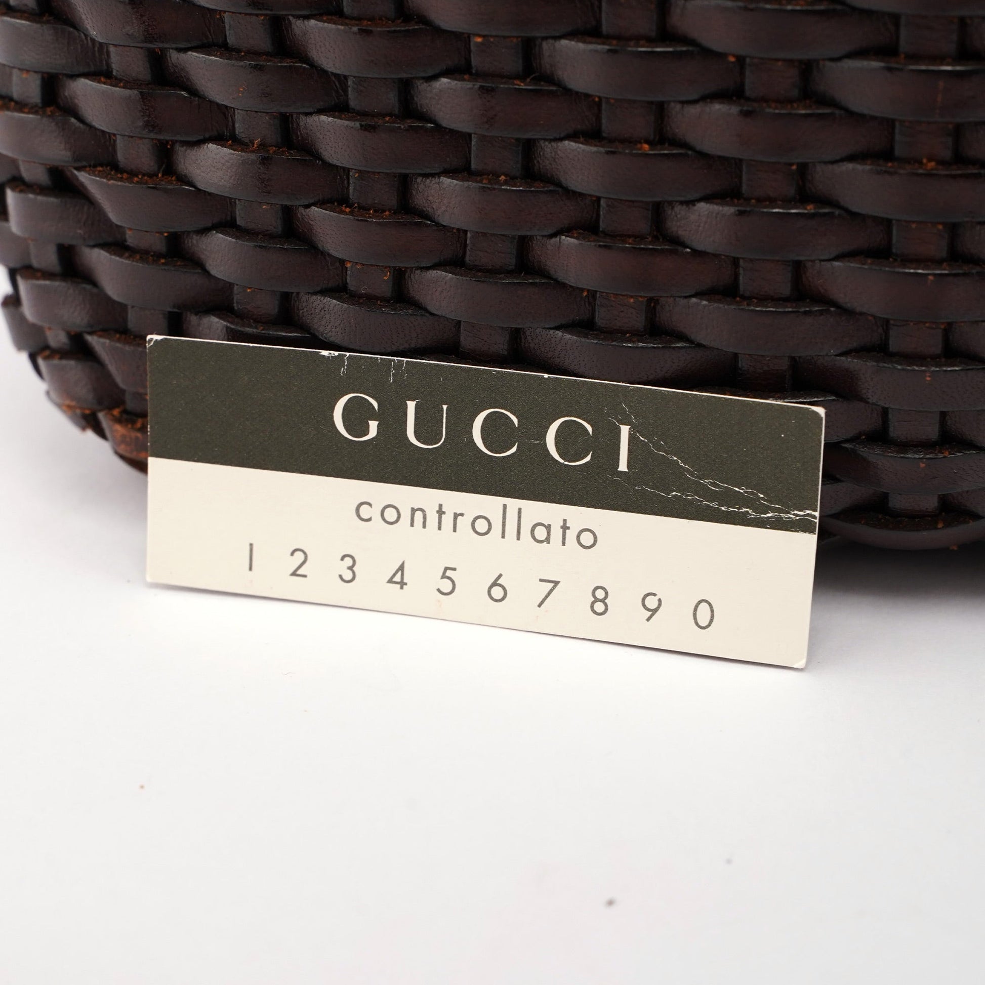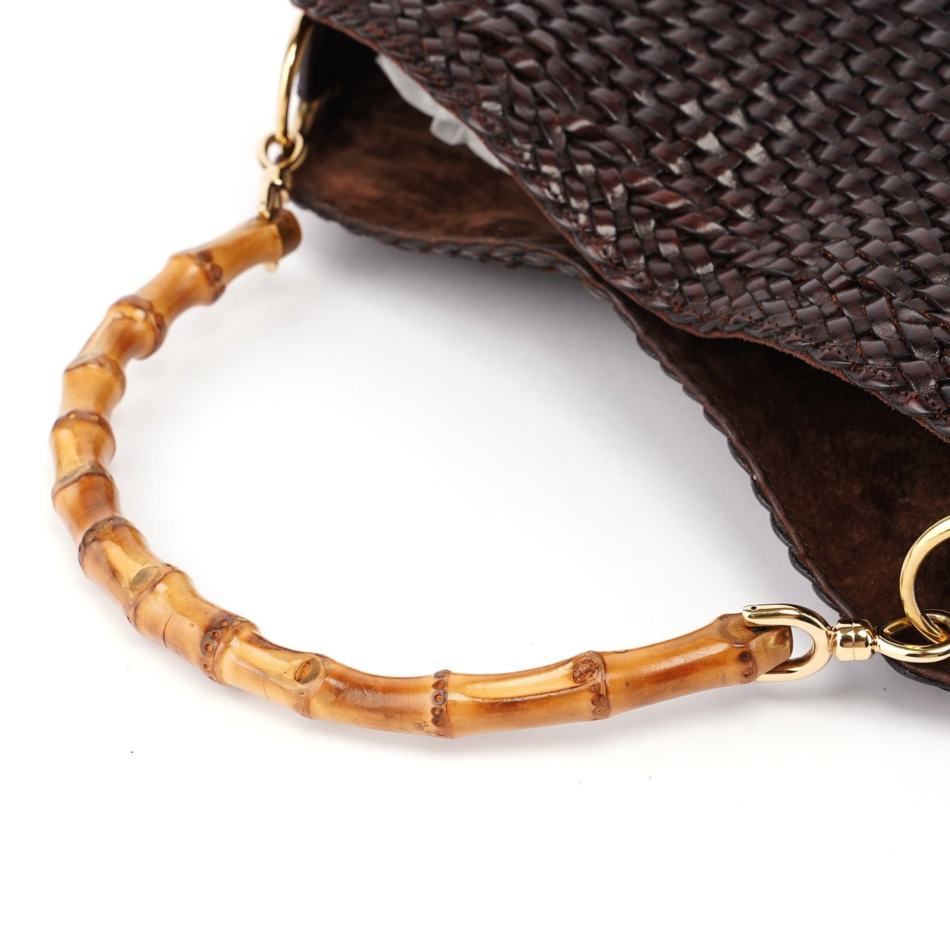 Designed by Tom Ford for the 1996 collection, this Bamboo 2-Way bag is handwoven in brown leather. It features a bamboo handle and gold-tone hardware, complemented by a magnetic closure and adetachable leather strap. The interior, elegantly lined with suede, includes an interior zipper pocket.