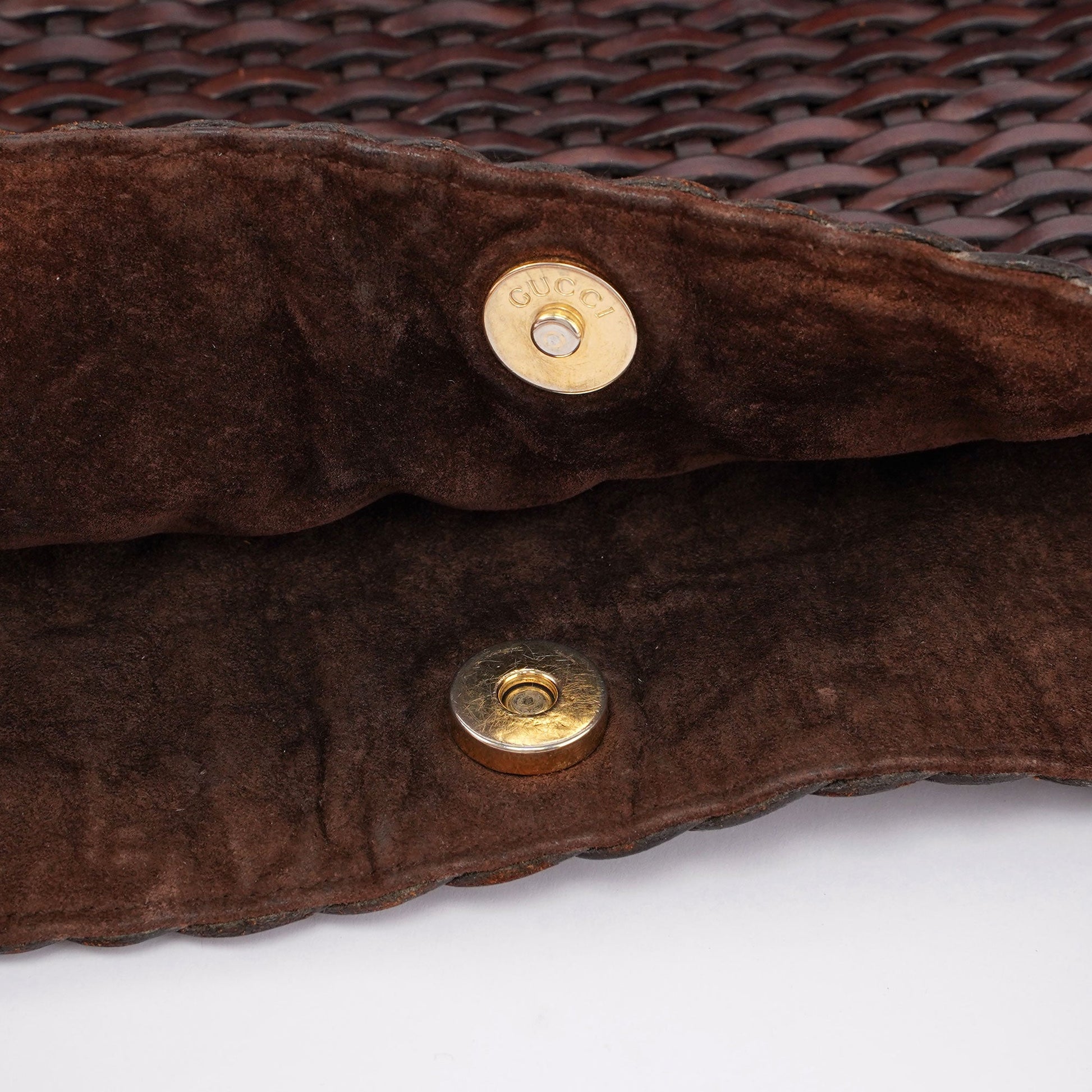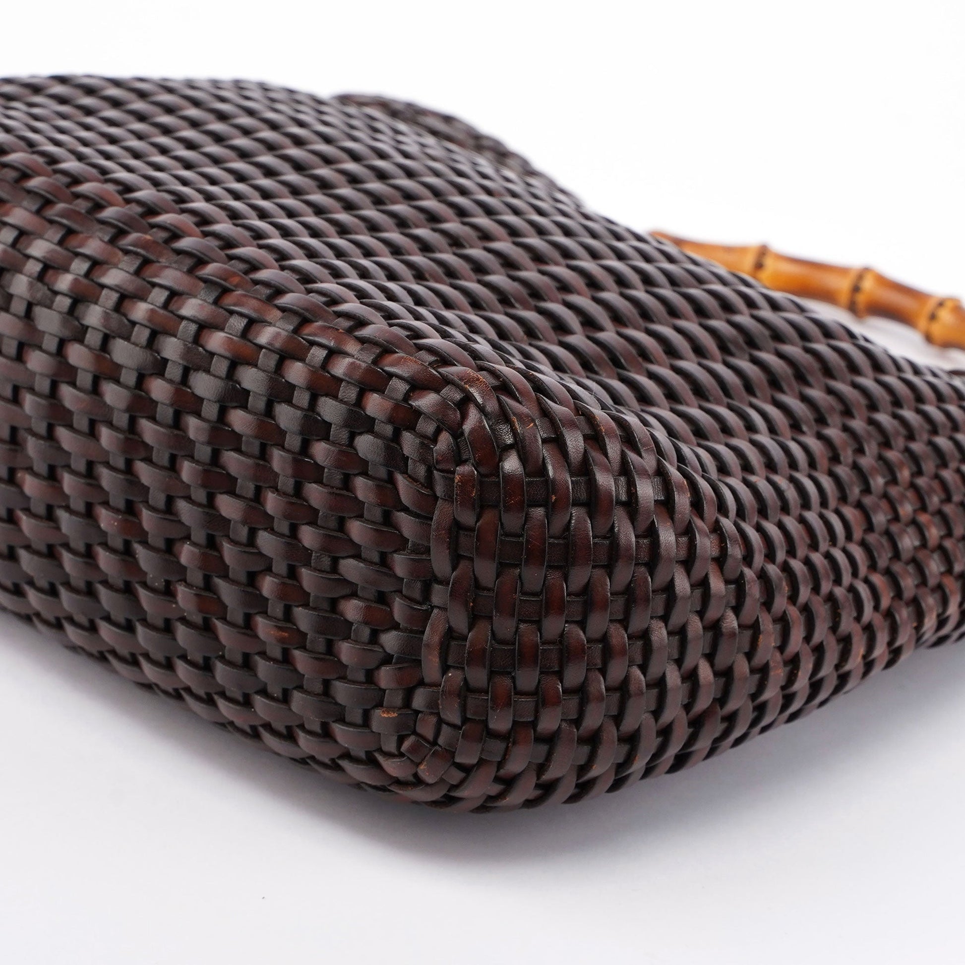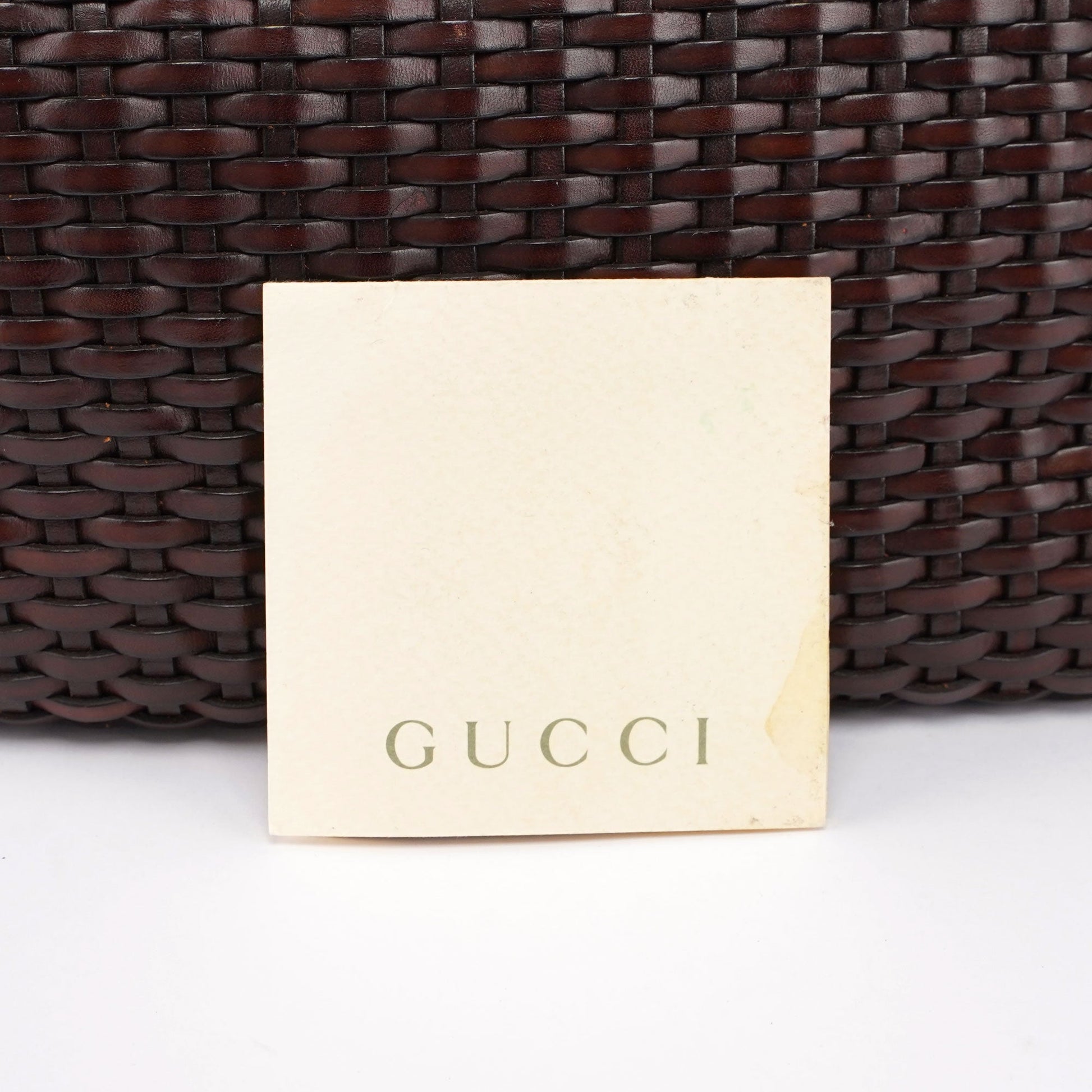 Designed by Tom Ford for Gucci's 1996 collection, this Bamboo bag is a testament to artisanal craftsmanship, handwoven in rich brown leather. It features a bamboo handle and luxurious gold-tone hardware, complemented by a magnetic closure for secure storage. The interior, elegantly lined with suede, includes an interior zipper pocket, blending functionality with Gucci's iconic elegance.