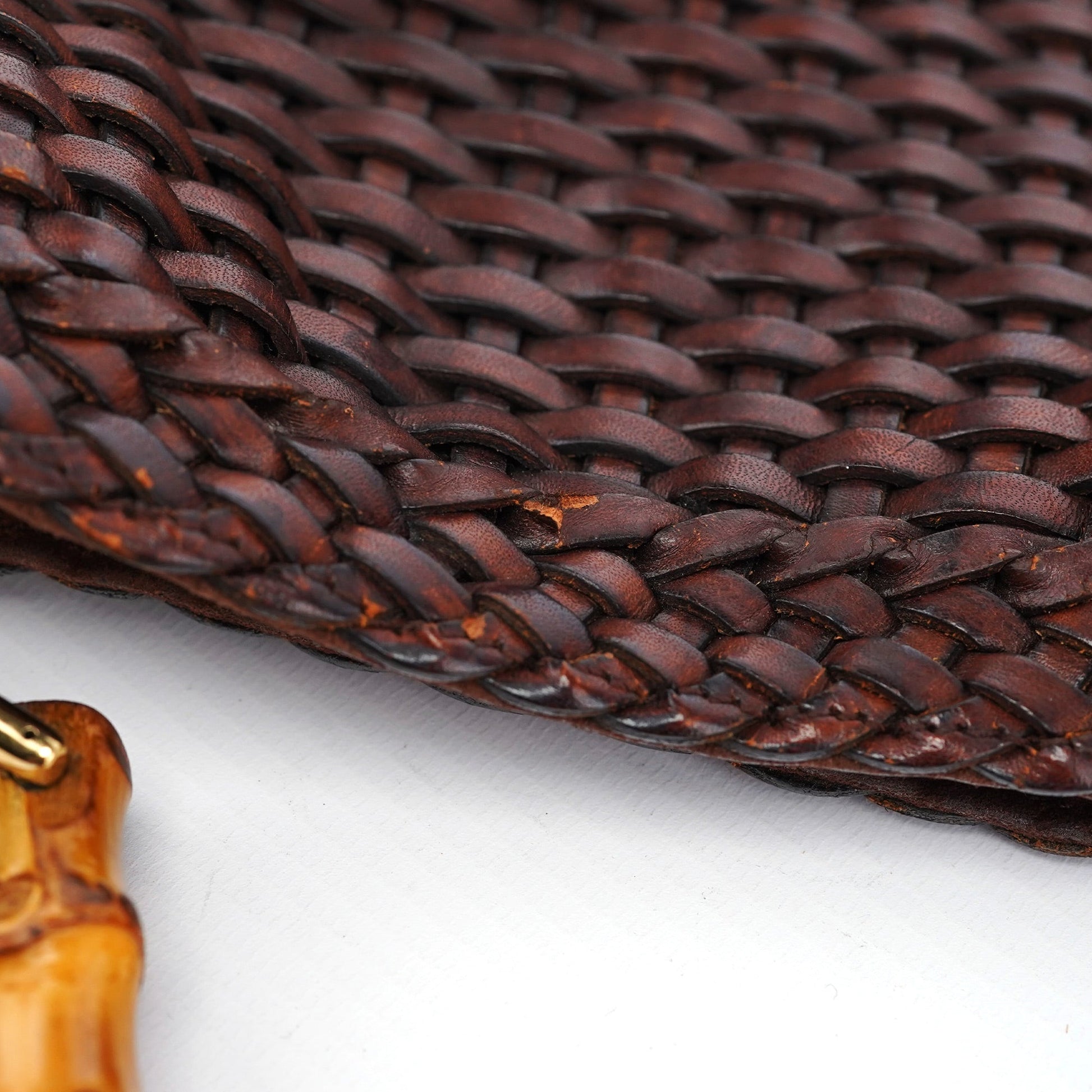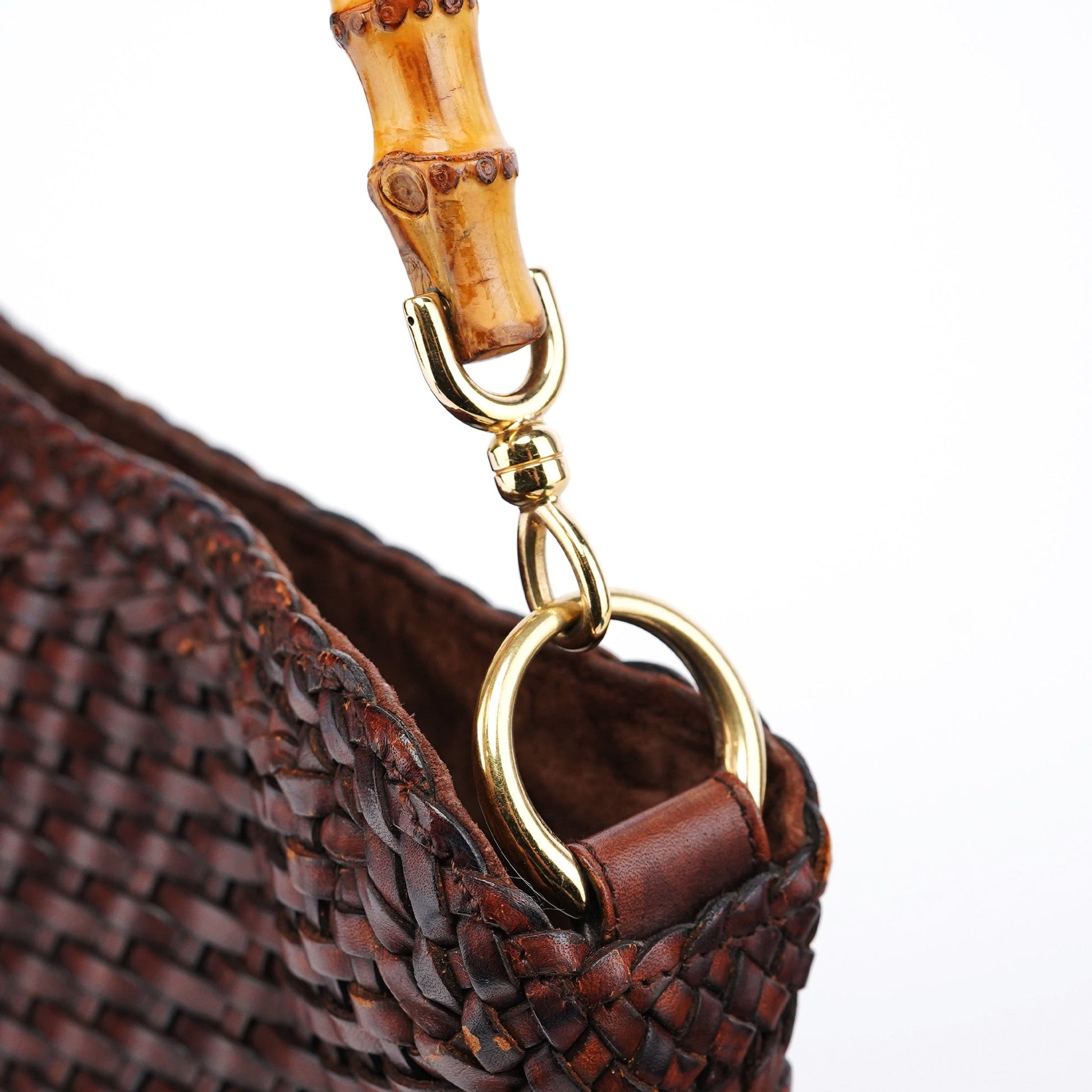 Designed by Tom Ford for Gucci's 1996 collection, this Bamboo bag is a testament to artisanal craftsmanship, handwoven in rich brown leather. It features a bamboo handle and luxurious gold-tone hardware, complemented by a magnetic closure for secure storage. The interior, elegantly lined with suede, includes an interior zipper pocket, blending functionality with Gucci's iconic elegance.