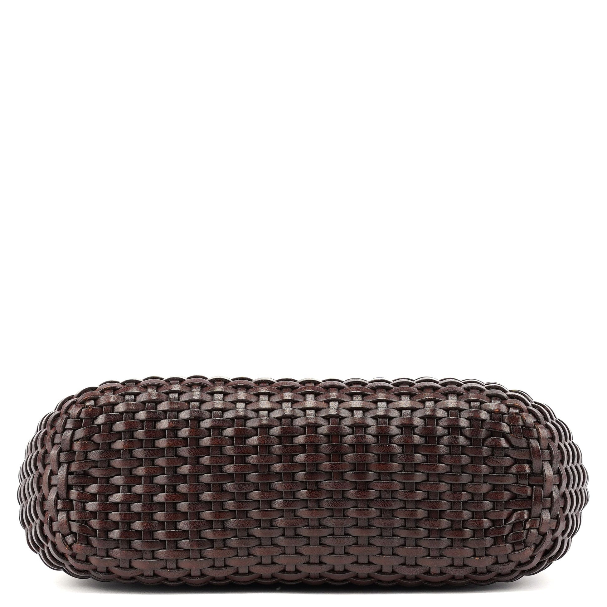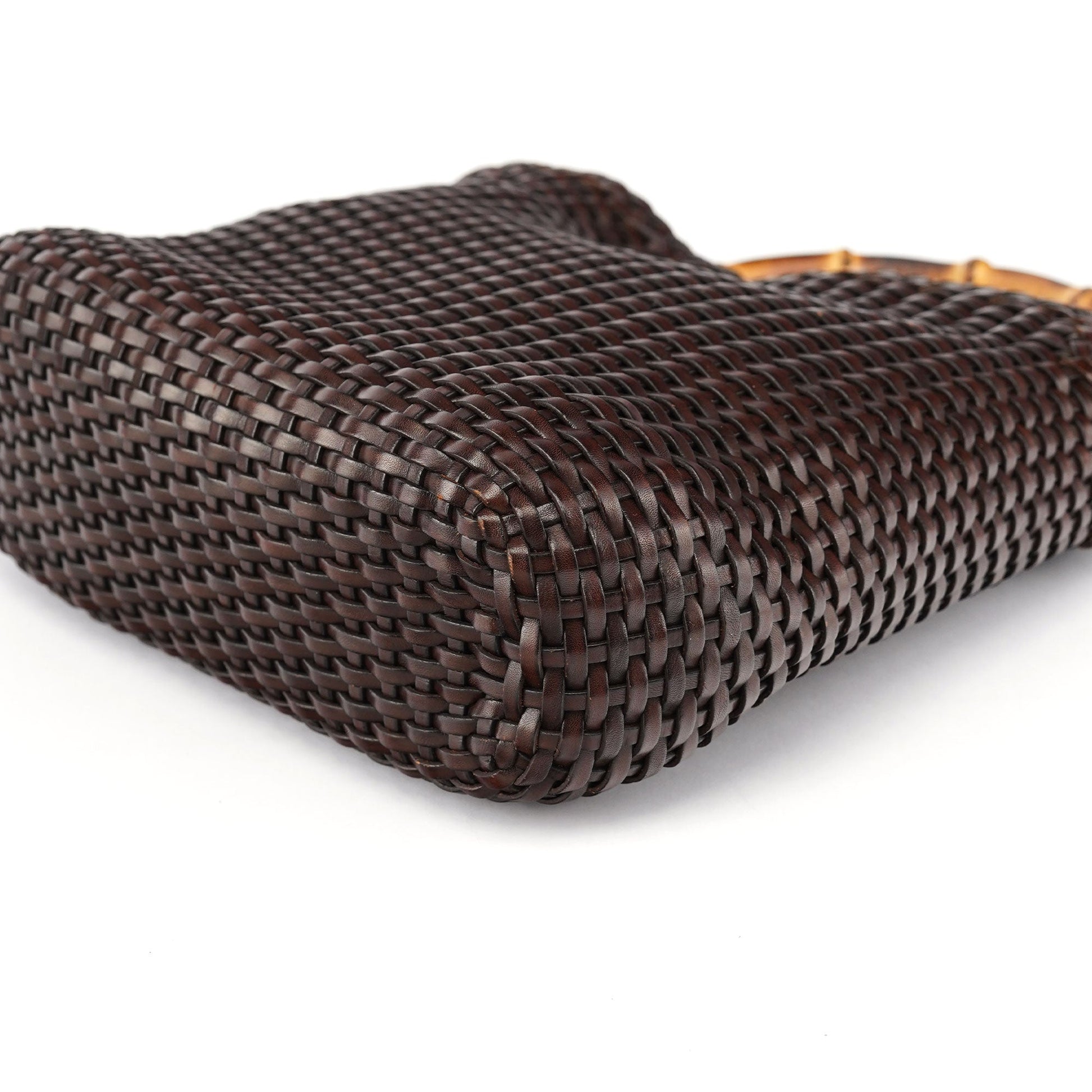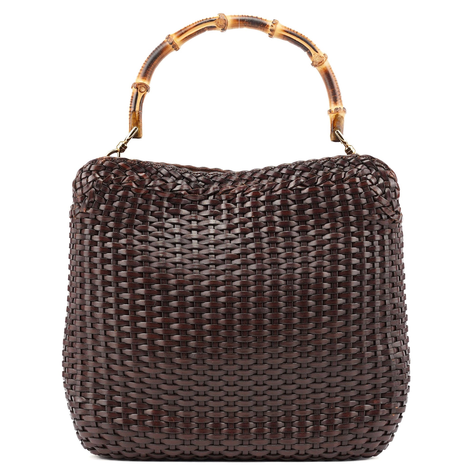 Designed by Tom Ford for Gucci’s 1996 collection, this Bamboo bag is handcrafted from rich brown leather in a woven design, showcasing artisanal craftsmanship. It features a bamboo handle, gold-tone hardware, and a magnetic closure. The suede-lined interior includes a zipper pocket, blending functionality with Gucci’s signature elegance.