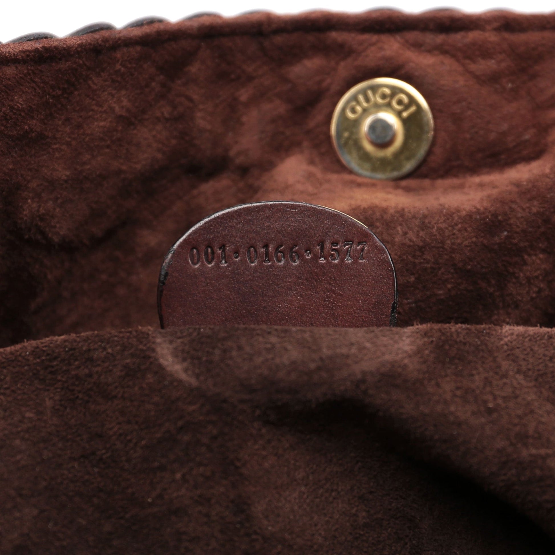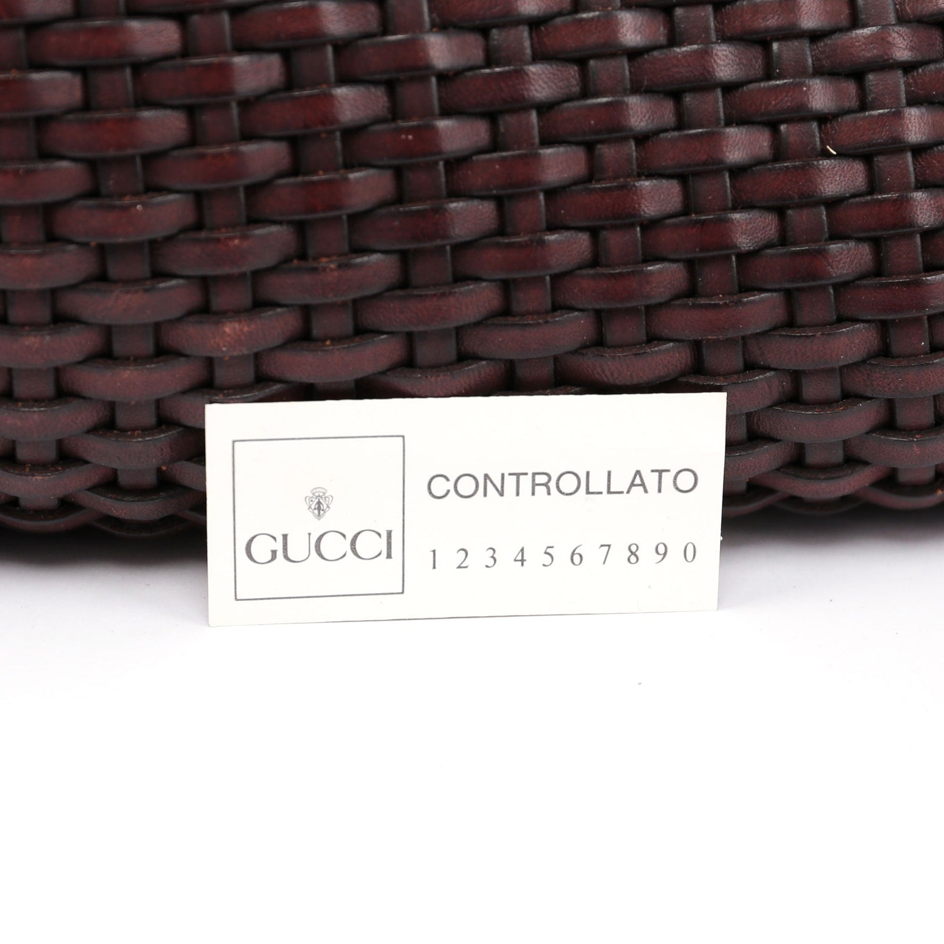 Designed by Tom Ford for Gucci's 1996 collection, this Bamboo 2-Way bag is a testament to artisanal craftsmanship, handwoven in rich brown leather. It features a bamboo handle and luxurious gold-tone hardware, complemented by a magnetic closure for secure storage. A detachable leather handle offers versatile styling options. The interior, elegantly lined with suede, includes an interior zipper pocket, blending functionality with Gucci's iconic elegance.