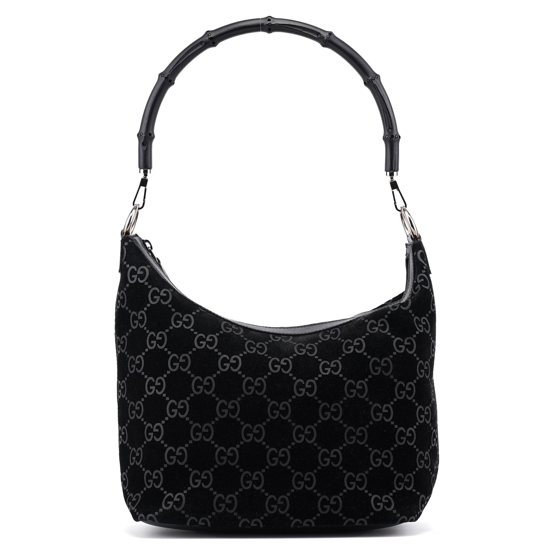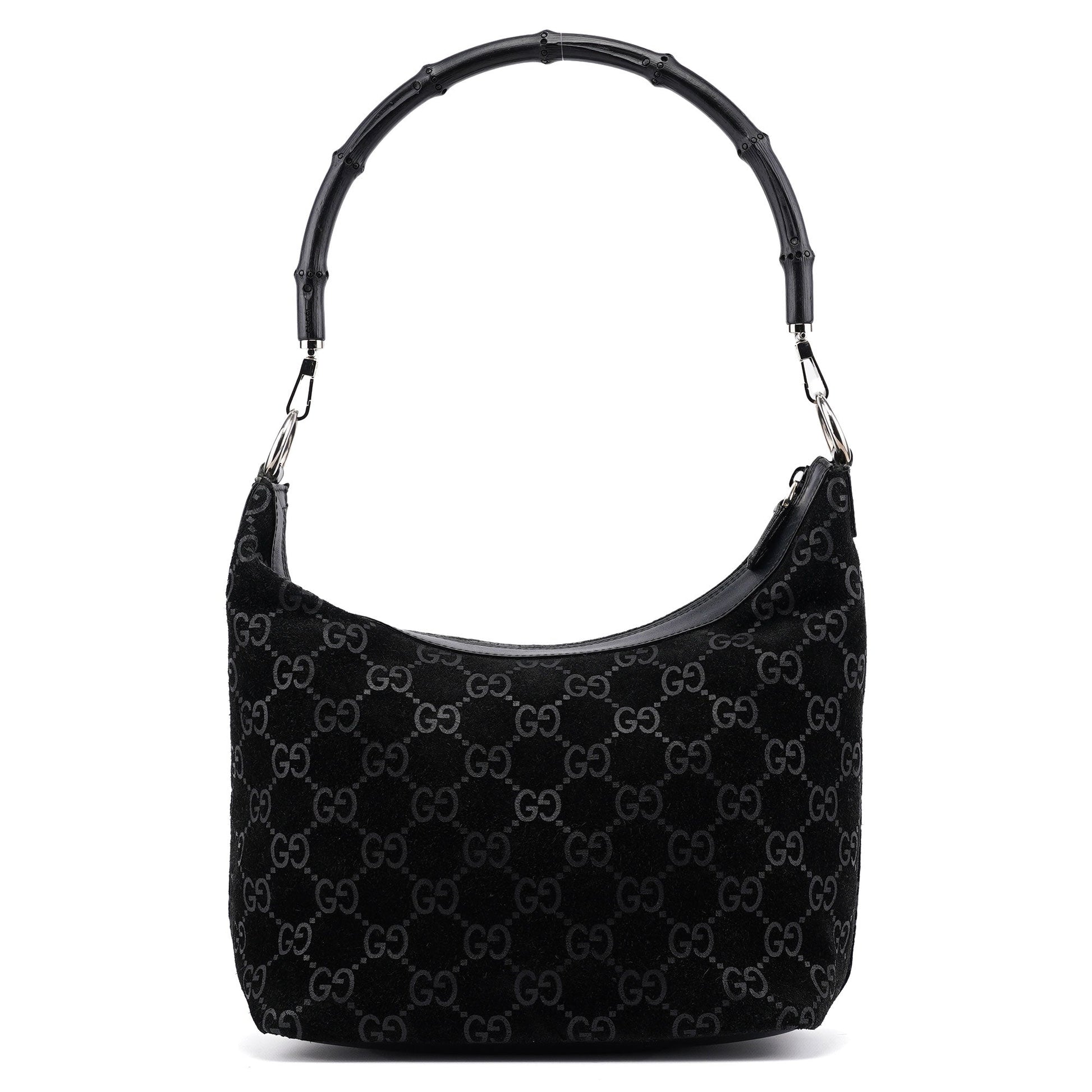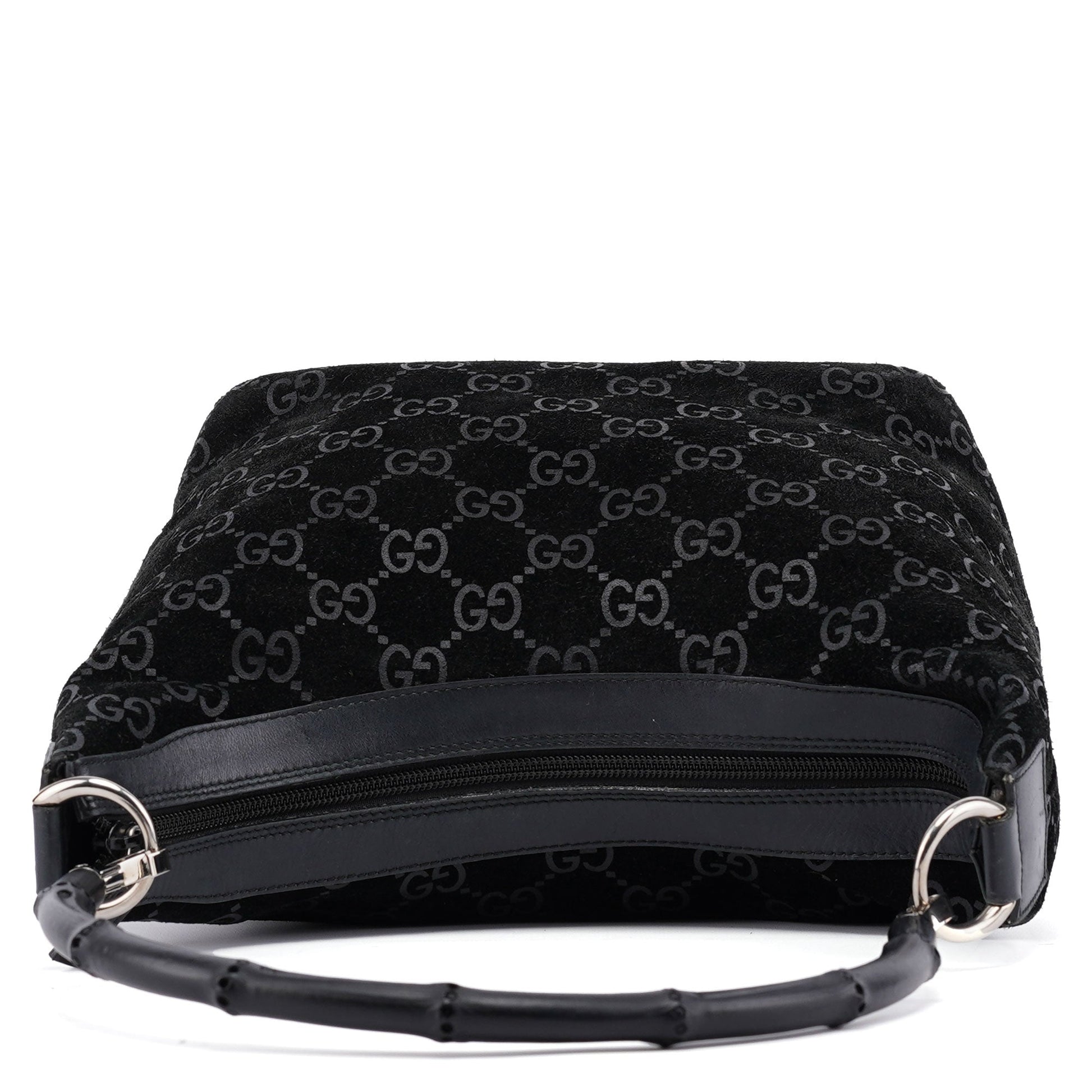 Explore the Gucci GG Bamboo shoulder bag from Tom Ford’s iconic 1997 collection. This luxurious piece is handcrafted from black suede with a stamped GG monogram and accented with silver-tone hardware and calfskin leather trim. It features a classic black bamboo handle engraved with the Gucci logo. Inside, the satin-lined interior includes a zipper pocket, marrying elegance with functionality.