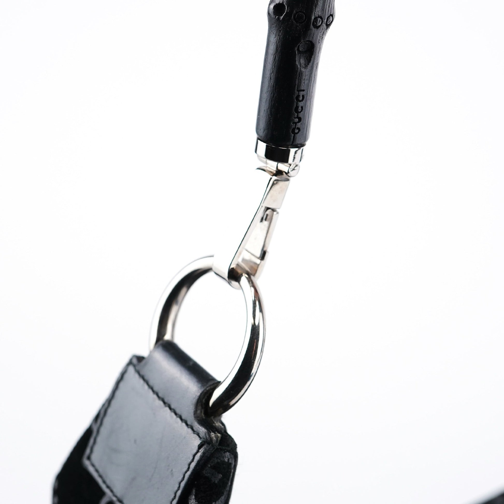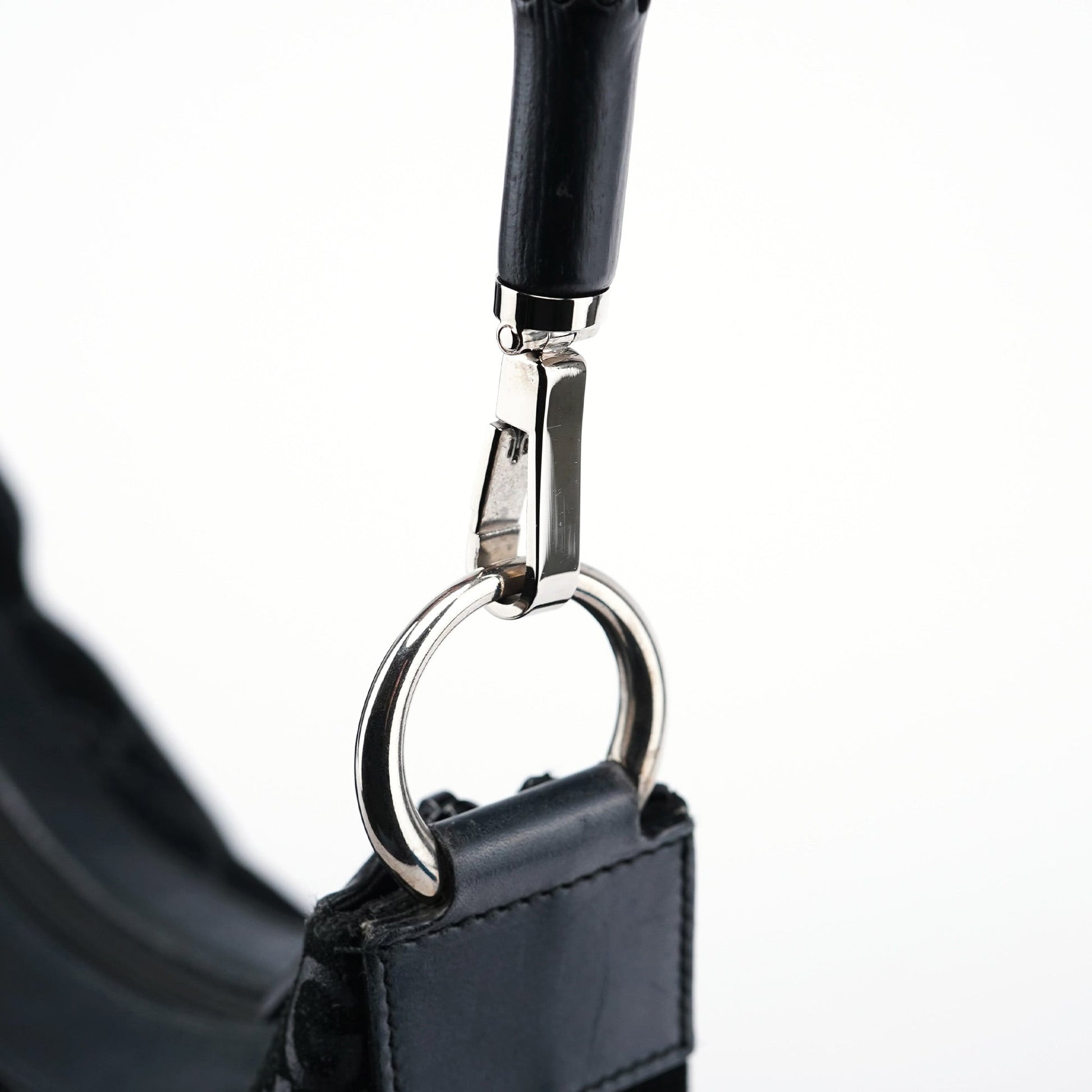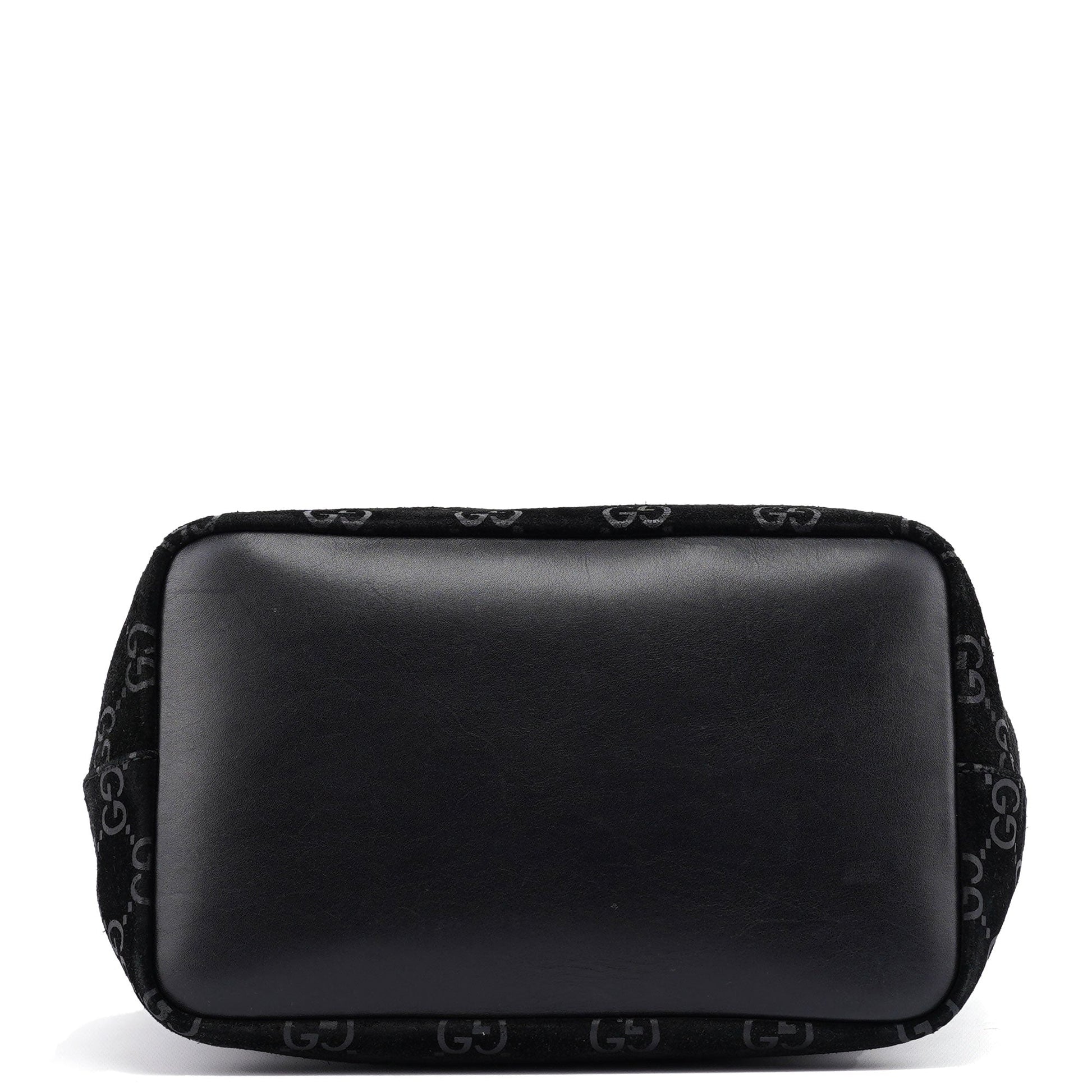 Explore the Gucci GG Bamboo shoulder bag from Tom Ford’s iconic 1997 collection. This luxurious piece is handcrafted from black suede with a stamped GG monogram and accented with silver-tone hardware and calfskin leather trim. It features a classic black bamboo handle engraved with the Gucci logo. Inside, the satin-lined interior includes a zipper pocket, marrying elegance with functionality.